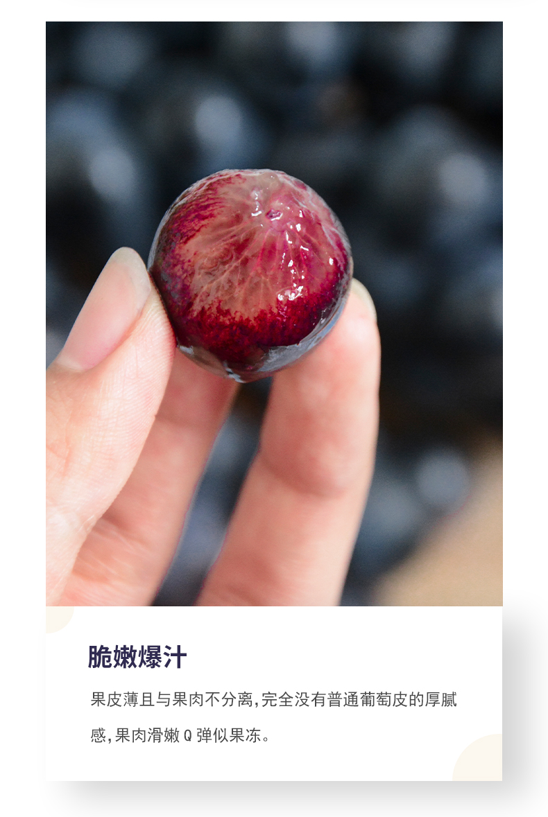 不用慢吞吞剥皮脏手,夏黑葡萄1秒就能吃到,咬开一个口子,手指轻轻一挤,滑嫩Q弹的果肉就像吸果冻,“呲溜”就滑入嘴里。