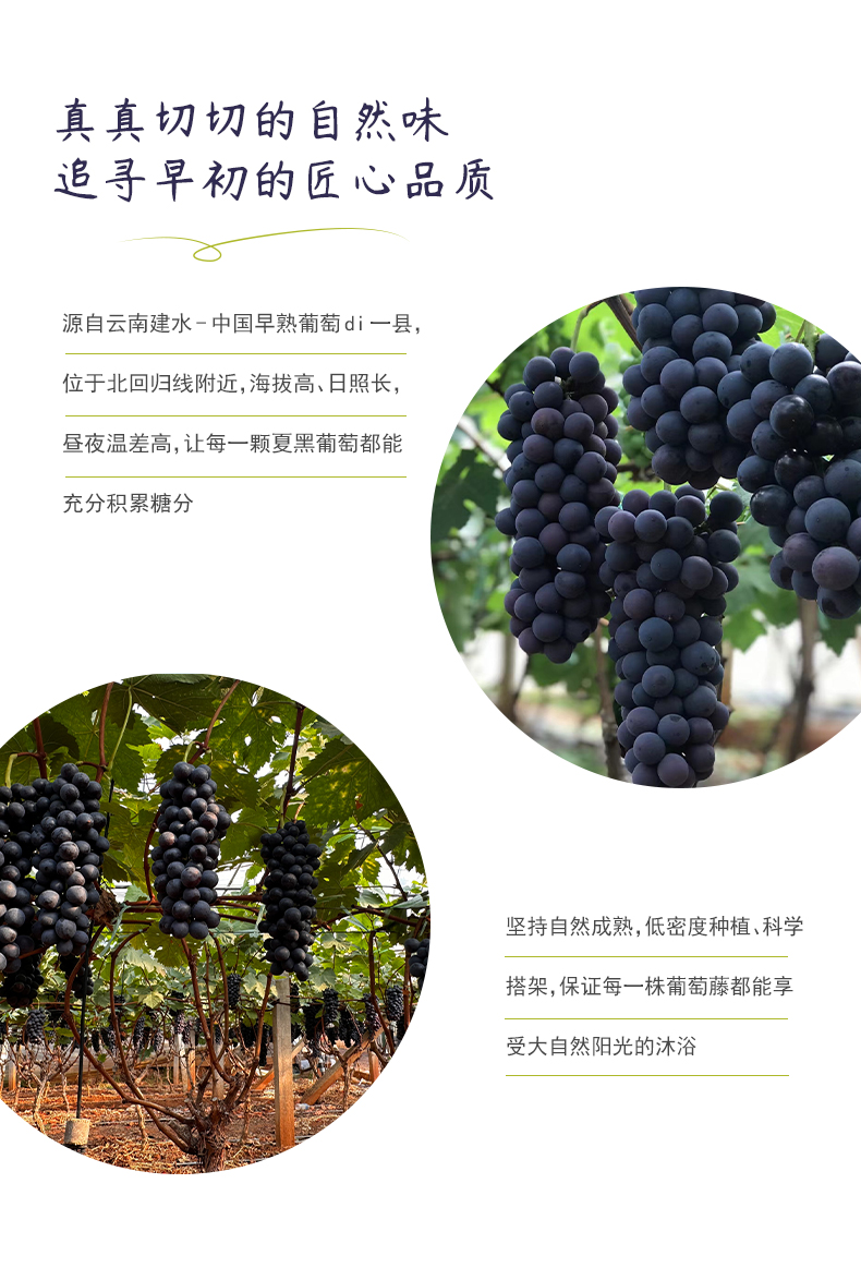 高原阳光全年无休照射3000小时,加上昼夜温差大、湿度低、少虫害。种出来的夏黑,果粒又多又大、甜度高、葡萄味浓香。