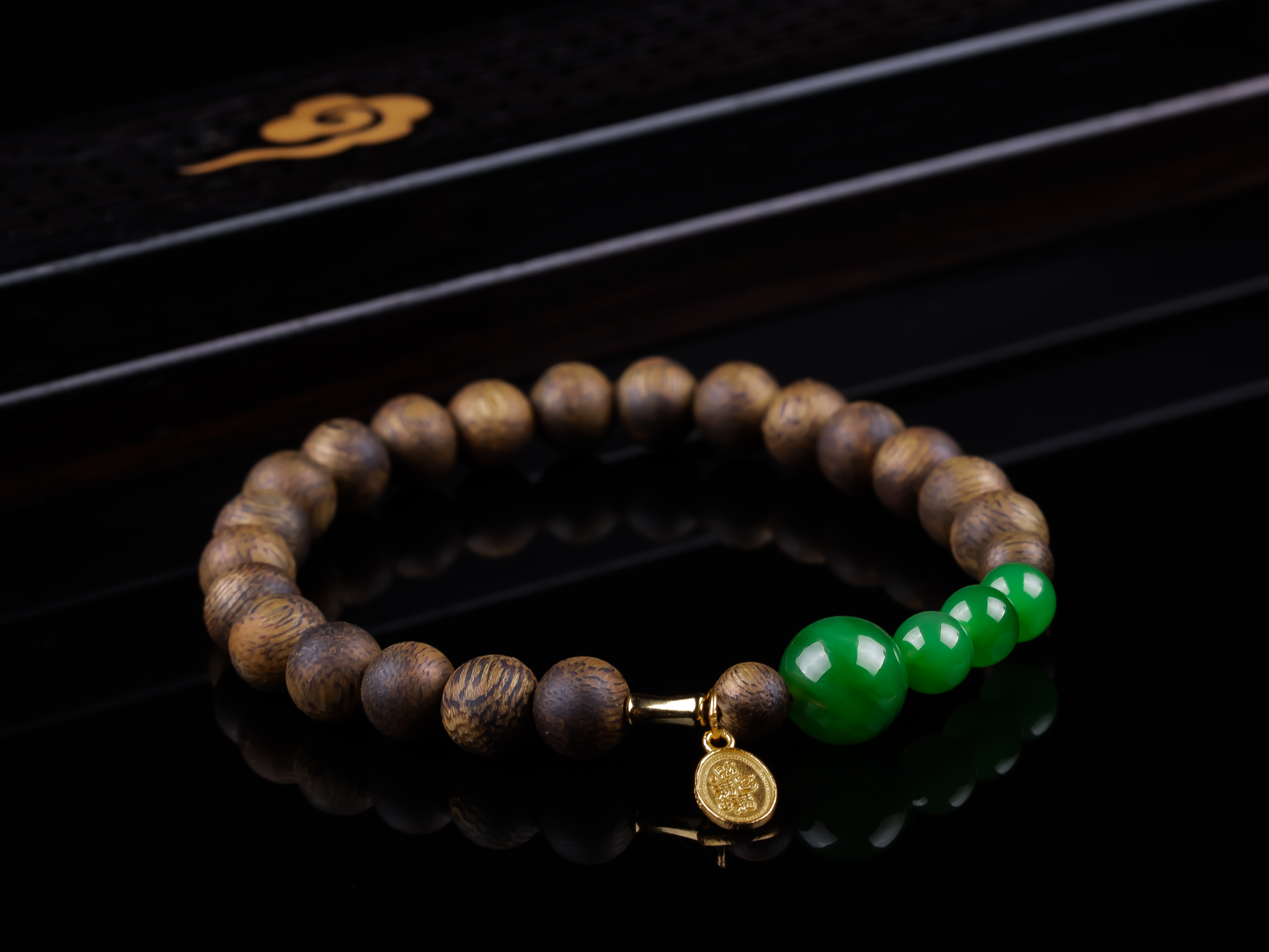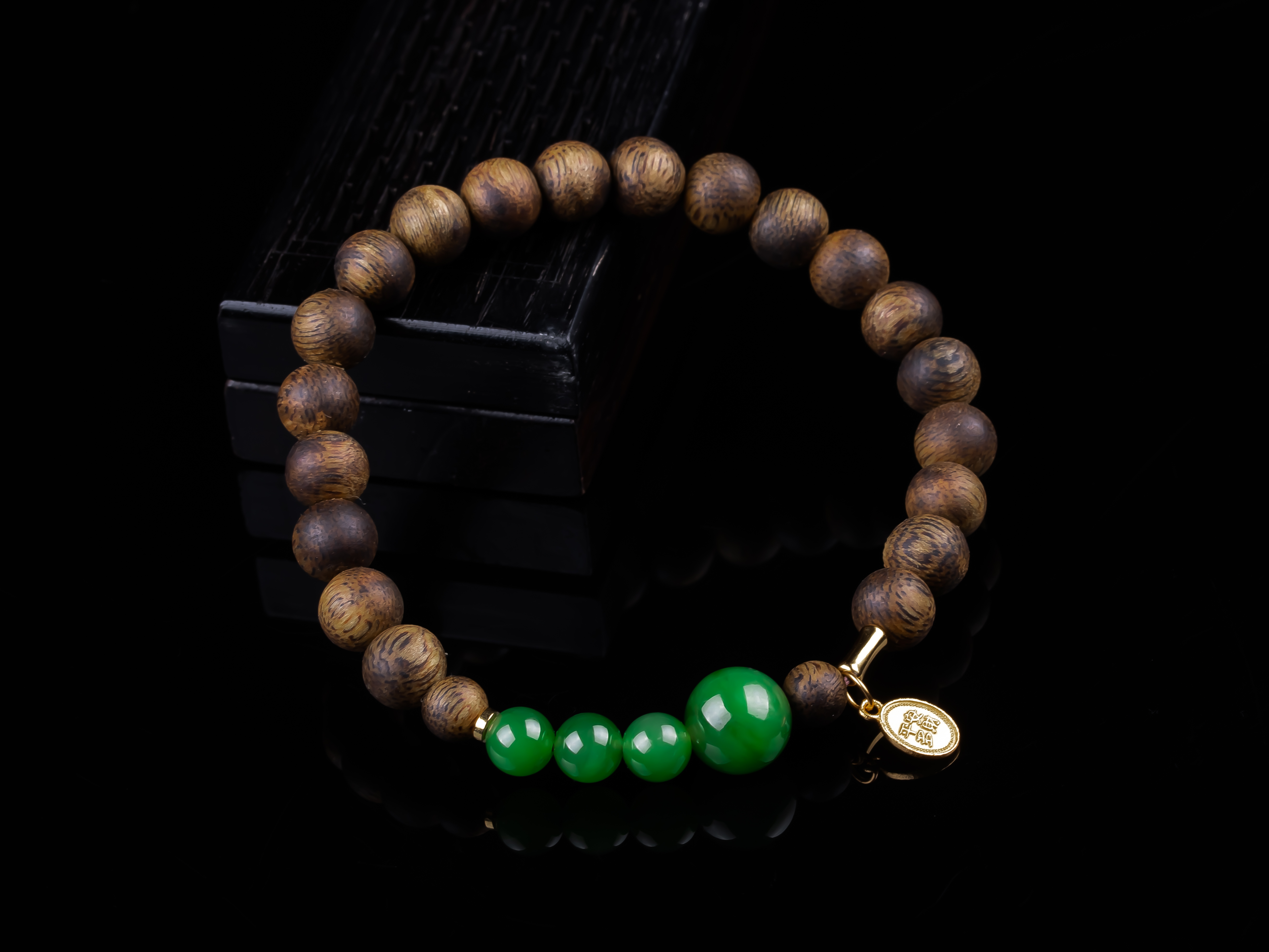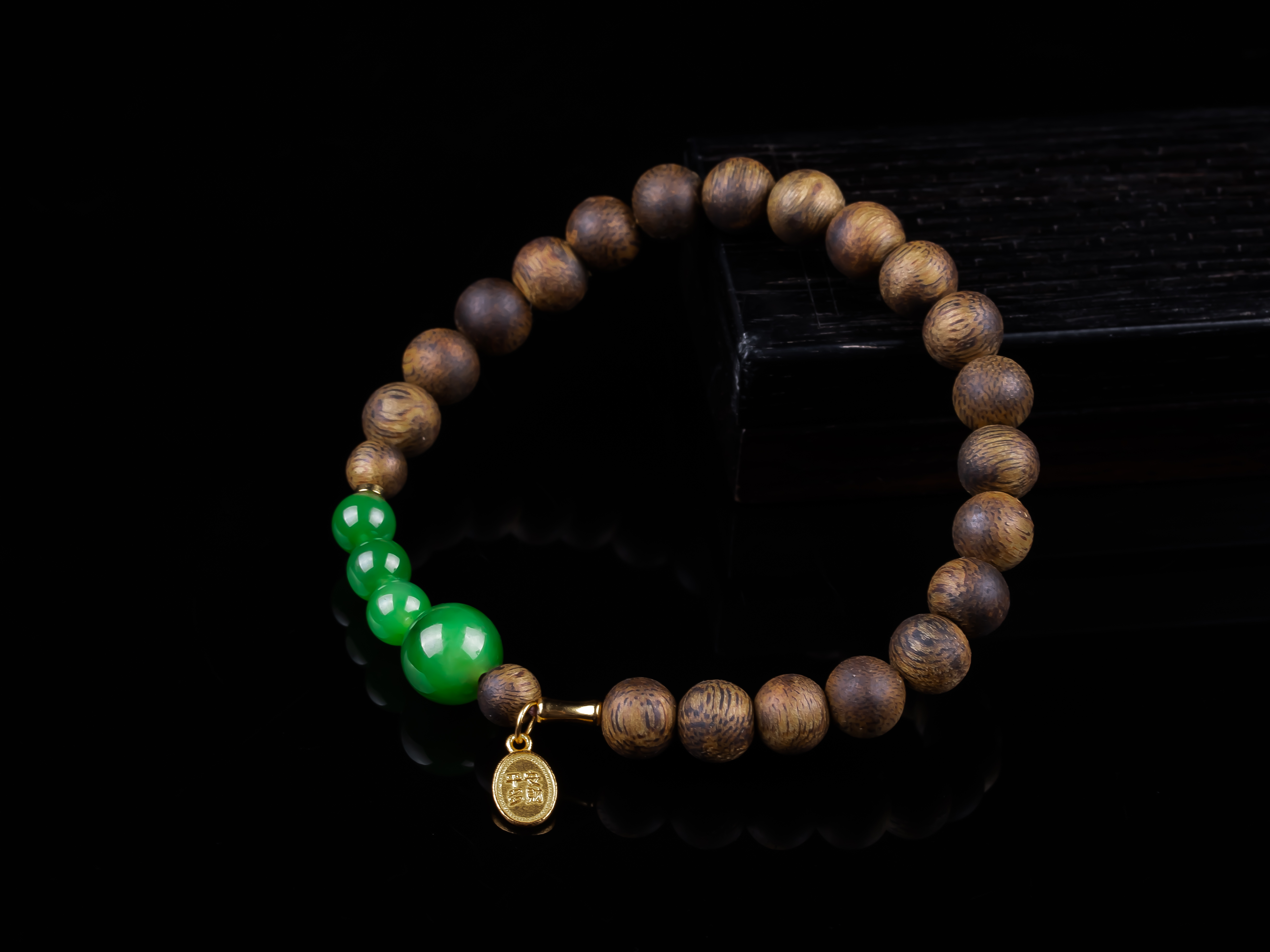 沉香+碧玉平安多财小提溜手串.银,天然沉香约7.4mm,原色原味,香味自然清甜,四颗满碧绿色的碧玉,每颗都完美无黑点,一枚银镀金的平安多财小提溜点缀,让手串典雅之余又带着可爱灵动、显个性。