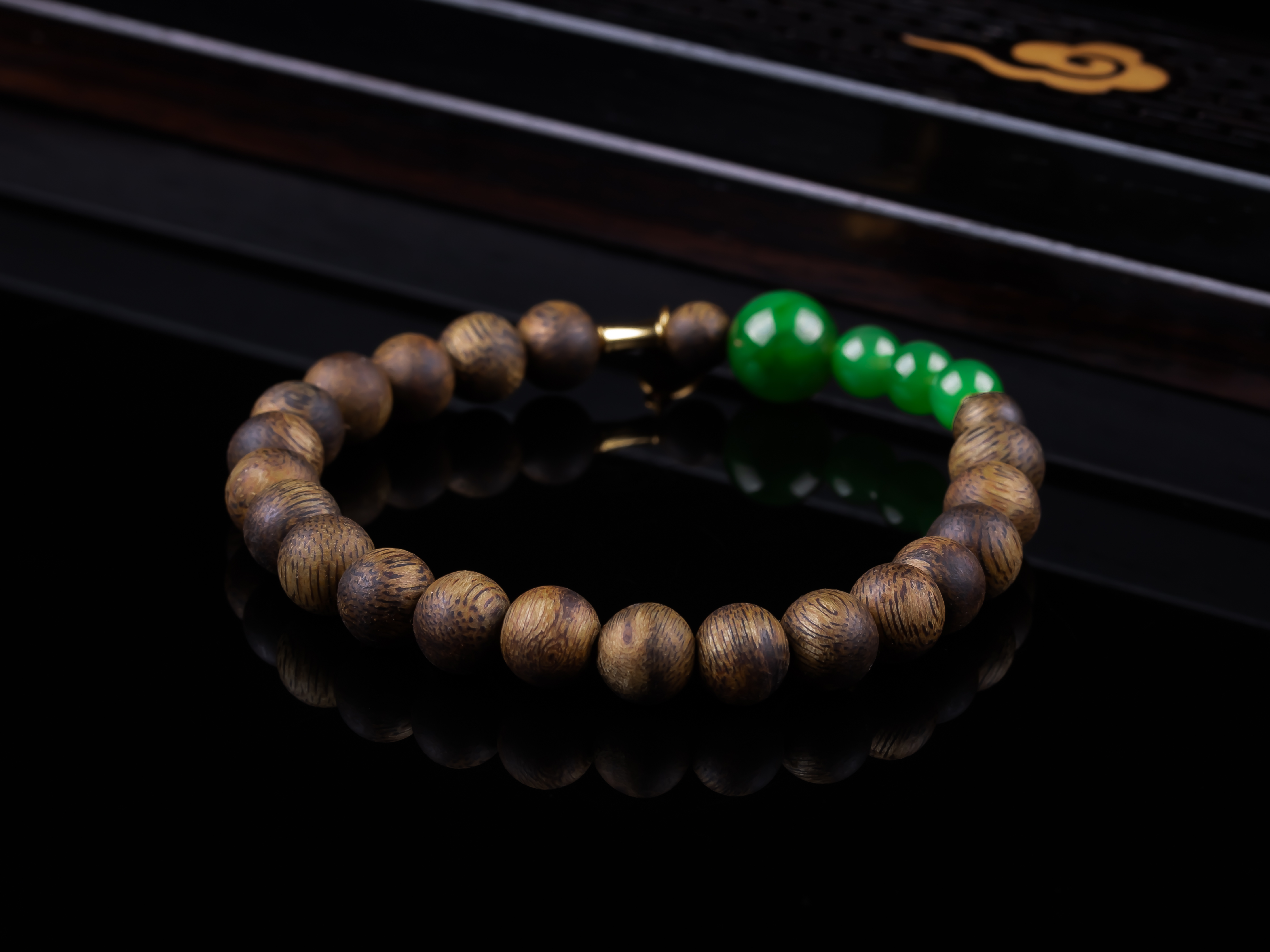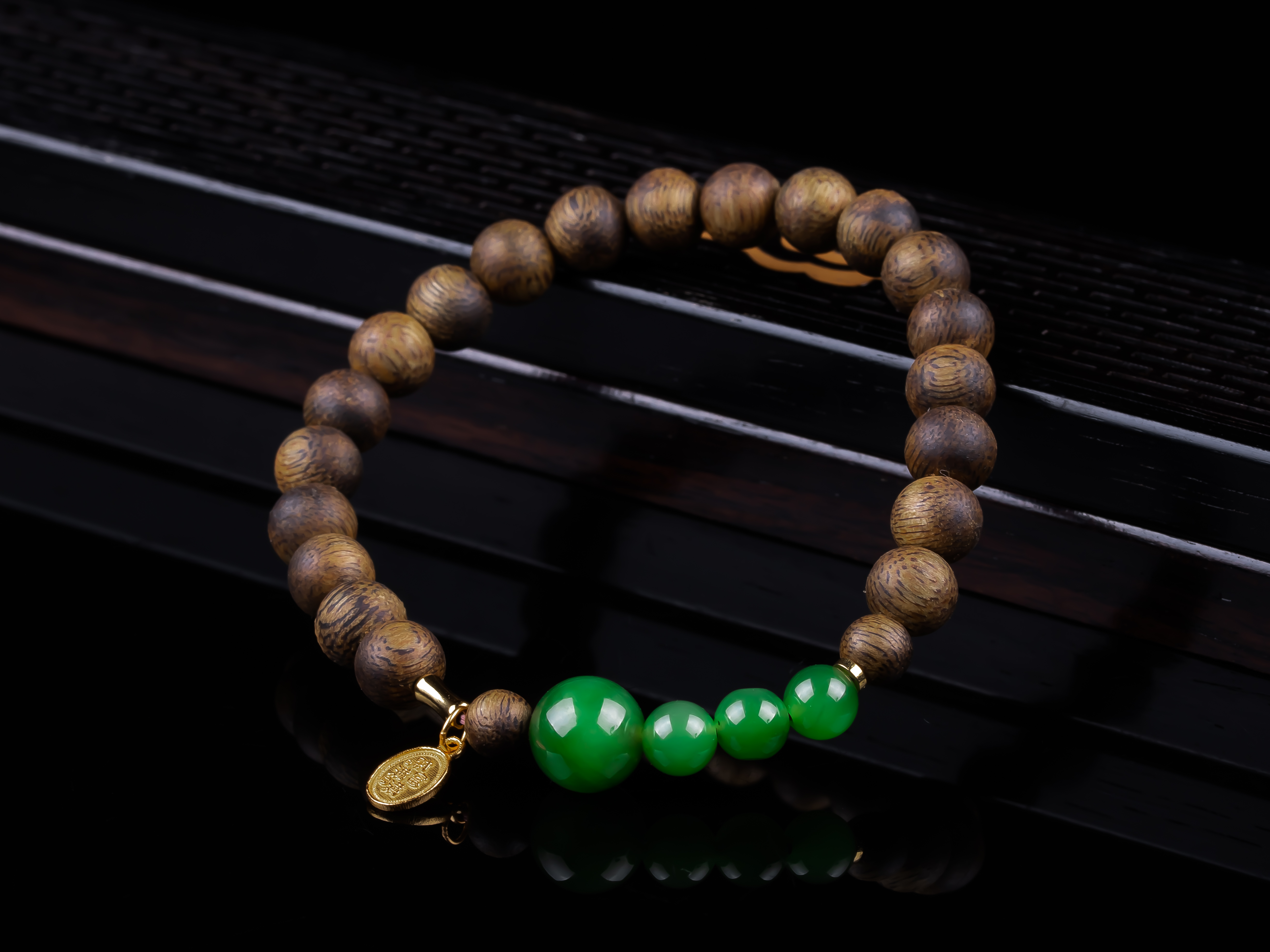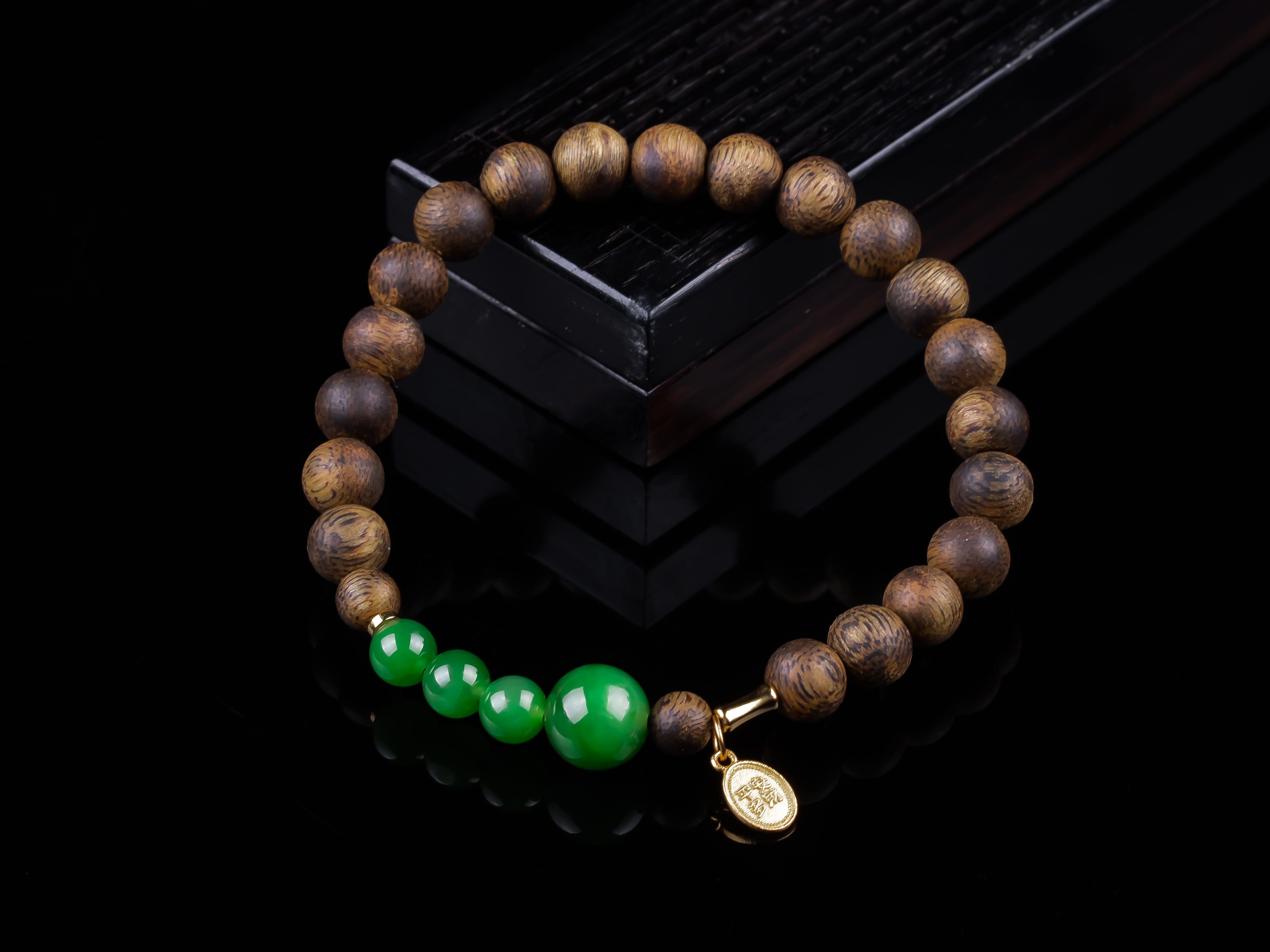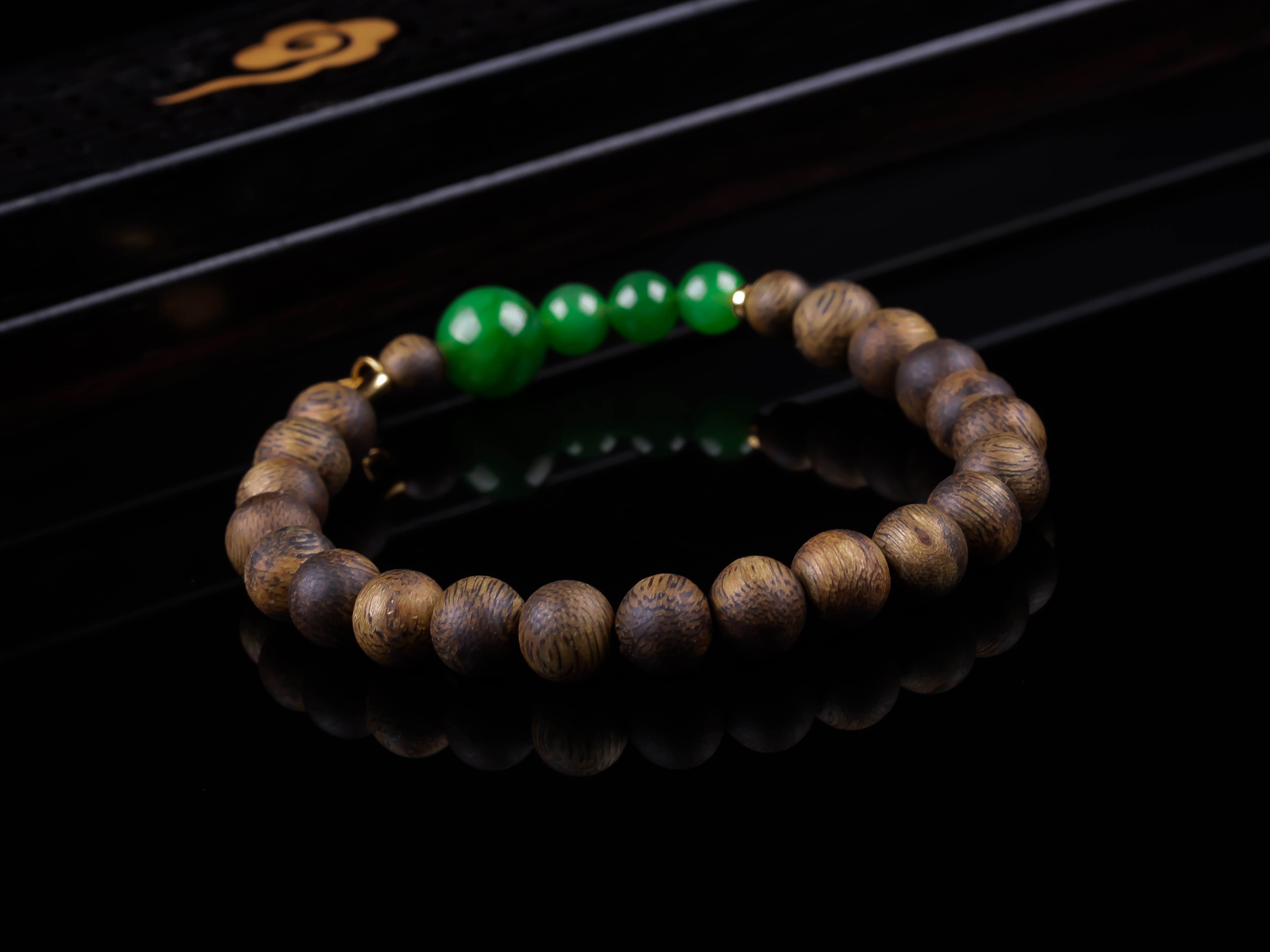 沉香+碧玉平安多财小提溜手串.银,天然沉香约7.4mm,原色原味,香味自然清甜,四颗满碧绿色的碧玉,每颗都完美无黑点,一枚银镀金的平安多财小提溜点缀,让手串典雅之余又带着可爱灵动、显个性。