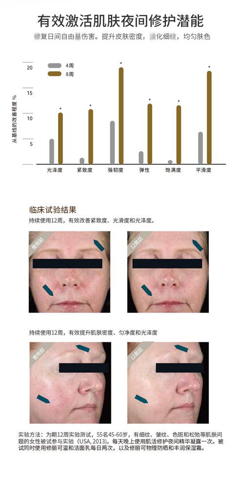 产品功效:有效激活肌肤夜间修hu潜能,修fu日间自由基伤害。提升皮肤紧实度,改善肌肤细wen、皱wen等老化现象,均匀肤色