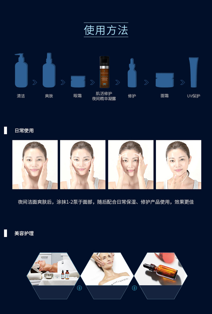 使用方法:夜间洁面爽肤后,取1-2泵涂于面部及颈部,再进行好虚保养(配合日常保湿或修护类产品使用效果更佳)。