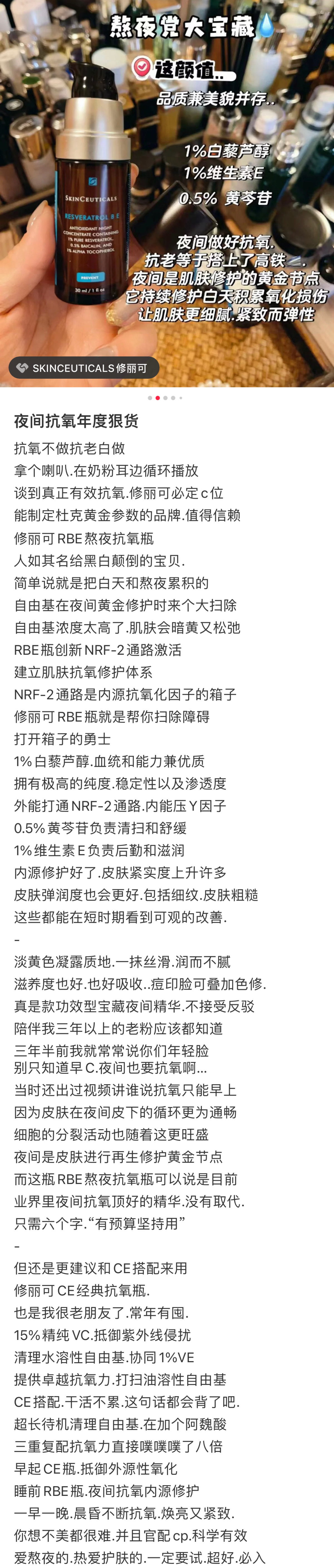 这款主打亢氧化和夜间修hu。白藜芦醇有强大的亢氧化能力和亢糖化能力,对于改善毛囊角化和亢炎也有着出色的表现,还有yi制黑色素的功效。