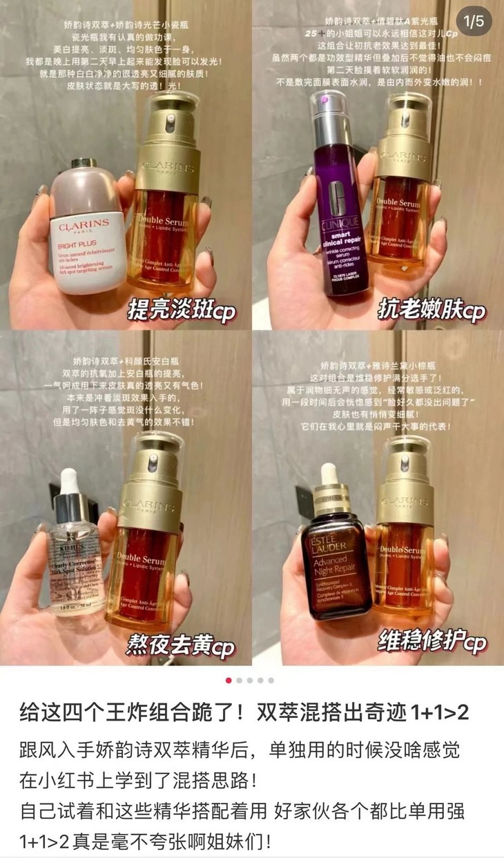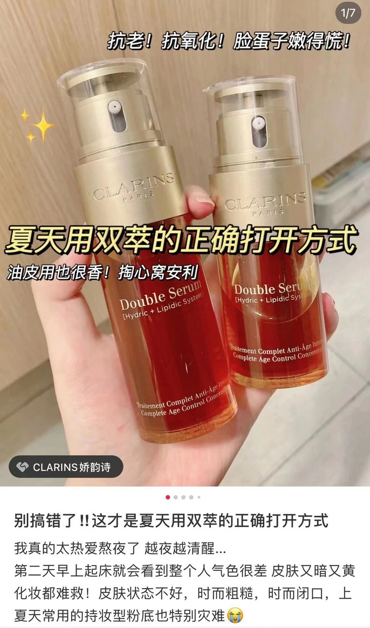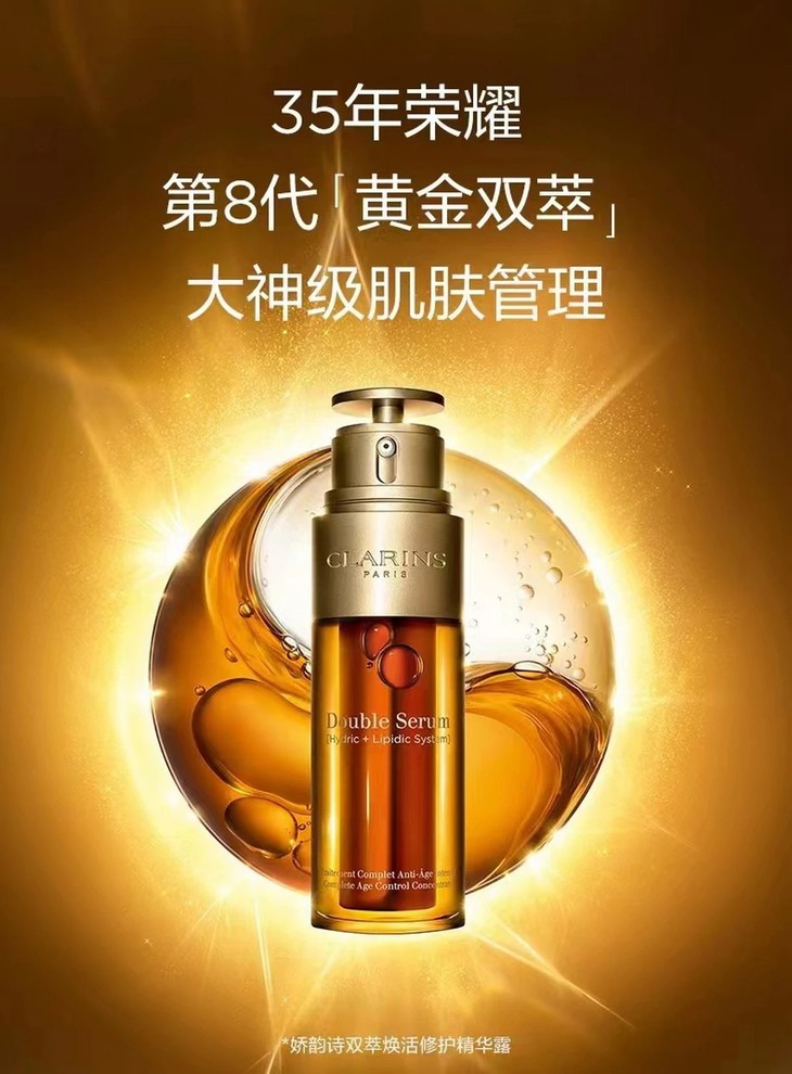 娇韵诗双萃精华,20种植物抗老精粹和水溶精华,油溶精华双管齐下,通过面独特的水油黄金比例系统将两种不同分子结构的亲油及亲水抗老活性因子萃练于双瓶之中,提供细胞级抗老保 养、修护细胞原生。