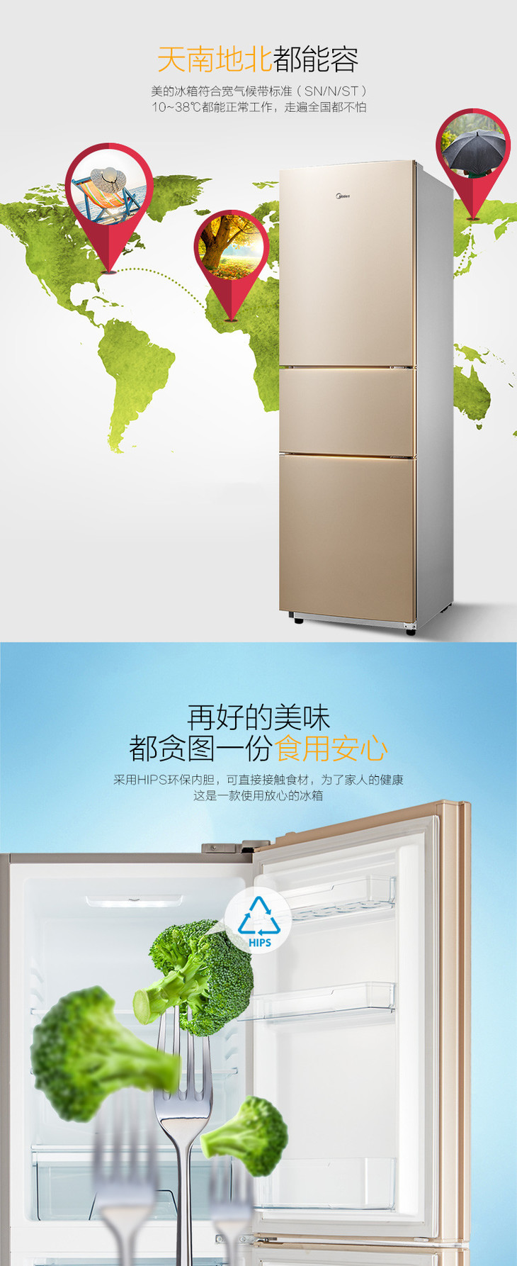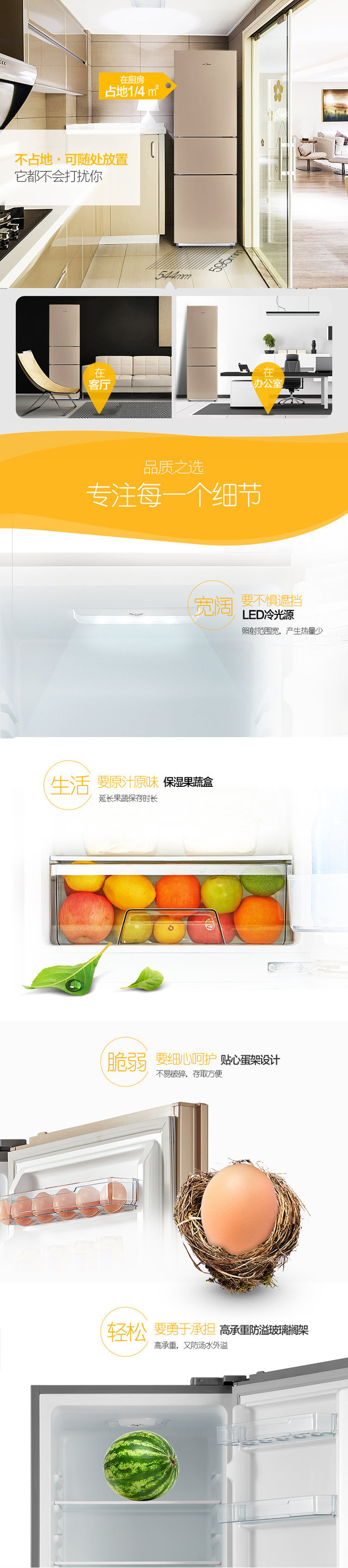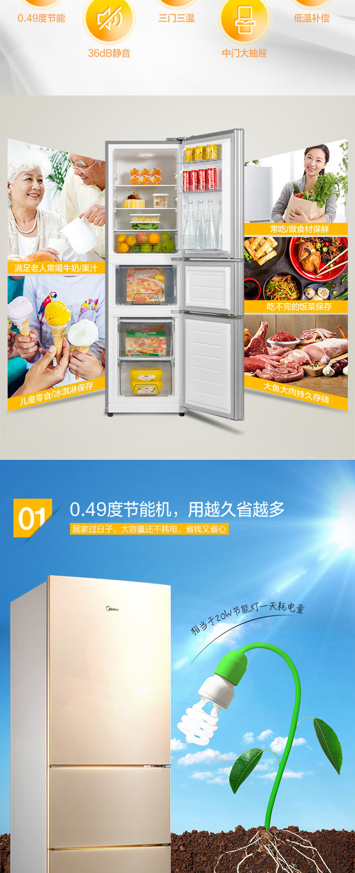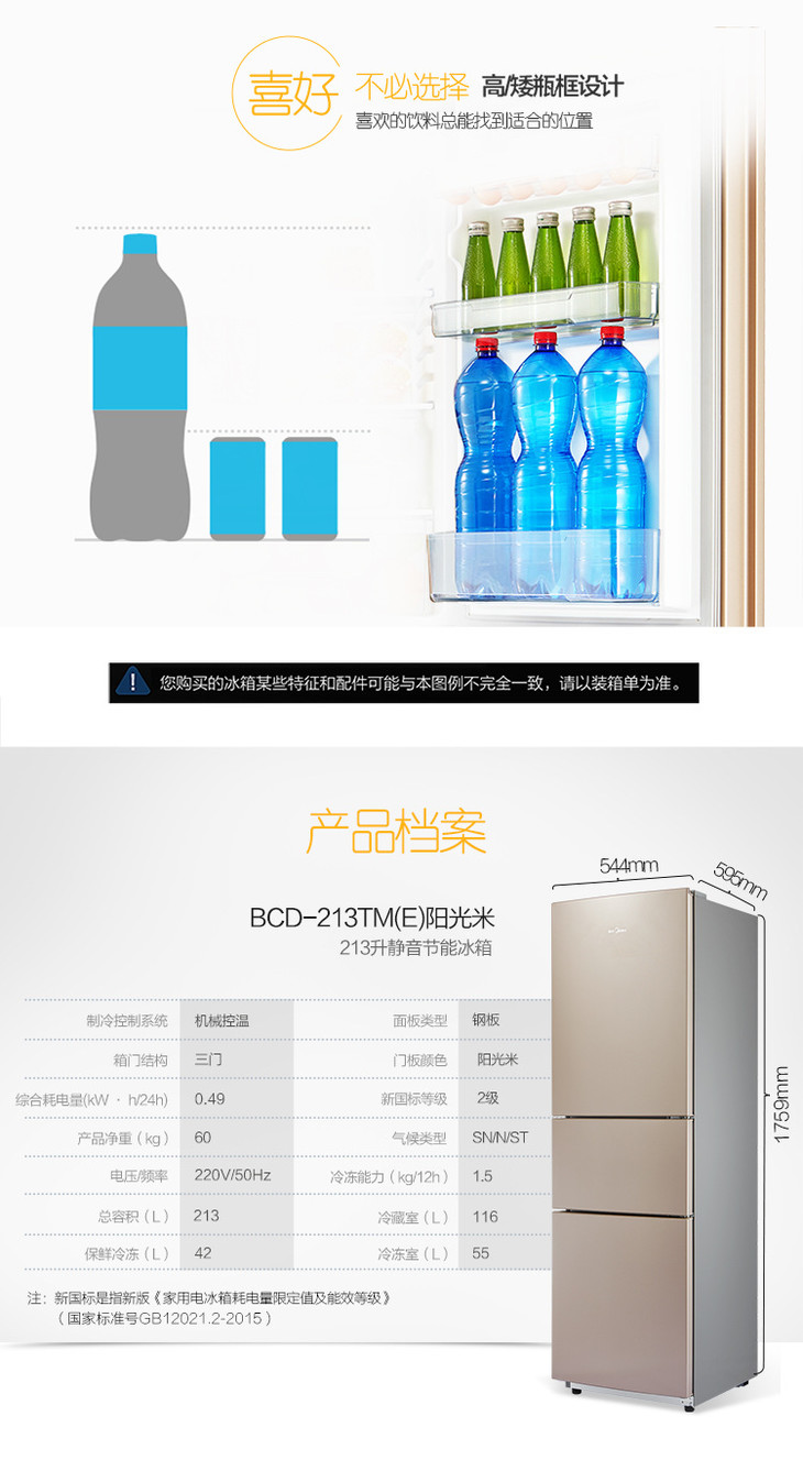 【美的冰箱】*Midea/美的 BCD-213TM(E) 节能静音家用三开门小冰箱小型电冰箱