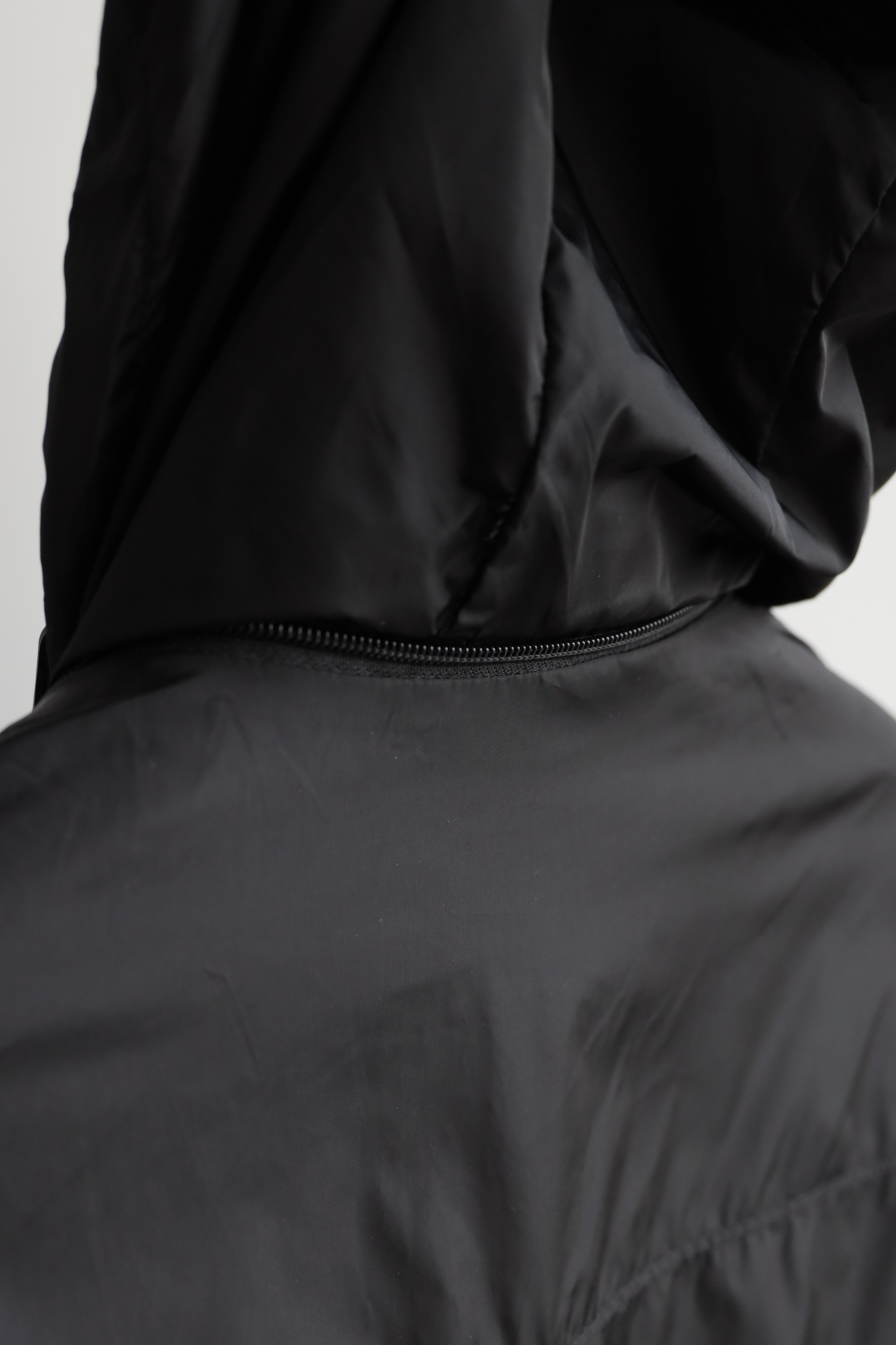男女同款,连帽可收纳到立领里。整体超前时髦的设计,可调节颈部宽松度的门襟半拉链开合设计