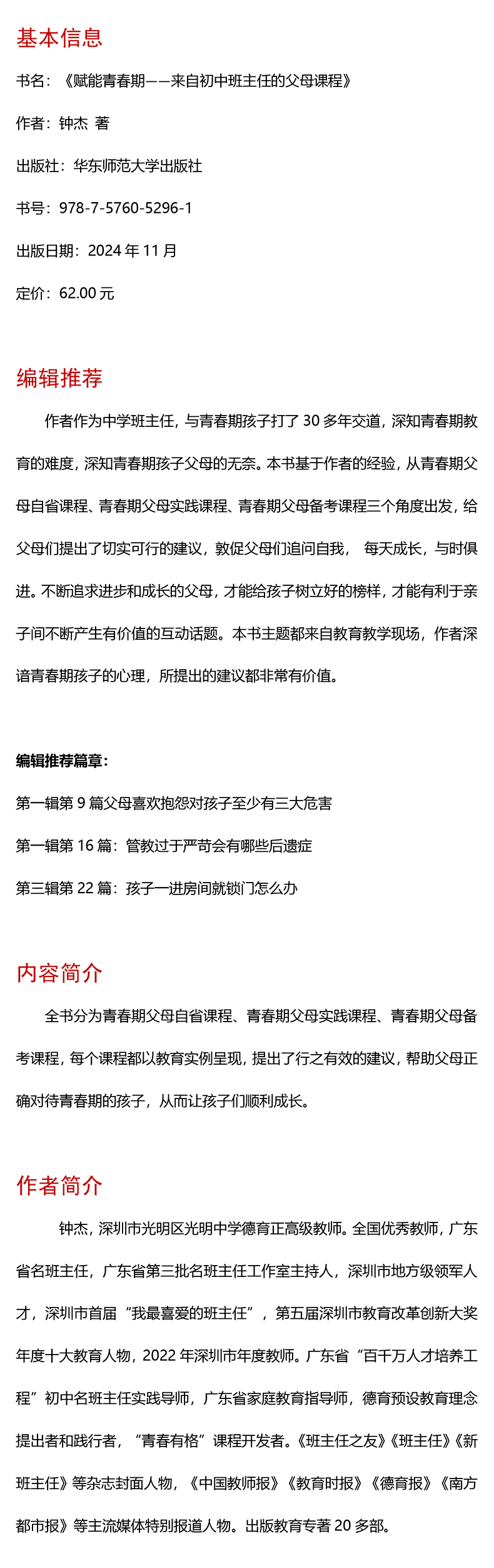 赋能青春期 来自初中班主任的父母课程 大夏书系 钟杰 家庭教育