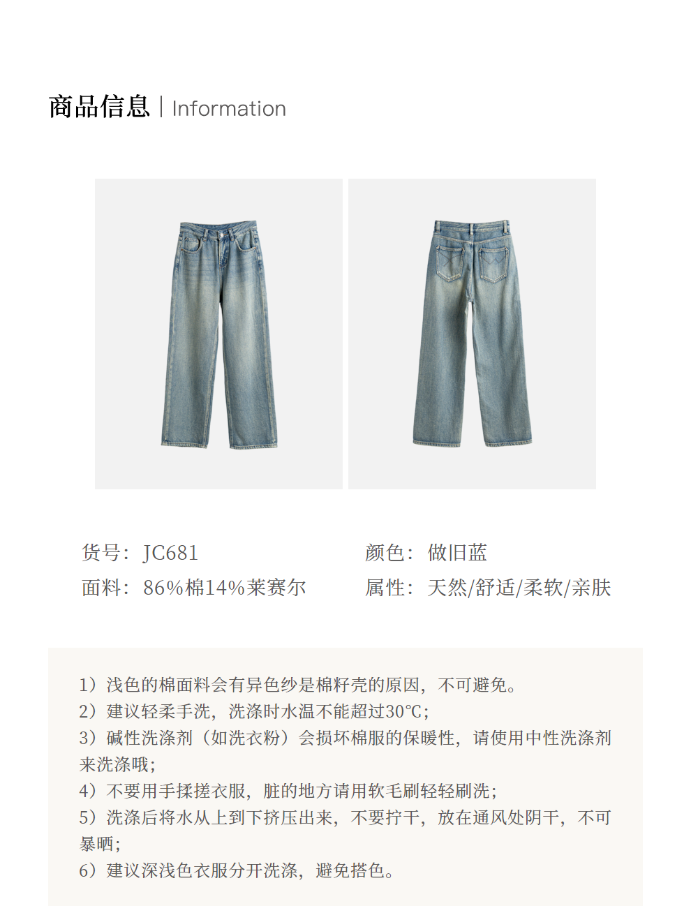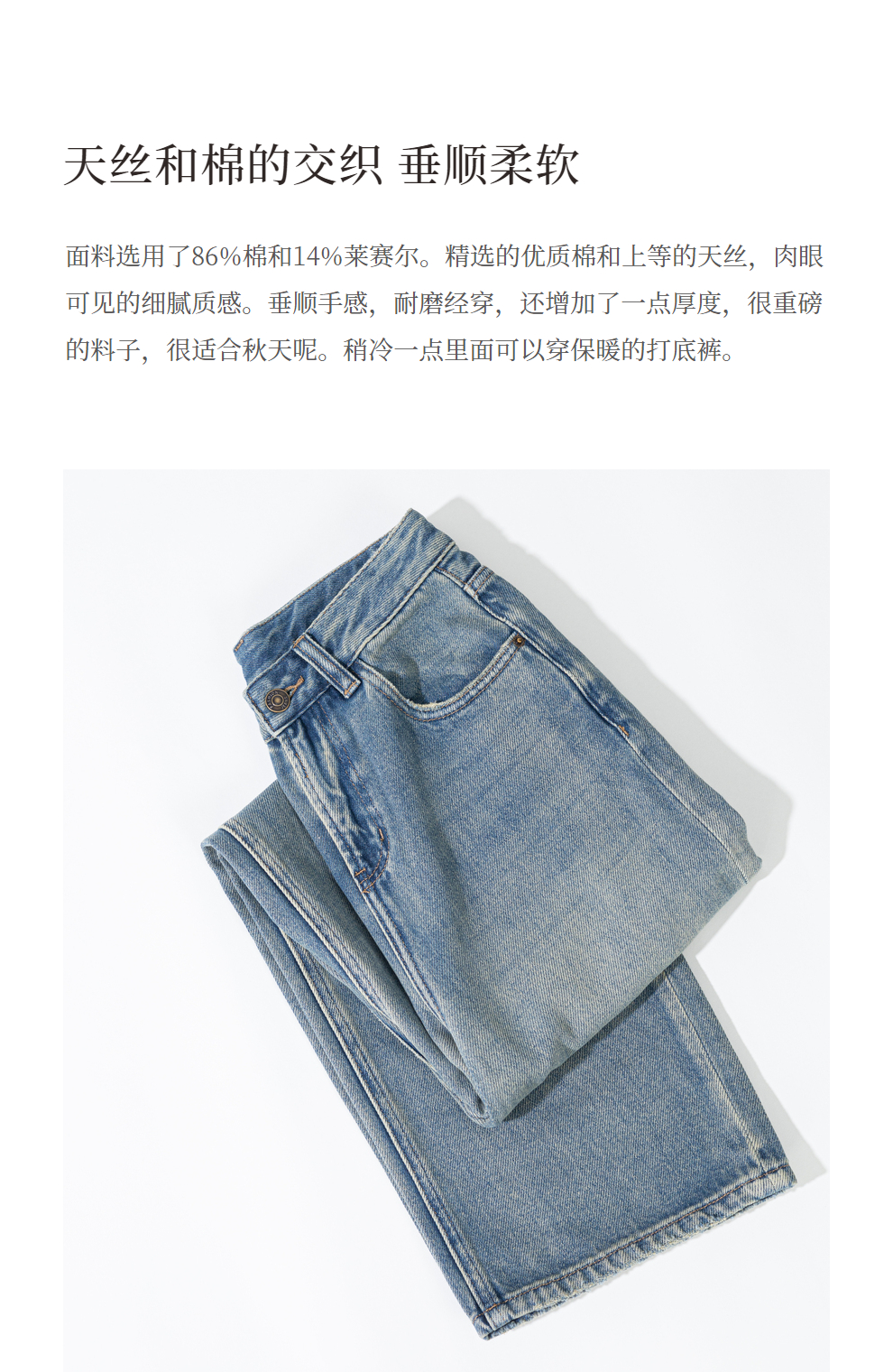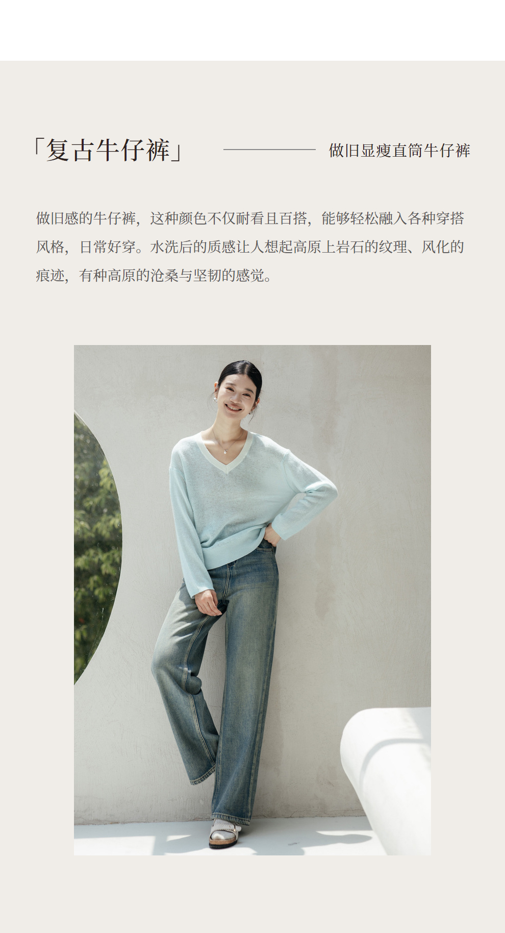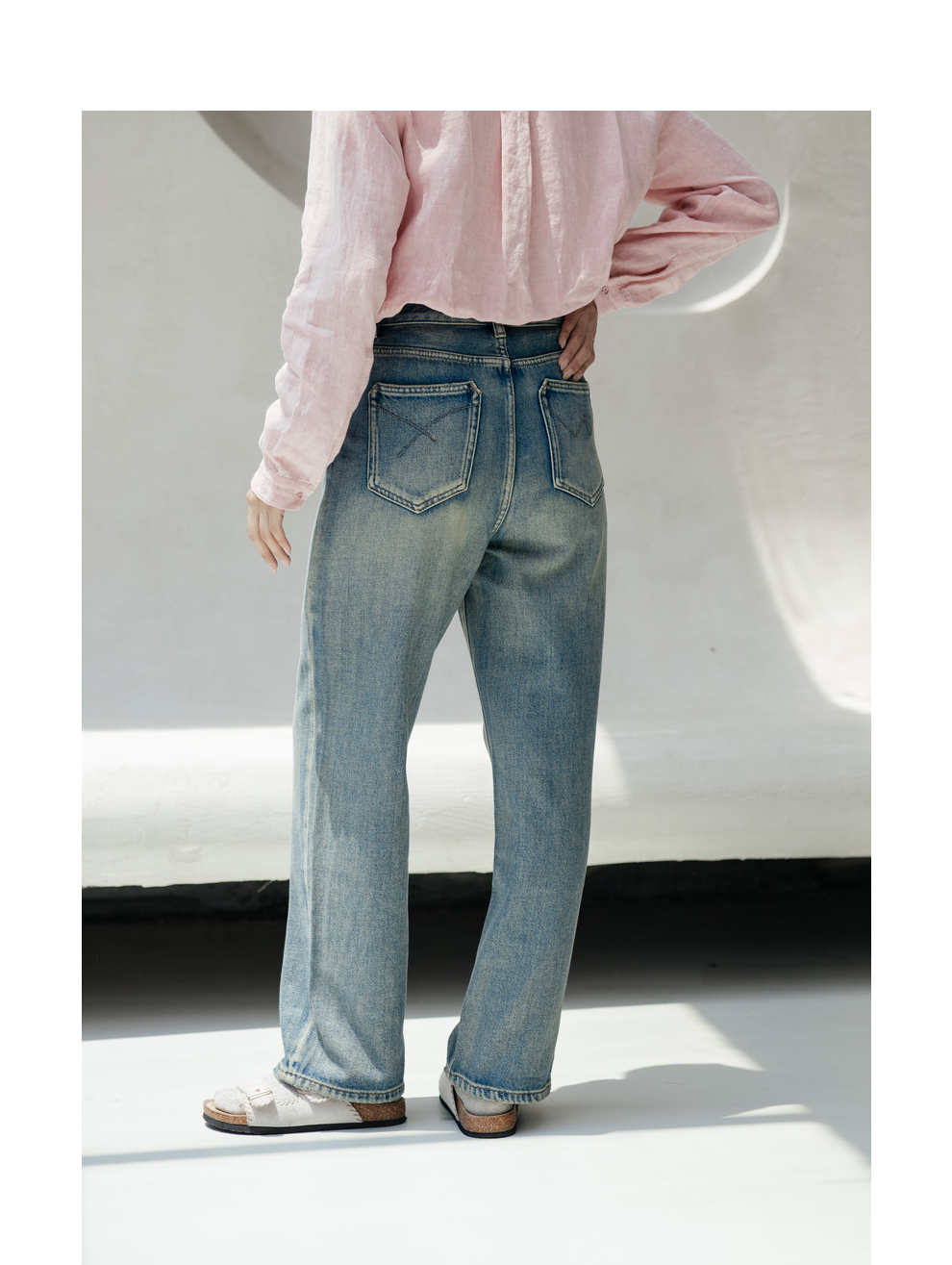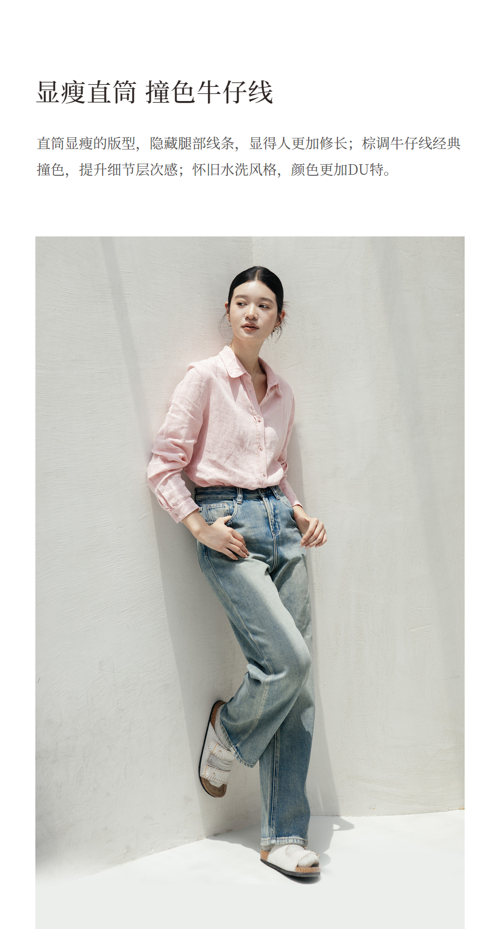绽放旅行女装681朵/早秋撞色做旧显瘦*直筒复古百搭牛仔长裤