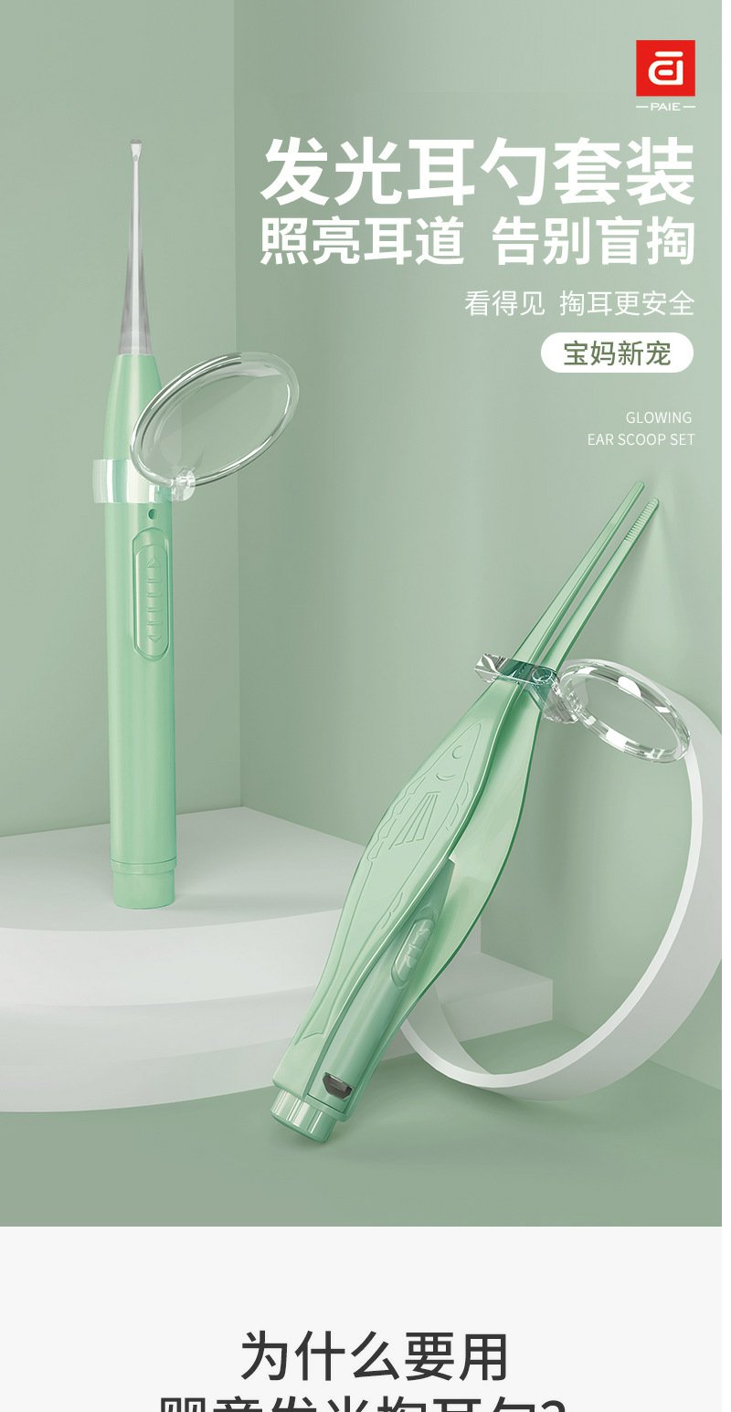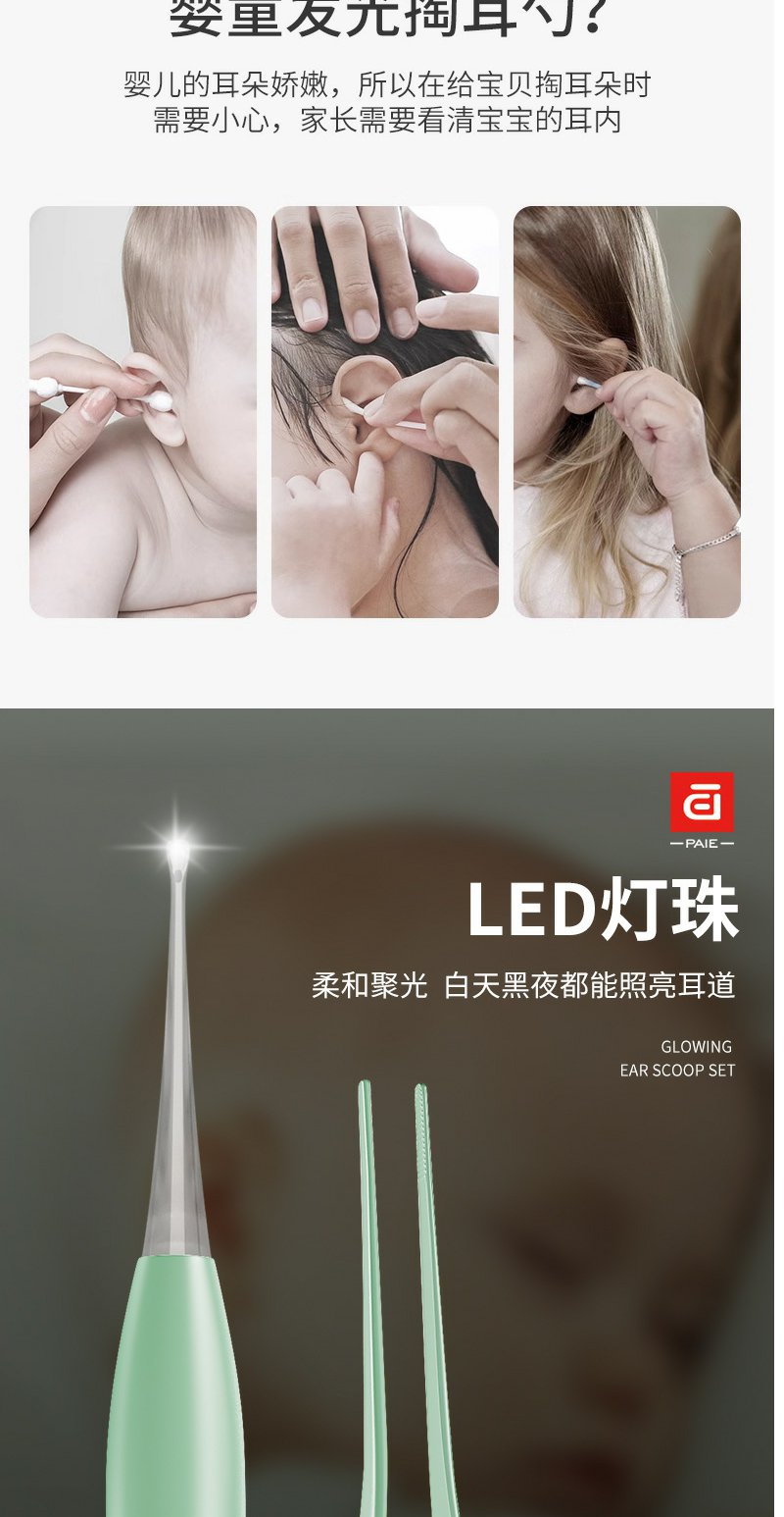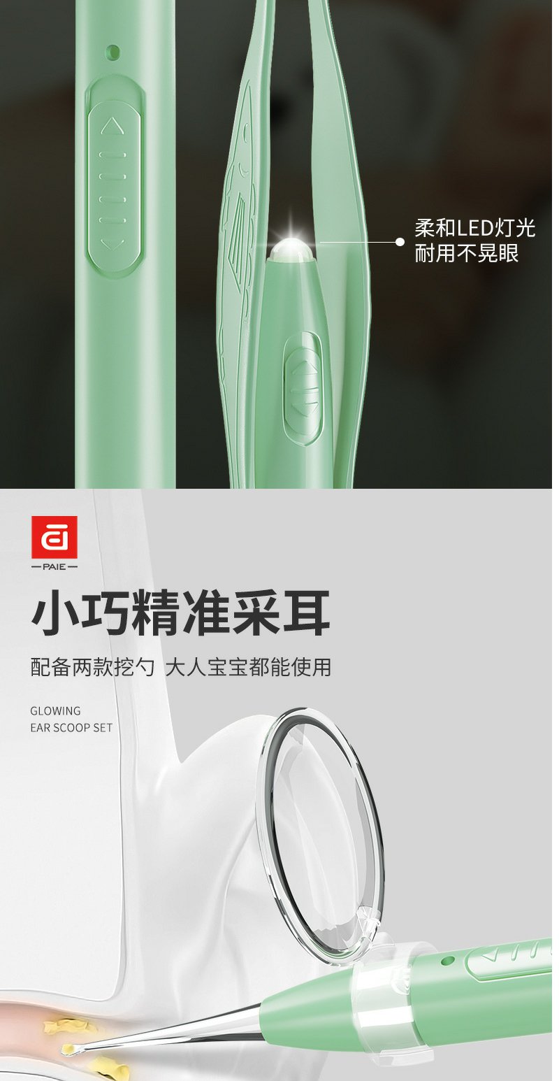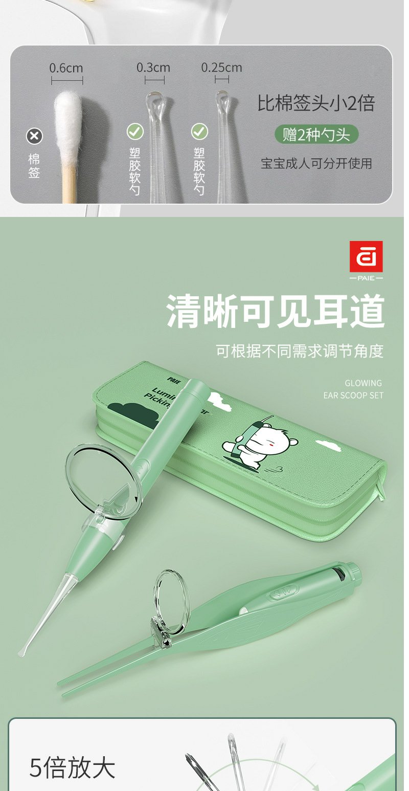 【皮套+放大镜】PAIE儿童宝宝发光耳勺 硅胶软头挖耳勺镊子成人可视带灯掏耳勺
