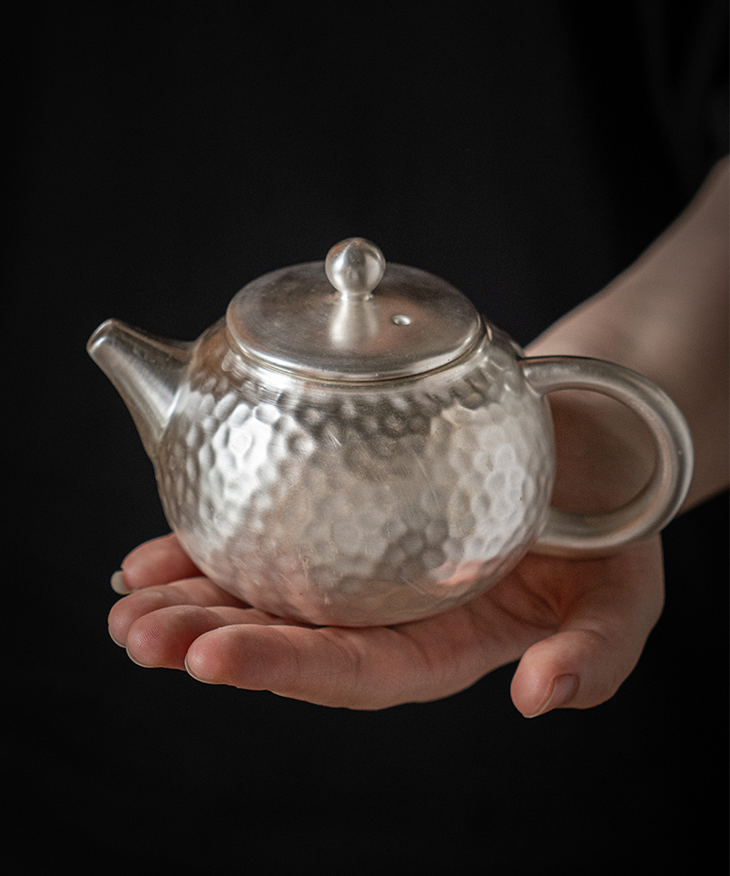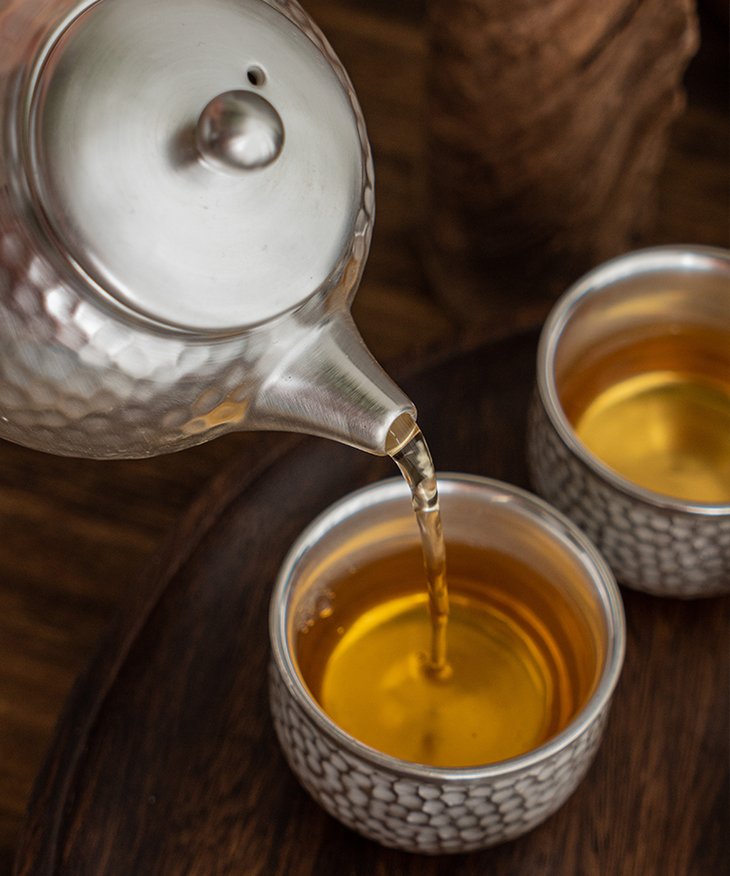 纯净柔和的银壶,能煮出“若绢水“,泡茶能去浊扬清,柔如丝绢。