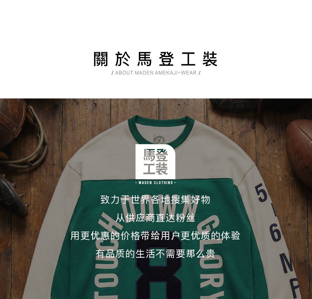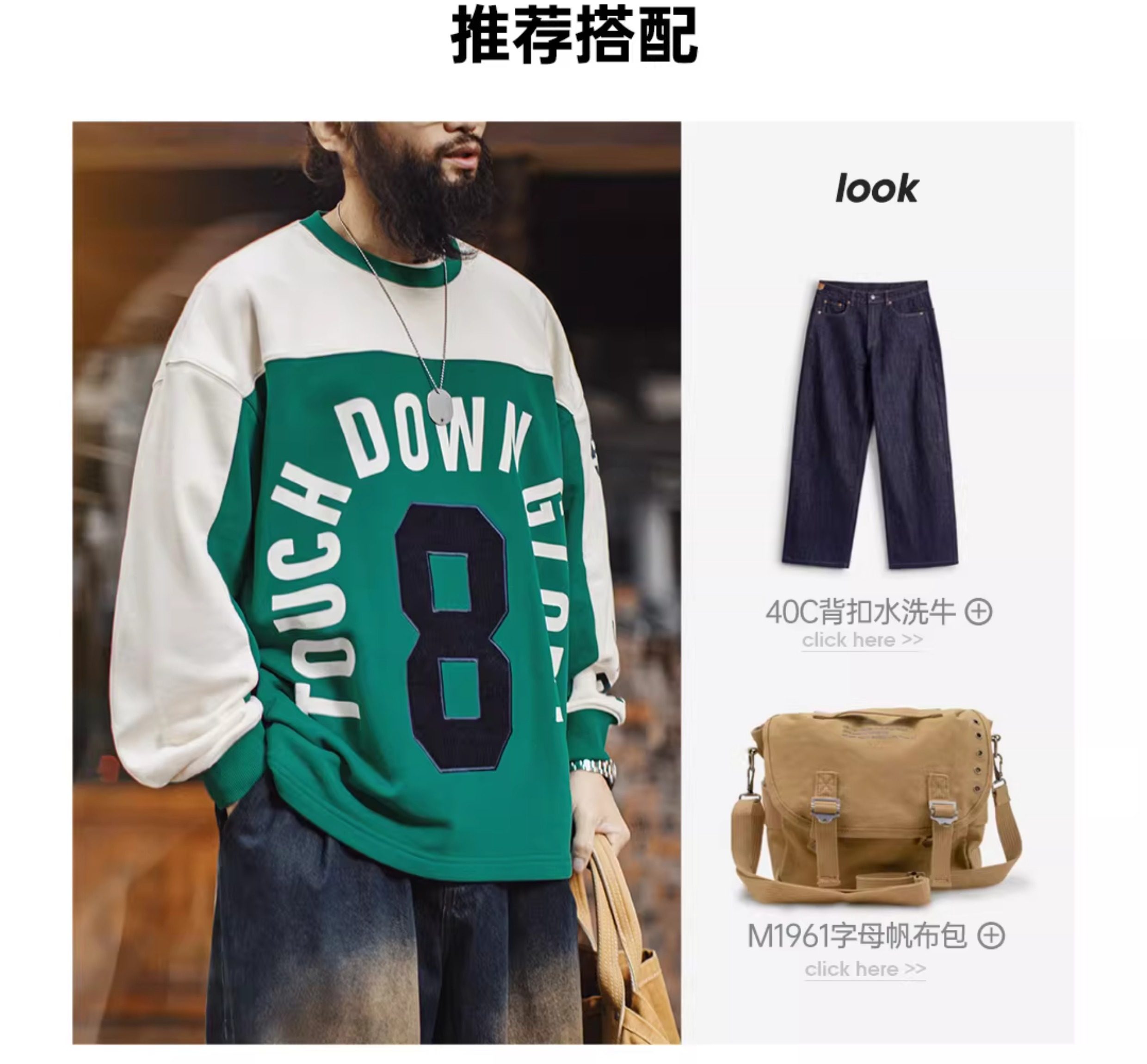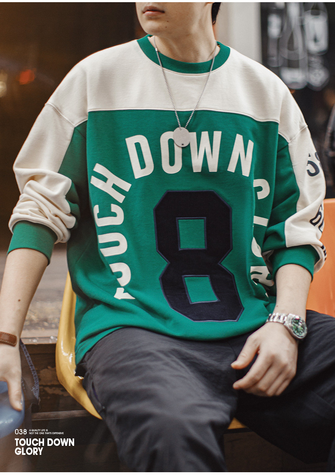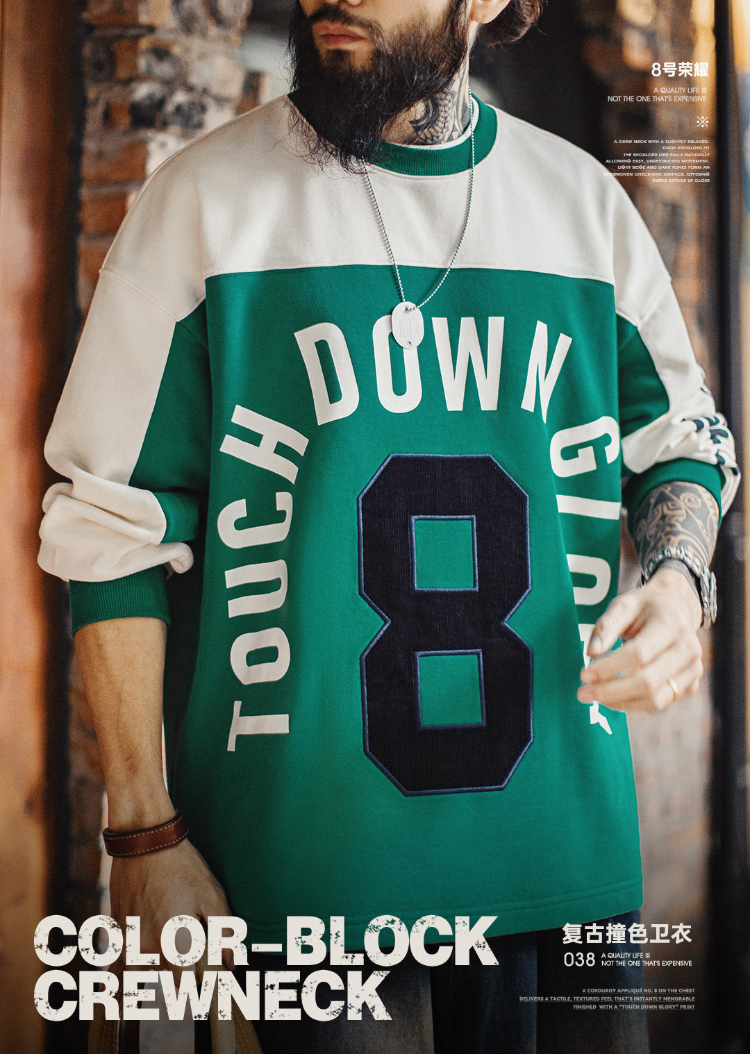 马登工装美式复古球衣风撞色长袖T恤数字圆领套头卫衣外套男款春