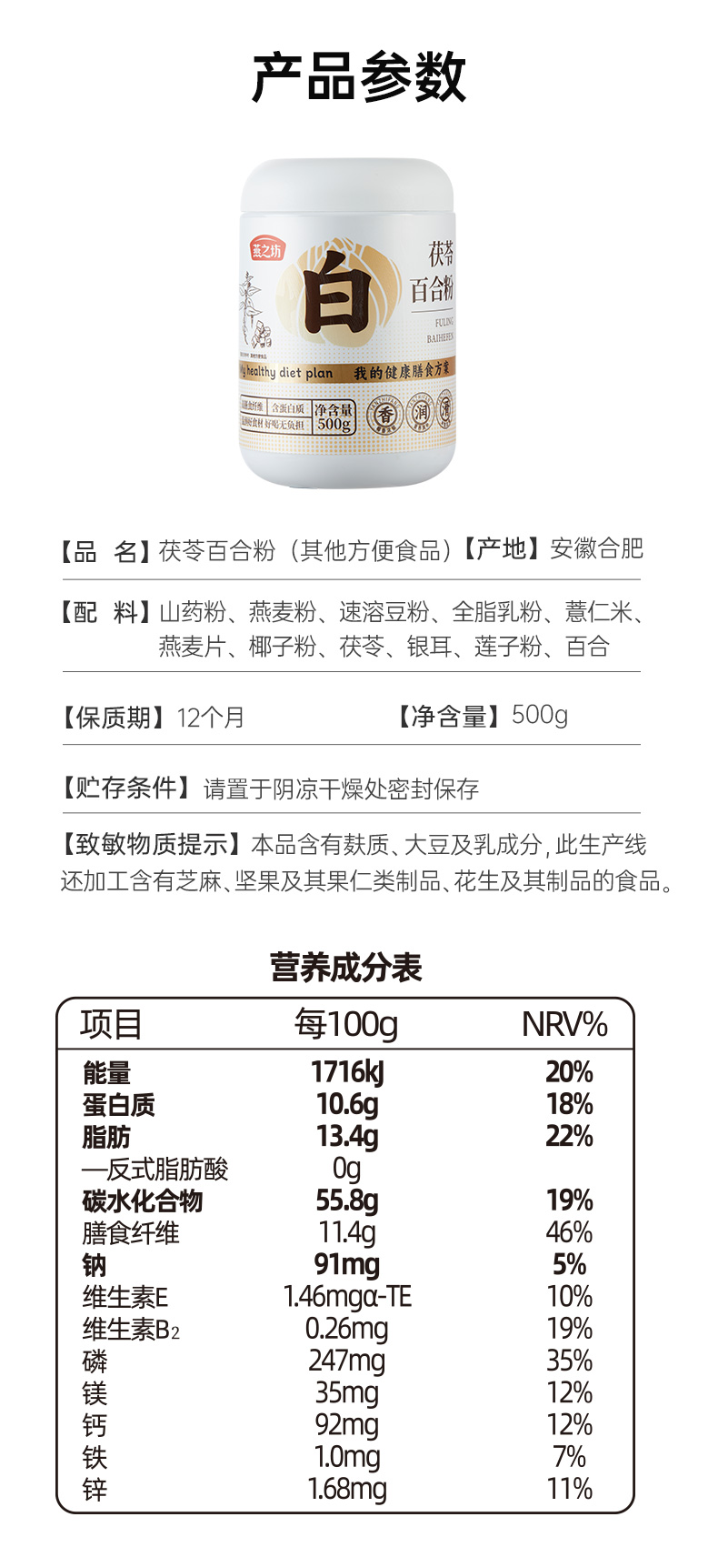 燕之坊茯苓百合粉500g 山药薏米银耳莲子燕麦粉早餐代餐粉