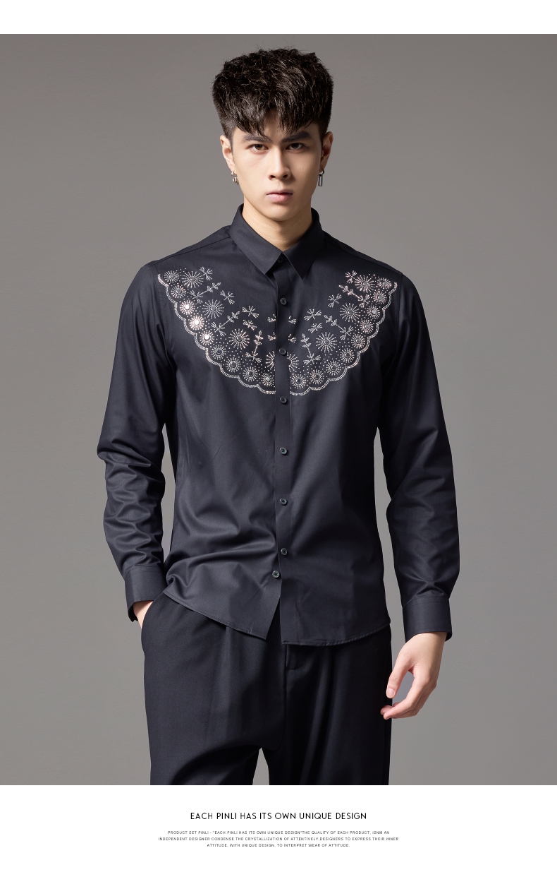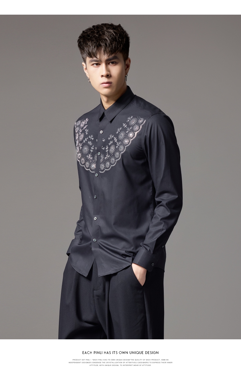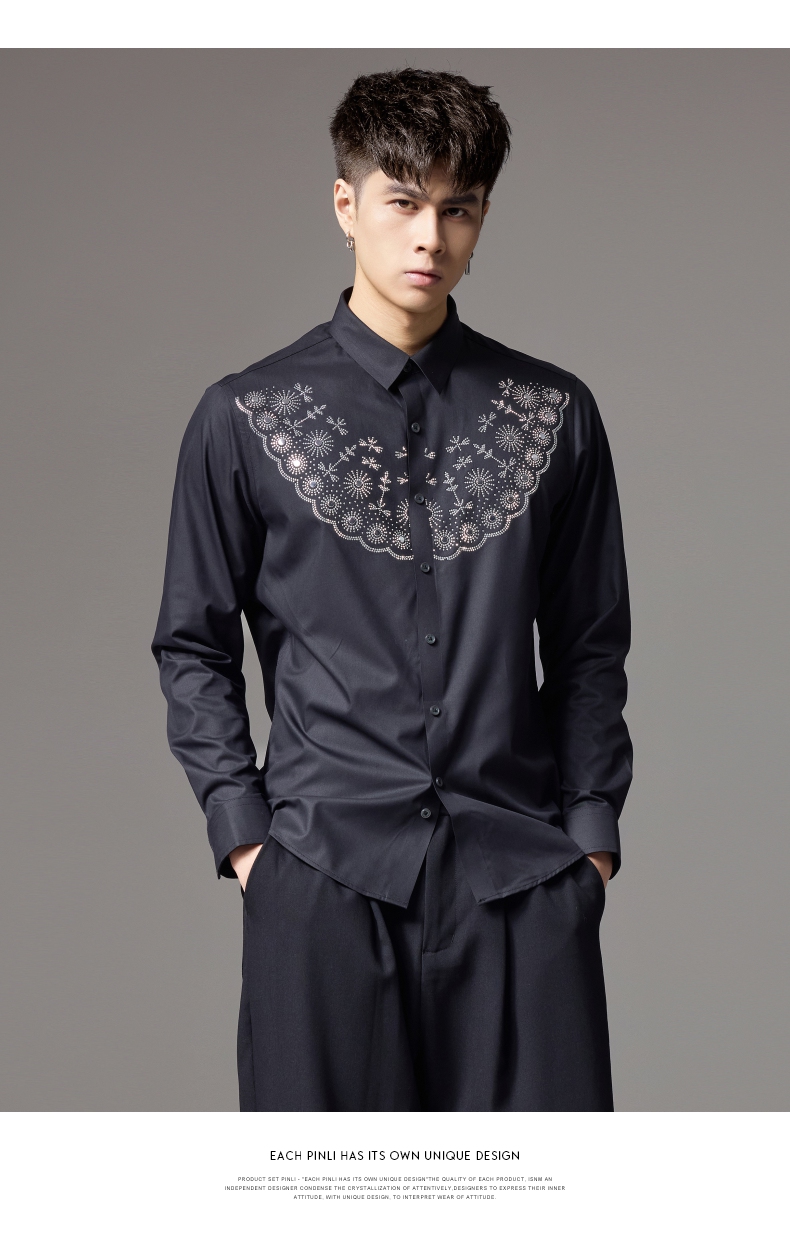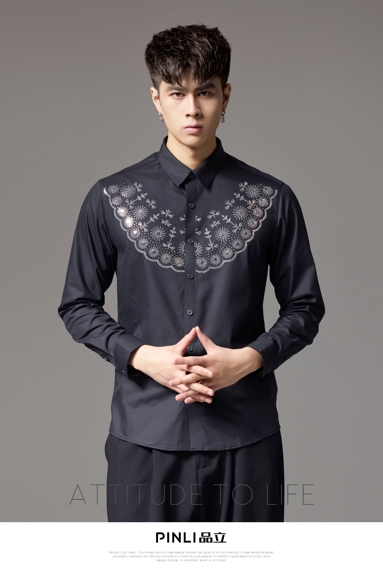 PINLI品立2024秋季新款烫钻尖领花卉金属烫片休闲长袖衬衫男衬衣BG243113041