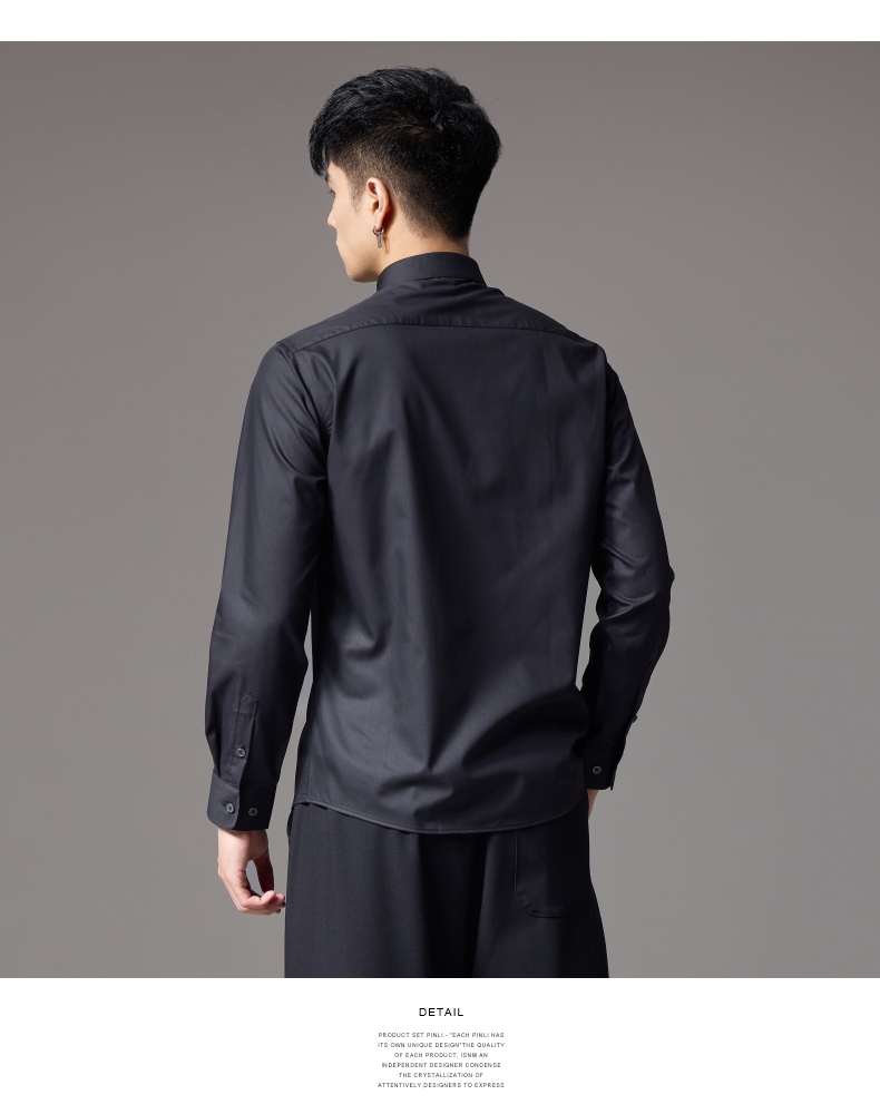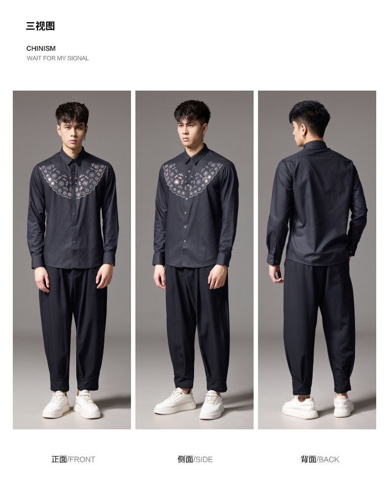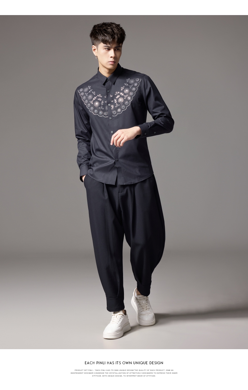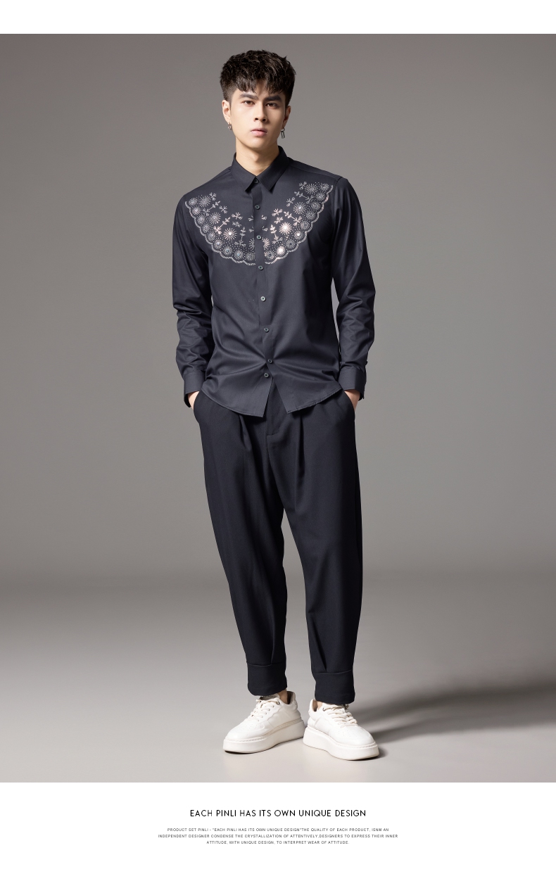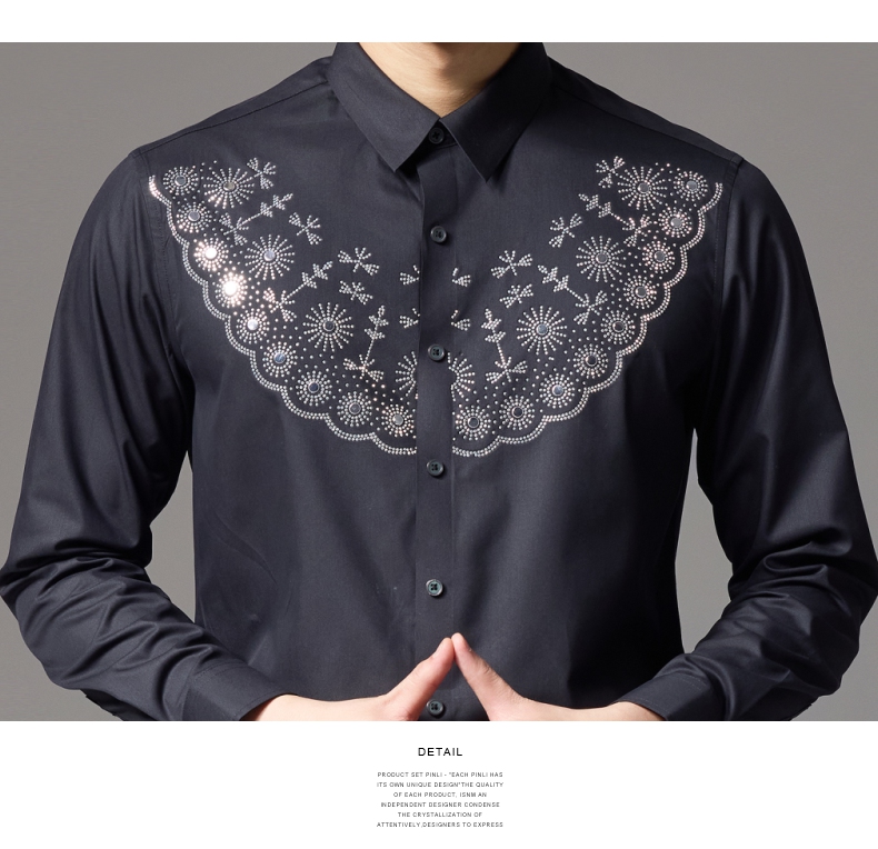 PINLI品立2024秋季新款烫钻尖领花卉金属烫片休闲长袖衬衫男衬衣BG243113041