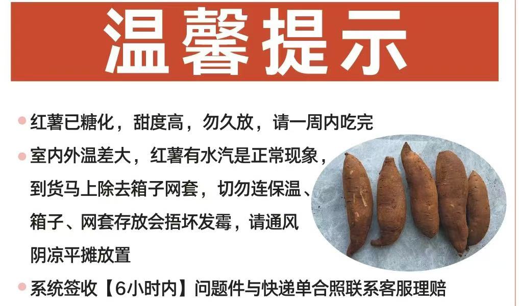 包装发货经过常温运输,可能会产生水雾水珠(尤其是南方)。一定要及时签收,签收后放在阴凉干燥的地方敞开晾干后,竖着放箱子里(不要摞在一起)或直接放地上,也不要装任何袋子保存,【榴莲蜜薯糖分比较高,在薯类中是最容易坏或者糜烂发霉的一个品种】,千万不可捂着热的地方存放,尽快吃~