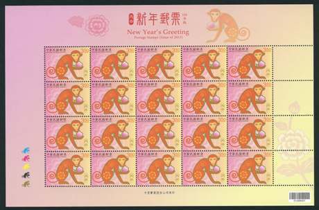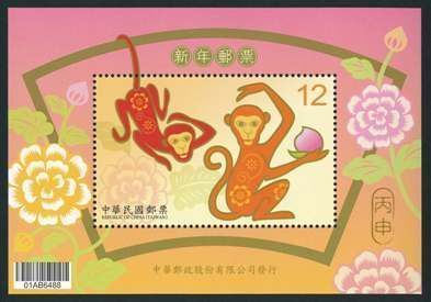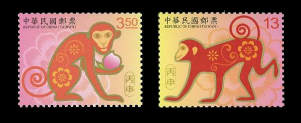 台湾中华邮政第四轮生肖猴票的图案延续了该系列的设计风格,以金色及橘色展现生肖动物的活力。灵动俏皮的猴儿以花朵图案妆饰,传递猴年吉祥、喜庆的欢乐气氛,背景温暖、活泼的橘色及桃红色搭配牡丹花图案,象征猴年花开富贵,财源广进。图案简介如下:
