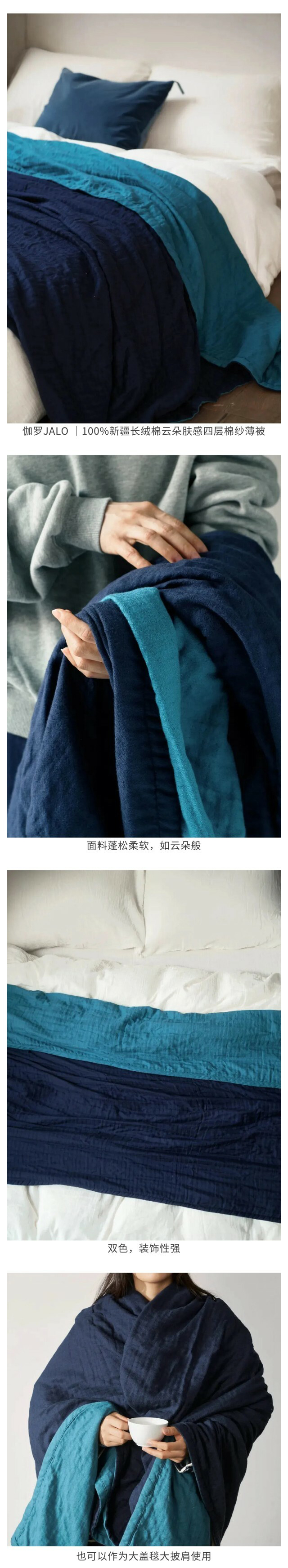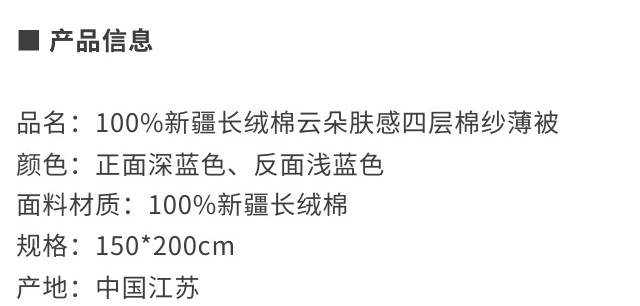 伽罗 JALO 100%新疆长绒棉云朵肤感四层棉纱薄被
