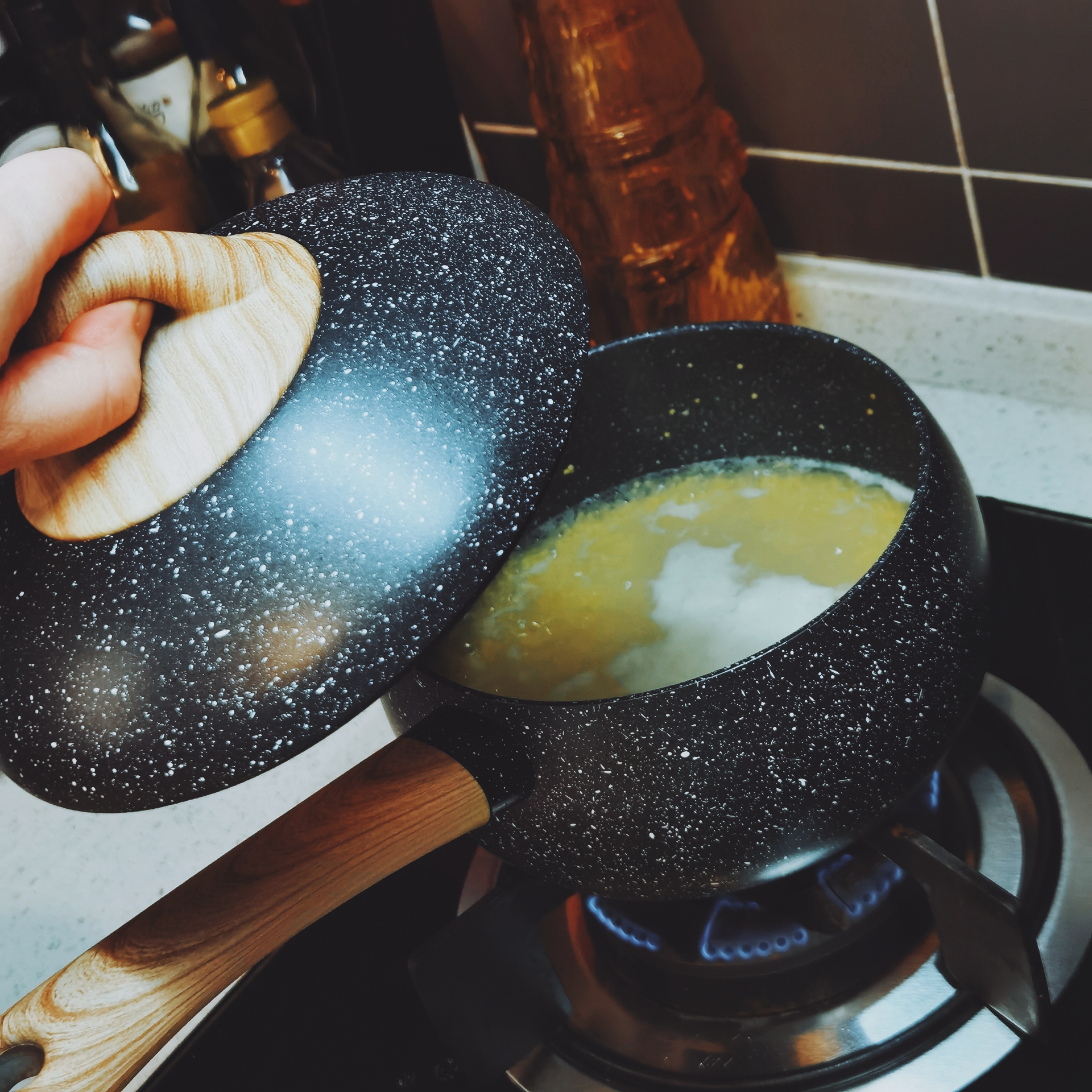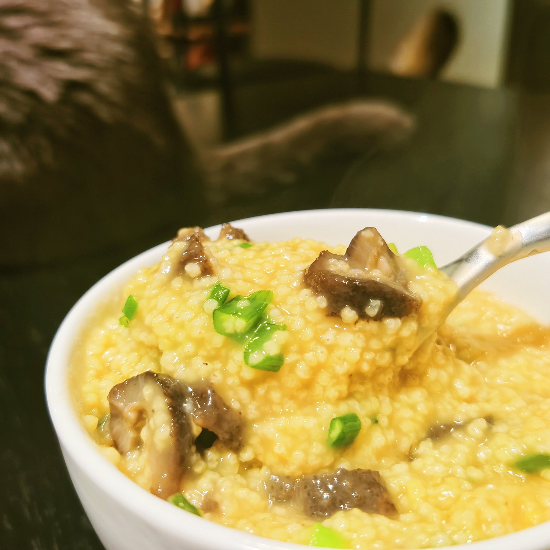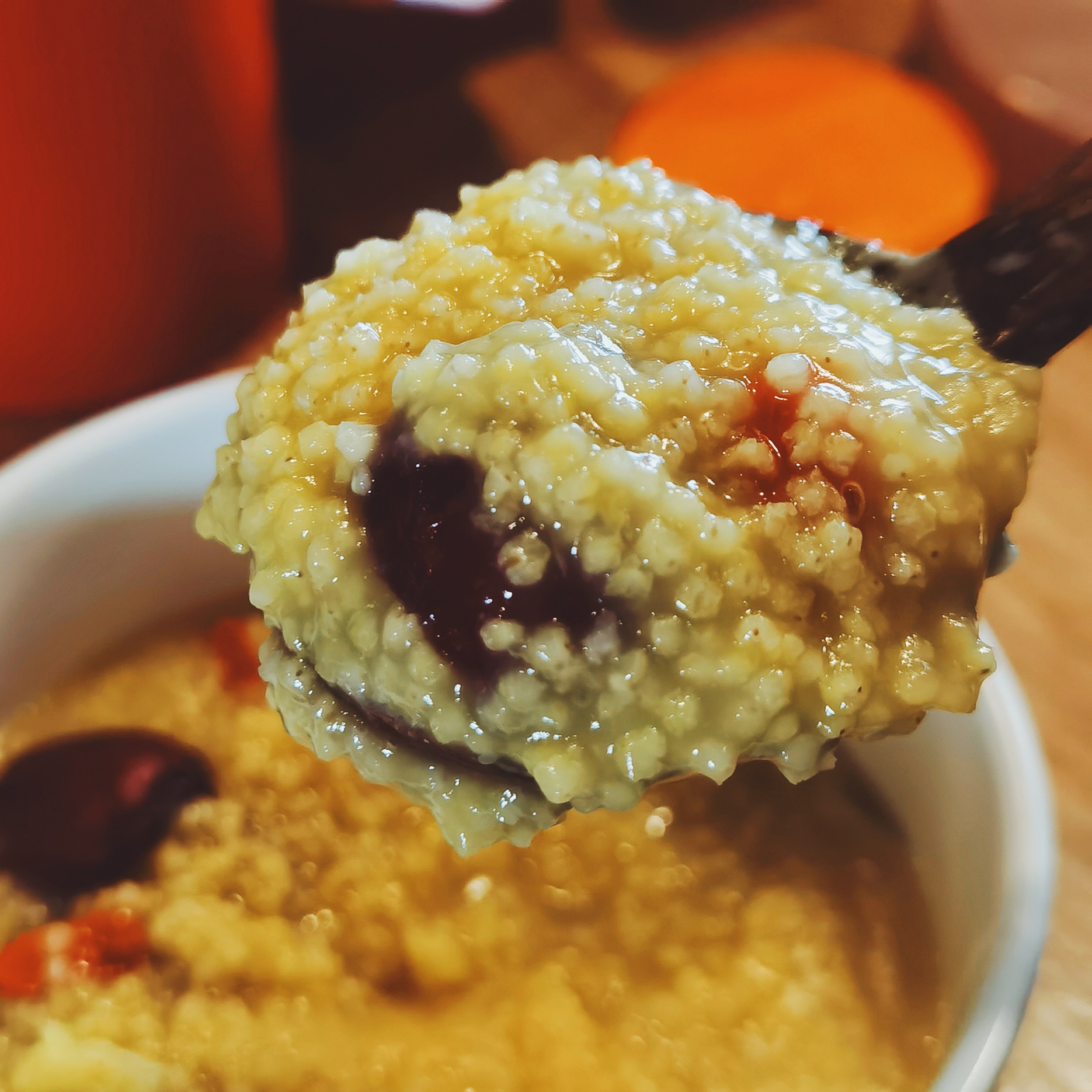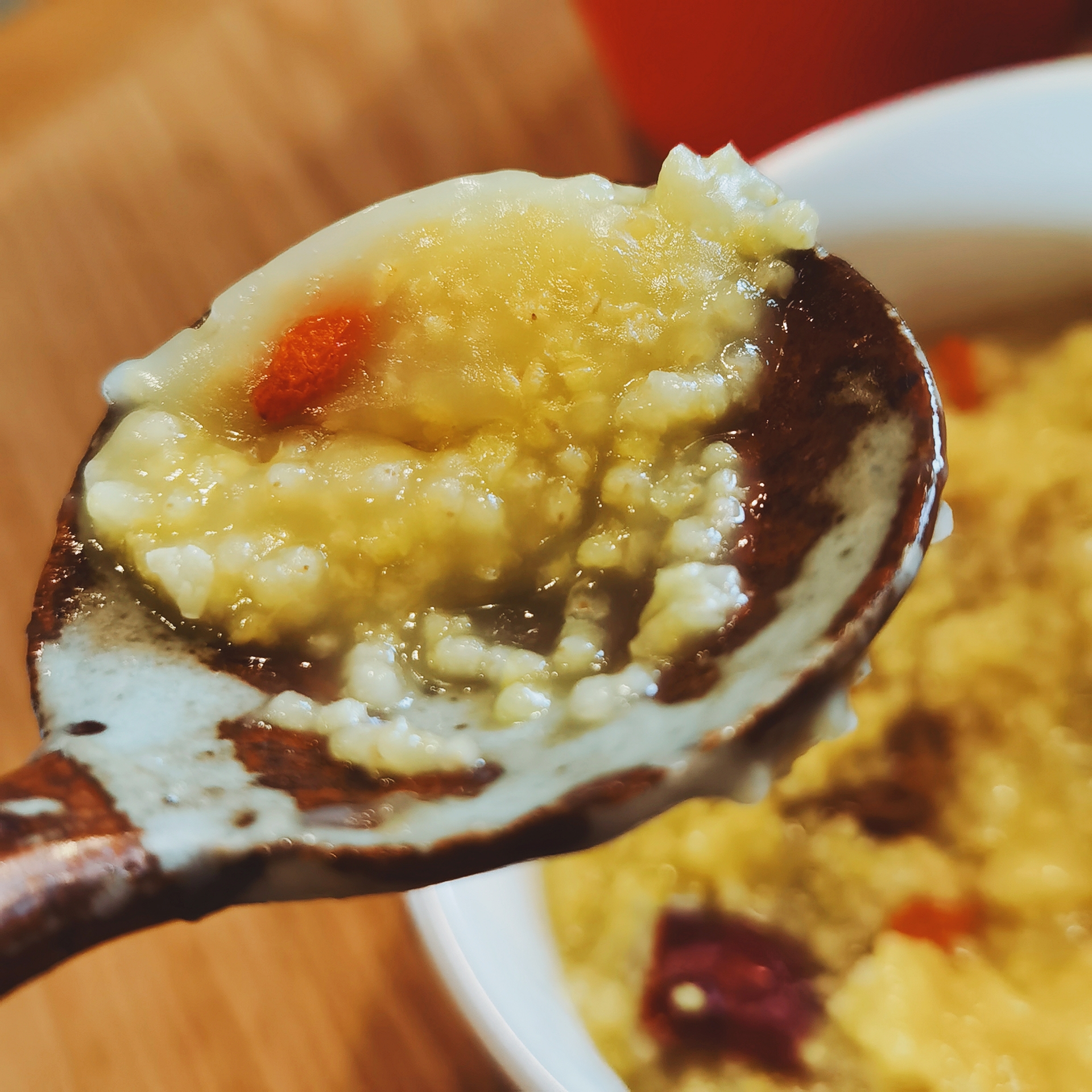 我之前也跟大家介绍过要熬出一锅养人小米粥是有小秘诀的:小米收到后无须清洗,米跟水的比例为1:12,一定要等到锅里水烧开后,再放入小米,慢煮30分钟,期间不时用勺子搅拌一下,防止粘锅,当然也可以选店里破壁机或者珐琅锅来煮,煮出来的小米粥会更醇厚。煮粥时米汤熬到很浓很浓,就有一种特别的香味,稍一冷却,表面可以揭起三层油皮。大家可以根据口味放其他辅料,喜欢吃甜口的就放点红薯、红枣、枸杞、南瓜之类的,喜欢吃咸口的我推荐放海参!