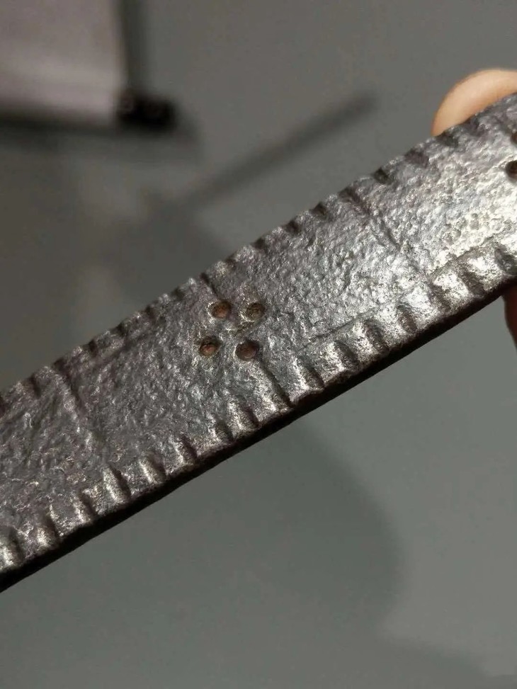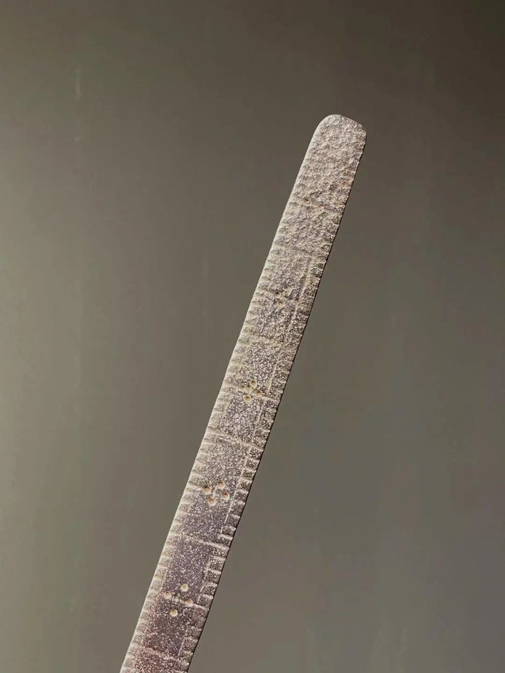 老铁量尺铸造成长条尺状,长尺一面琢磨良尺刻度,刻度精准细腻,典雅贵气,底面光素无纹,老铁包浆醇厚。