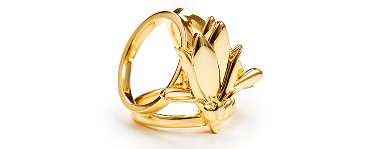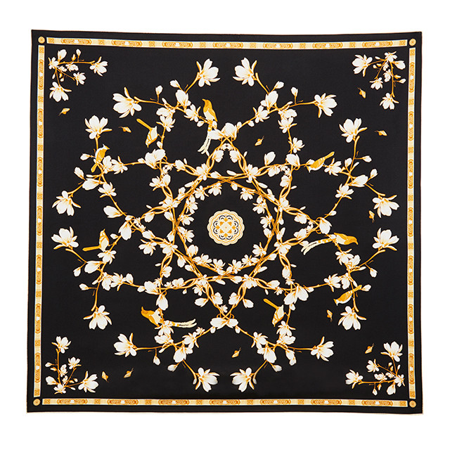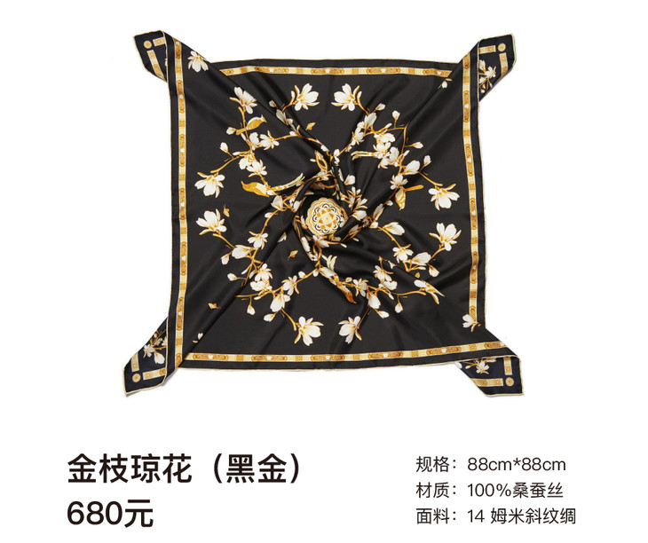 故宫.玉兰丝巾系列之"金枝琼花"描绘图案工致华美,满树玉兰花之仰俯姿势、阴阳反侧,在饱满端庄的形象间尽显中华民族的雍容气度。花枝绘制在做几何旋转的同时,抛弃了简单的复制方式,而是以玉兰树自然的生长状态进行穿插组合,从而使满树的金色花枝更为生动鲜活,繁复而优雅。在传统与现代、现实与意境、自然与规整之间完美结合。