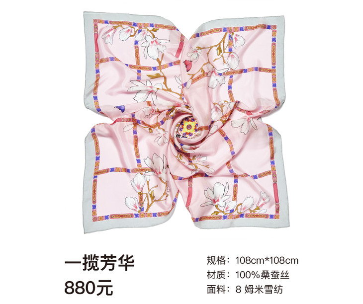 “一揽芳华”系列以选的薄透如蝉翼的真丝乔其进行演绎,选择最为明艳纯洁的粉色,营造出少女般的柔嫩与娇贵,作为一款时尚的夏季丝巾,可体验到薄丝滑过肌肤的亲柔感觉,这几乎是一款自带玉兰花香气的贴心之物,将故宫最为浪漫的一面展示给深爱她的人们。图案设计则选择了故宫宫殿建筑中最为独特的的"藻井"装饰结合故宫博物院藏画中的玉兰与花鸟,用复刻与连续等重新组合的手法来构思整体图案,可谓别具匠心。