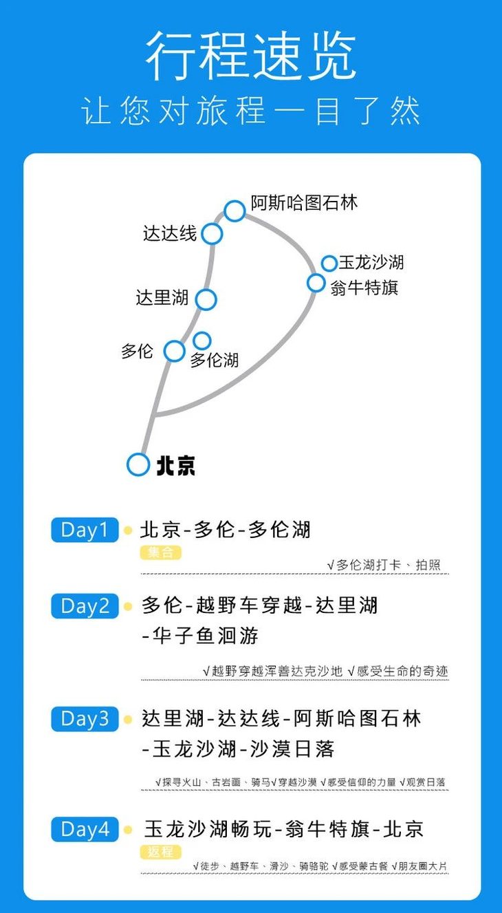 注:行程内时间都为计划时间,如遇恶劣天气、堵车、景区管控等情况,具体行程由领队安排。