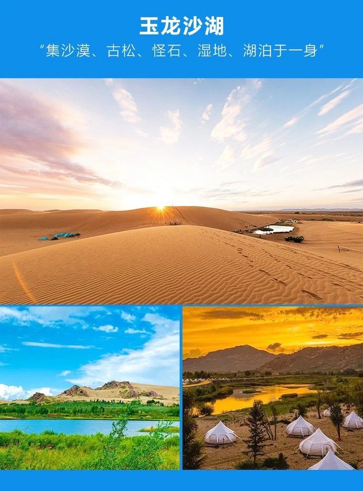 13:00游玩结束后,我们集合出发,前往【玉龙沙湖】(车程约3.5小时)入住景区内集装箱酒店,超大落地窗将茫茫的沙海风光尽收眼底。玉龙沙湖拥有中国独特的“白沙漠、红砂岩”,震惊国内外的“中华第一龙”也在此被发现,集合了湖泊、沙漠、草地、沼泽、山林等各种景观,是观赏自然奇景的好去处。