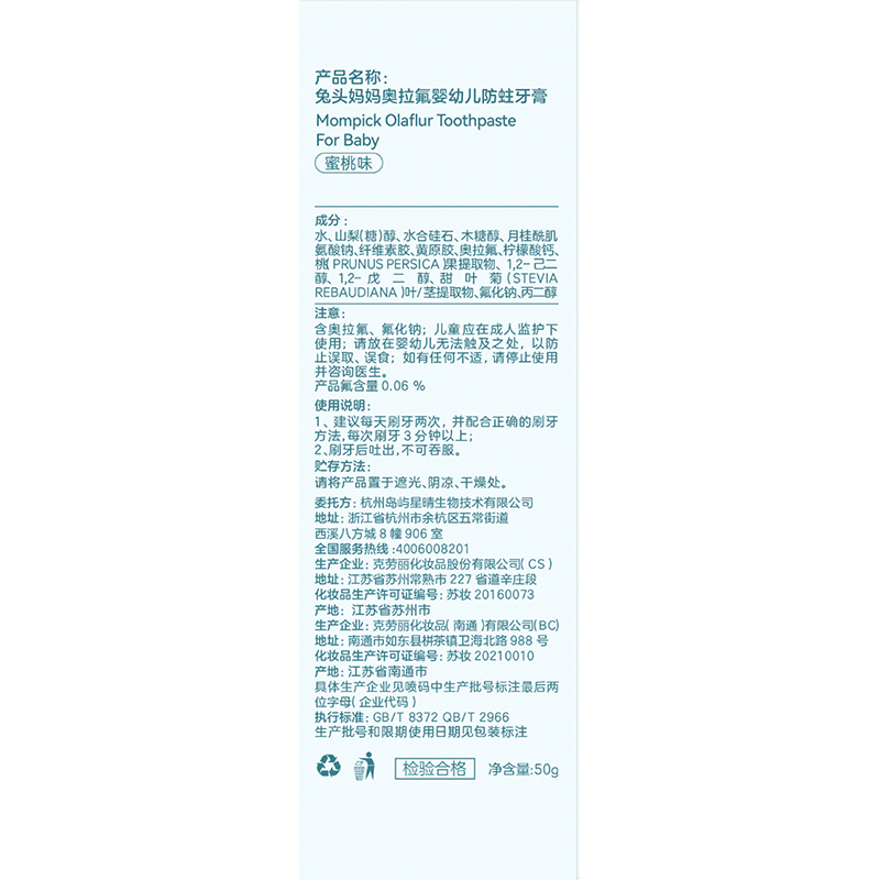兔头妈妈奥拉氟婴幼儿防蛀牙膏1-3岁50g(蜜桃味/草莓味)