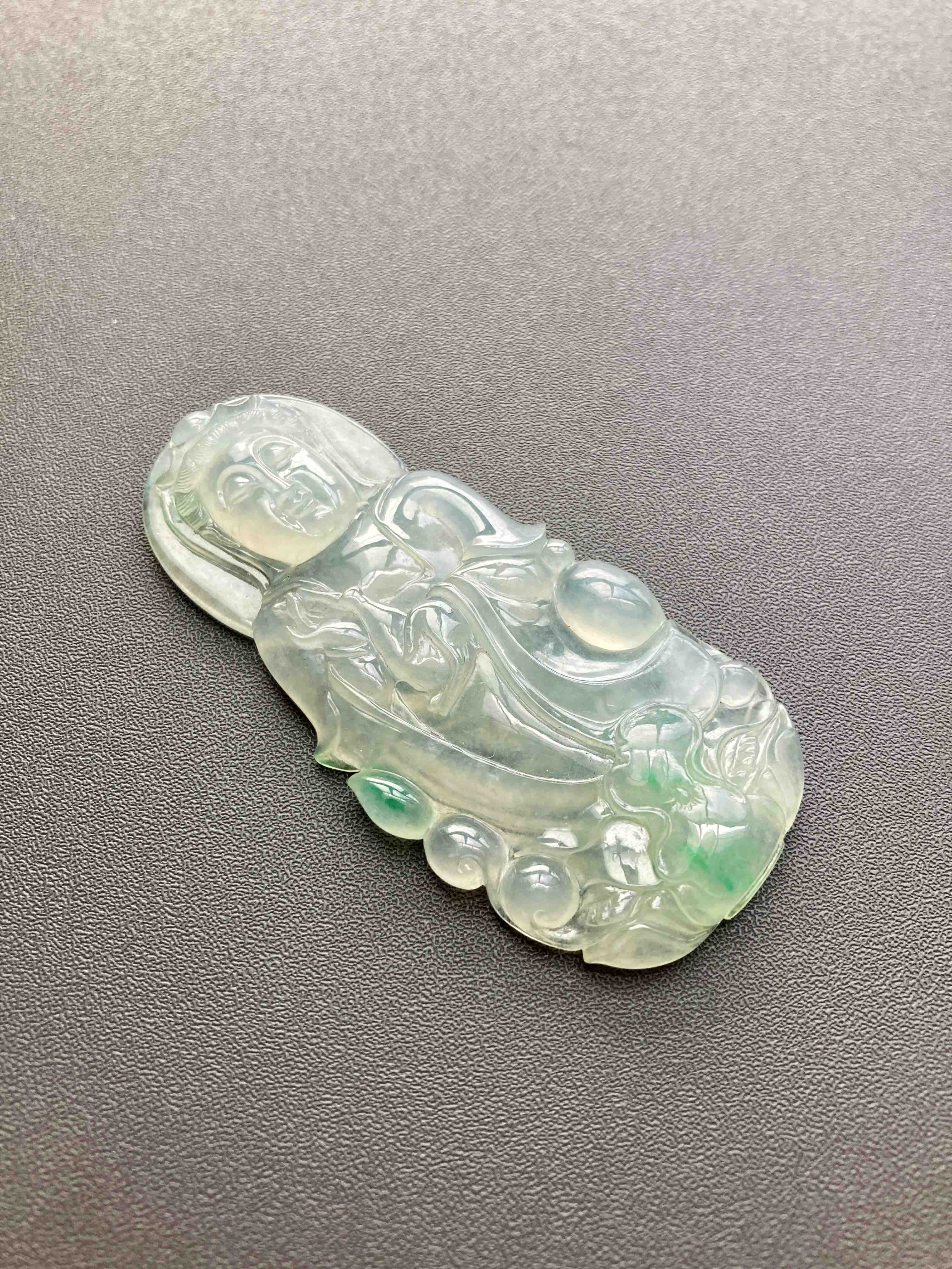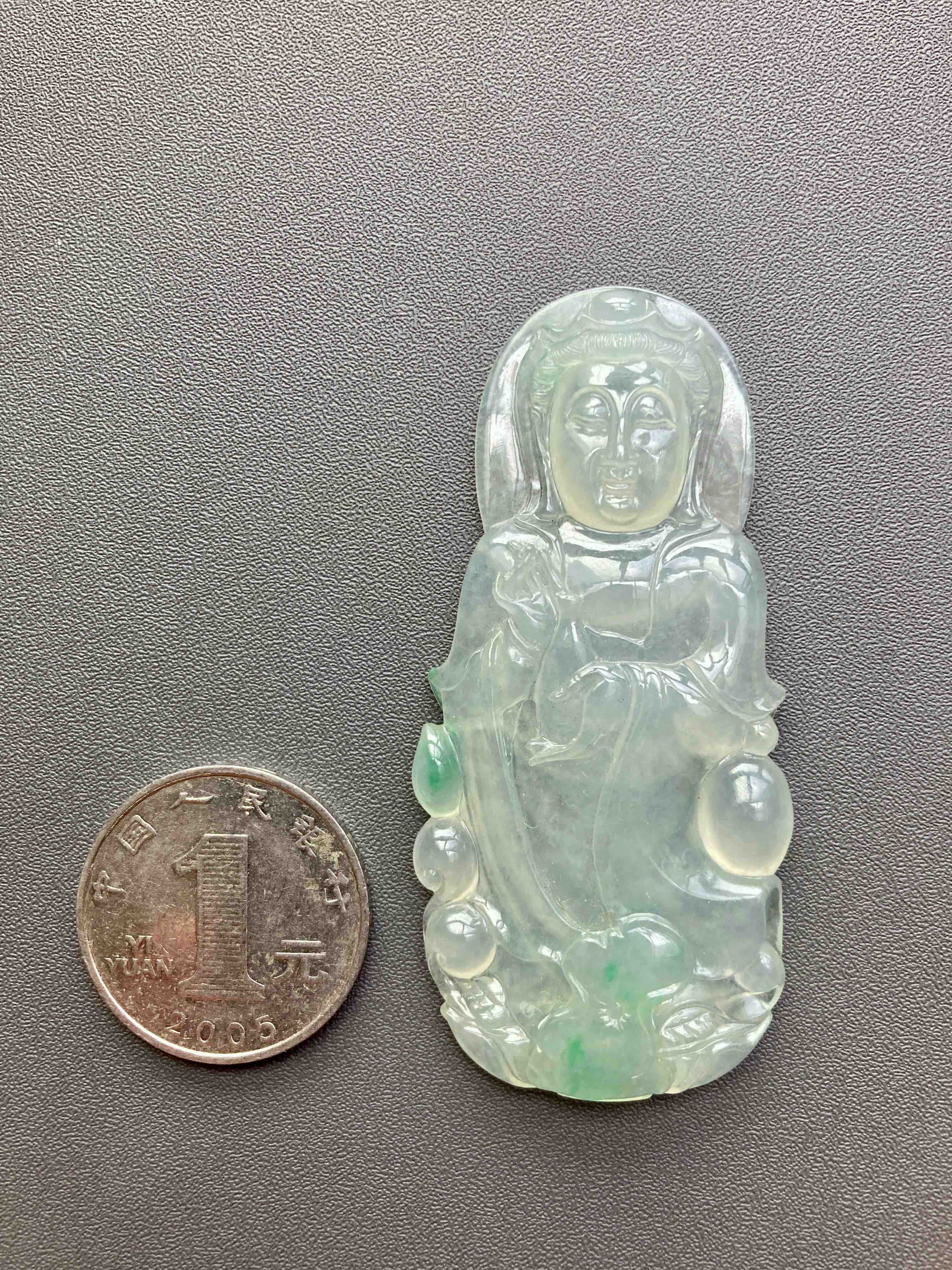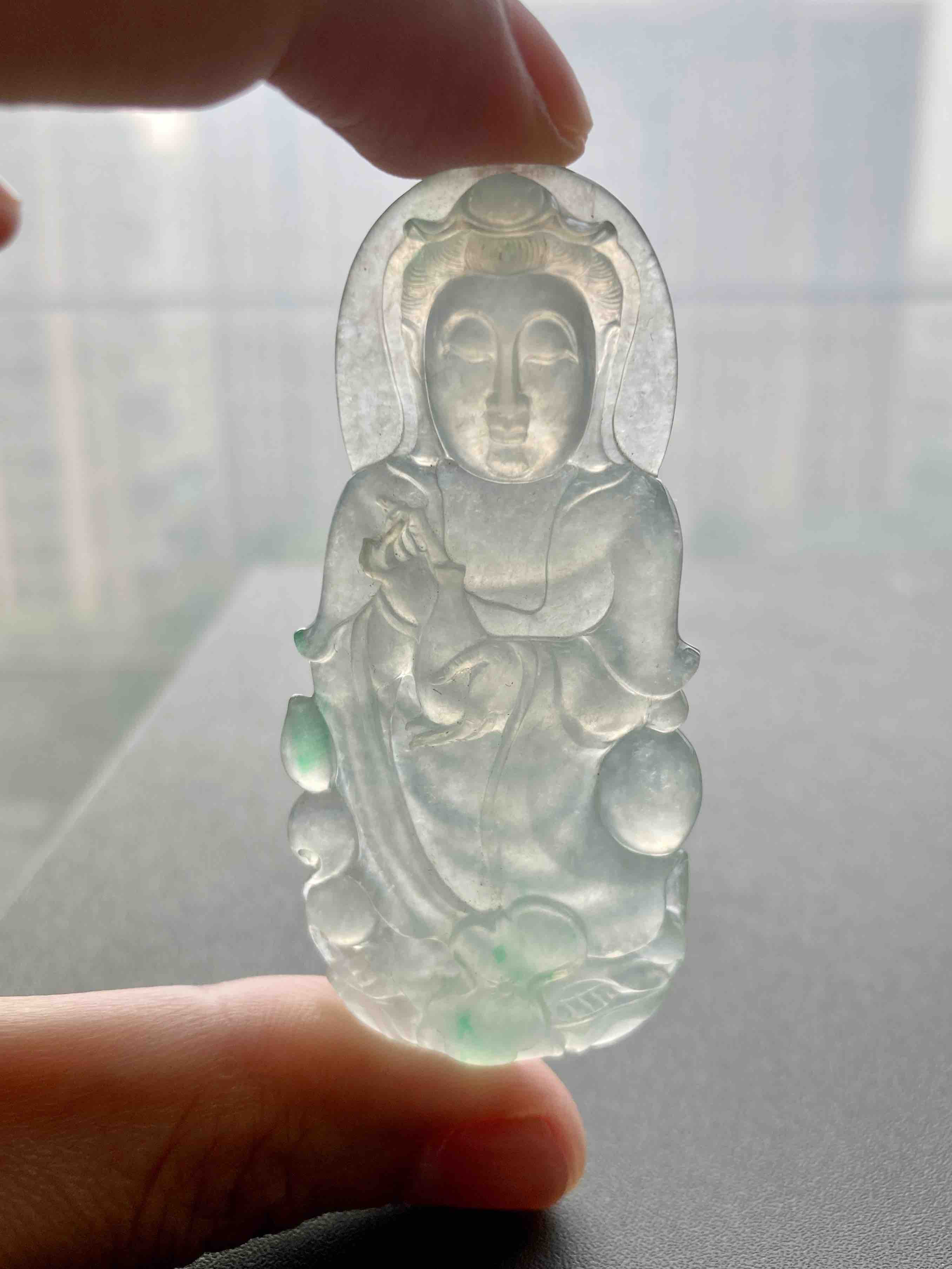 久违的男士大件福利,冰种飘阳绿翡翠大观音,男戴观音女戴佛,保平安,种水晶莹剔透,阳绿艳丽灵动,手工精雕,长度过60,厚度有7,秒杀市面上那些观音的规格,让你体会这才是真正大件,