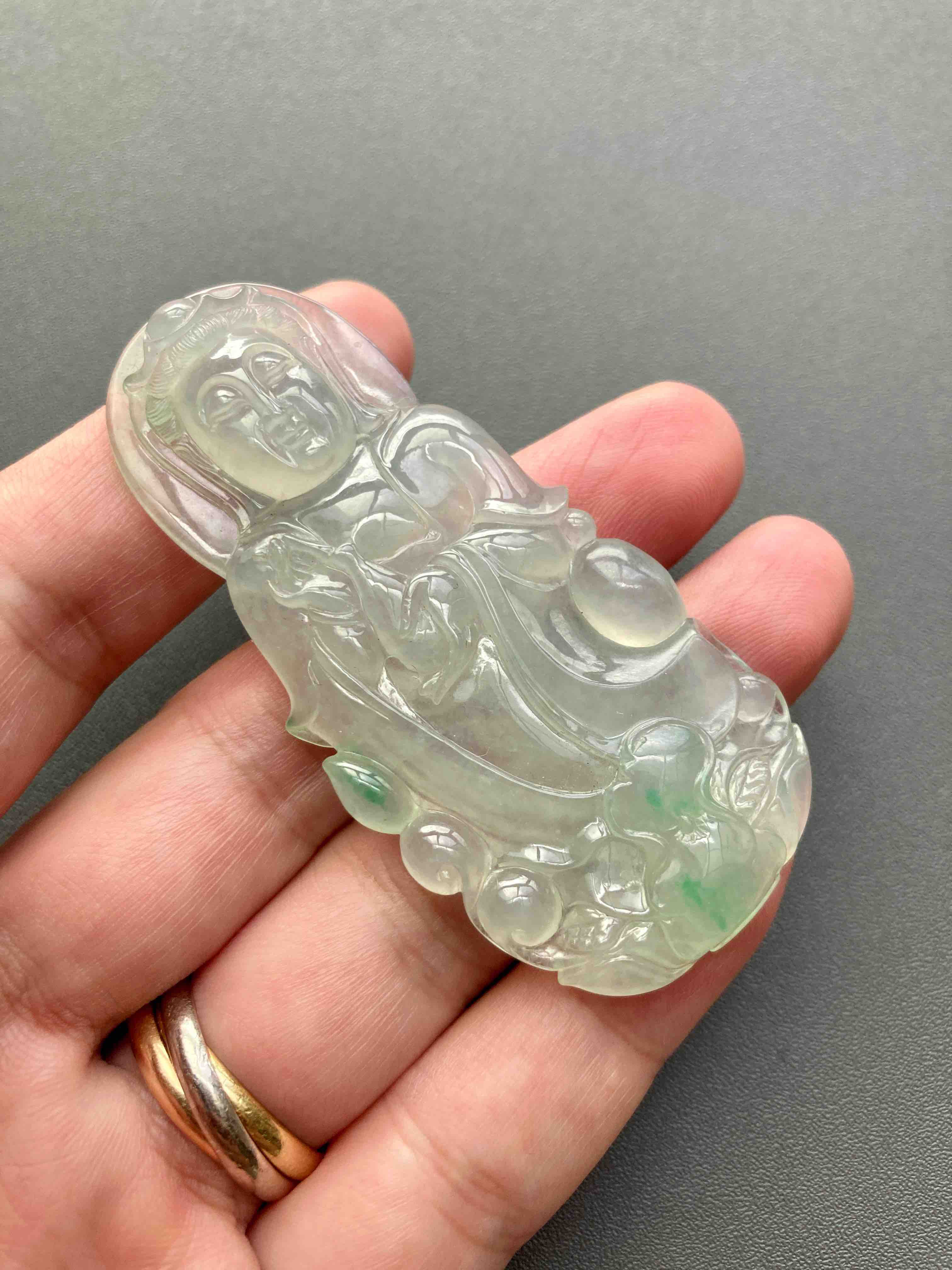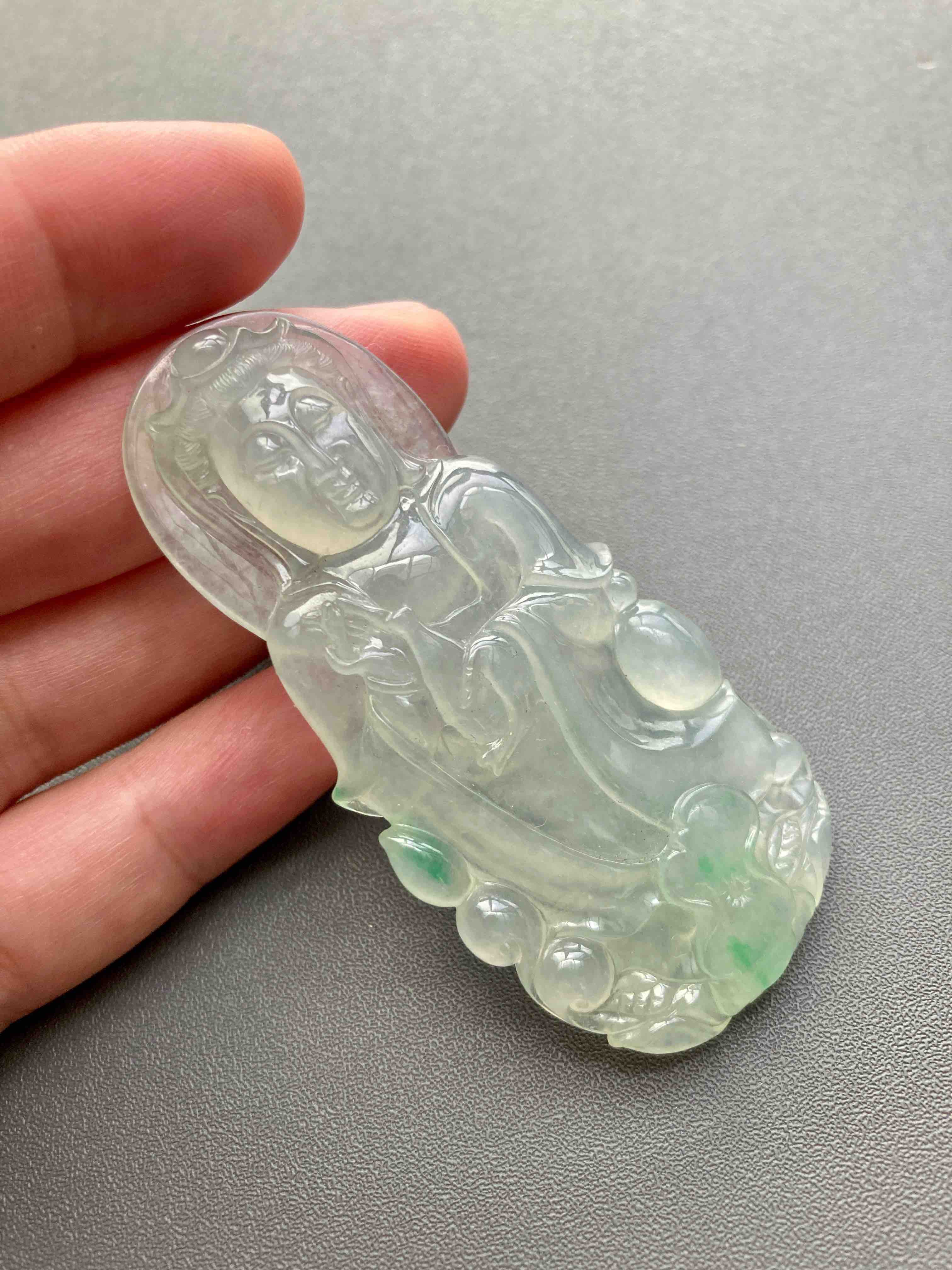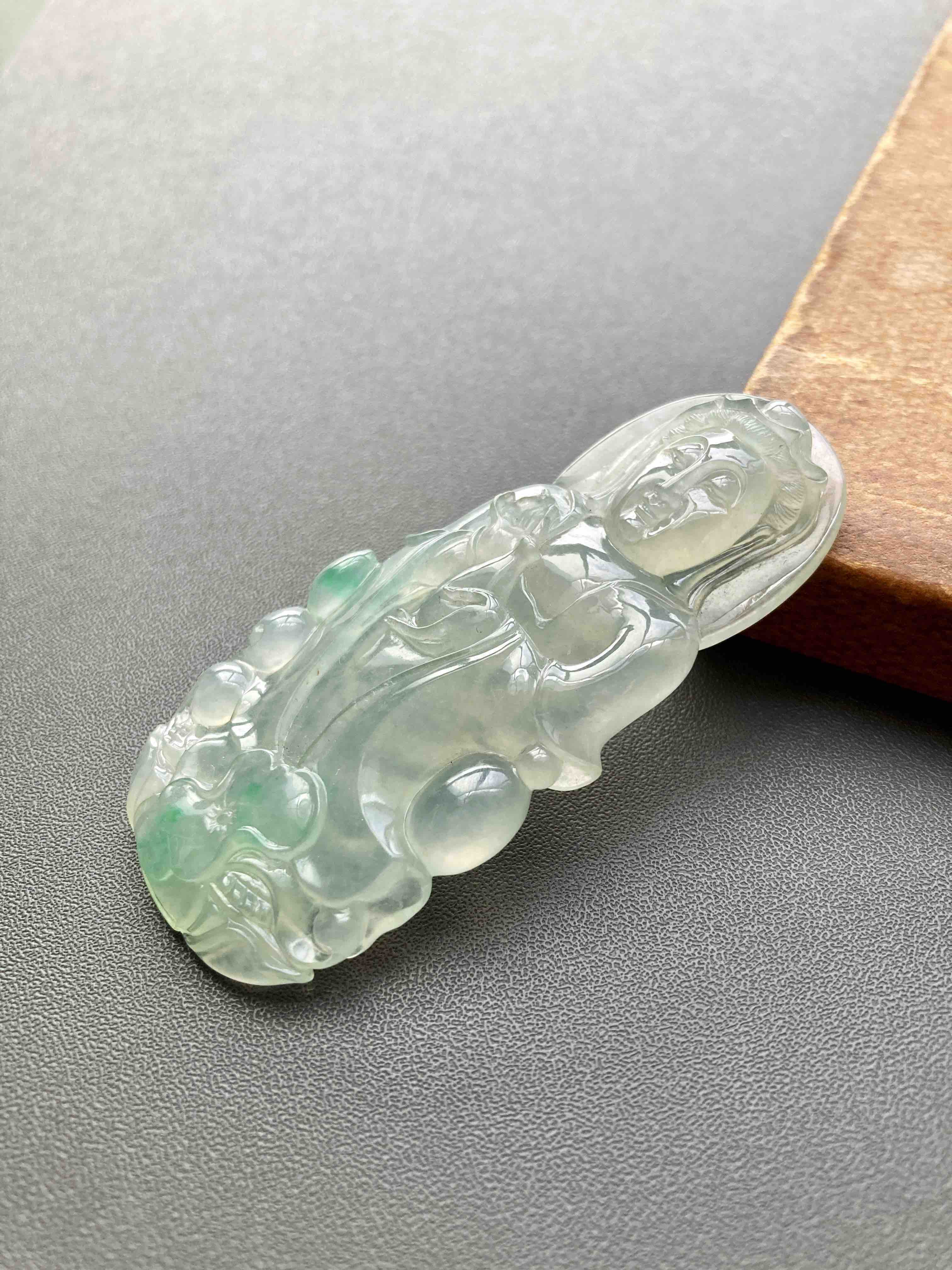 久违的男士大件福利,冰种飘阳绿翡翠大观音,男戴观音女戴佛,保平安,种水晶莹剔透,阳绿艳丽灵动,手工精雕,长度过60,厚度有7,秒杀市面上那些观音的规格,让你体会这才是真正大件,