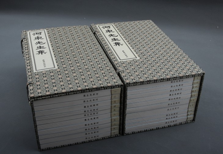《河东先生集》是唐代古文大家、著名诗人柳宗元的诗文集。柳宗元(公元七七三年—公元八一九年),字子厚,汉族,河东(现在山西芮城、运城一带)人,唐宋八大家之一,唐代文学家、哲学家、散文家和思想家,世称“柳河东”、“河东先生”。柳宗元与韩愈并称为“韩柳”,在中国文学史上的地位不言而喻。后人对两人的著作的研究也层出不穷,对两人的作品集,历代流传下很多版本,其中柳宗元的《河东先生集》有宋咸淳年间宋廖莹中编注并刊刻世彩堂刻本,与韩愈的《昌黎先生集》并称宋版书中的“无上神品”,深受藏家的追捧和宝爱。《河东先生集》和《昌黎先生集》,都是由南宋咸淳(一二六五~一二七四)年间廖莹中世彩堂所刻,两集为海内外孤本,字体版式全同,俱半叶九行,行十七字,小字双行,细黑口,四周双边,版心上镌字数,下刊刻工名,下鱼尾下方镌“世彩堂” 三字。各卷后有篆文“世彩廖氏刻梓家塾”牌记。书中刻工有孙沅、钱珙、翁寿、元清、从善、同甫李文、冯奕之等,亦同见于两集,可知两书是同一时间开雕。原本用抚州萆钞清江纸,油烟墨印刷,用料雕工极为上乘。书中避讳谨严,宋讳慎、敦、廓等字均缺笔。《藏书纪事诗》引证《持静斋书目》话说:“《河东先生集》,宋廖莹中世彩堂精刊本。相传刊书时用墨皆杂泥金香麝为之。此本为当时初印,纸宝墨光,醉心悦目。”此书和《昌黎先生集》犹如孪生,一向被称为宋本“双璧”,传世或合或分,观诸藏印,其分合之迹,显然可辨。《河东先生集》有项氏万卷堂图籍印、项墨林鉴赏印、天籁阁项元汴印、项笃寿印、牧翁鉴定、商邱宋荦收藏善本、纬萧草堂藏书印、沈鸿祚印、载猷等印。两集明代同藏项氏万卷堂。《河东先生集》由项氏入宋至纬萧草堂,由宋入沈氏,近代归潘氏宝礼堂,由潘氏而归陈清华所有。作为与周叔弢先生齐名的大藏书家,陈清华藏书受南海宝礼堂潘宗周影响,尤嗜宋元旧椠、明清精抄、名人校跋之本。所藏毛钞、黄跋品种之多,非同侪藏家能比。陈氏藏书初无名,因得宋廖莹中世彩堂刊《河东先生集》,后又访得潘氏宝礼堂藏有廖刊《昌黎先生集》,乃不畏周折,以重金购归插架,使两部绝妙宋刻珠联璧合,传为书林佳话,成就藏书家之宏名。两集现入藏国家图书馆。世彩堂《河东先生集》共四十五卷,外集二卷、外集补遗一卷、龙城录二卷、附录二卷,集传一卷。全书按文体分类,体例明晰。其中外集补遗、龙城录、附录、集传为明嘉靖时期郭云鹏济美堂翻刻宋廖氏世彩堂本。外集后有郑孝胥的手书诗体题跋。全书字体隽秀,刀法剔透,纸莹墨润,字体在褚柳间,精雅绝伦。南宋后期咸淳前后,因边关兵患加之南宋政府内部朝治倾轧,使得国势已呈衰落之象。此种社会氛围之下,而能产生出如此铭心绝品之作,一者与廖莹中身为贾似道门客,能雇用优秀刻工和使用上等纸墨印刷书籍有关;二者也与廖莹中自身的文化修养相关,此两集均经廖莹中手自校正。《河东先生集》于民国初年由罗振常缩印,郑孝胥曾题诗一首做跋文,开本较小,印数极少,流传亦不多,也是因为是缩印,因此收藏的价值不高,此后书林再无印制。己亥仲夏,扬州古椿阁为满足广大线装书爱好者的收藏之需,联合凤凰出版社(原江苏古籍出版社),共同策划,根据国家图书馆藏南宋咸淳世彩堂《河东先生集》原版原大尺寸影印,全手工古法制作,限量发行,收入第四批古椿阁再造善本丛刊,意图让这一中华瑰宝放射出新的璀璨光芒。