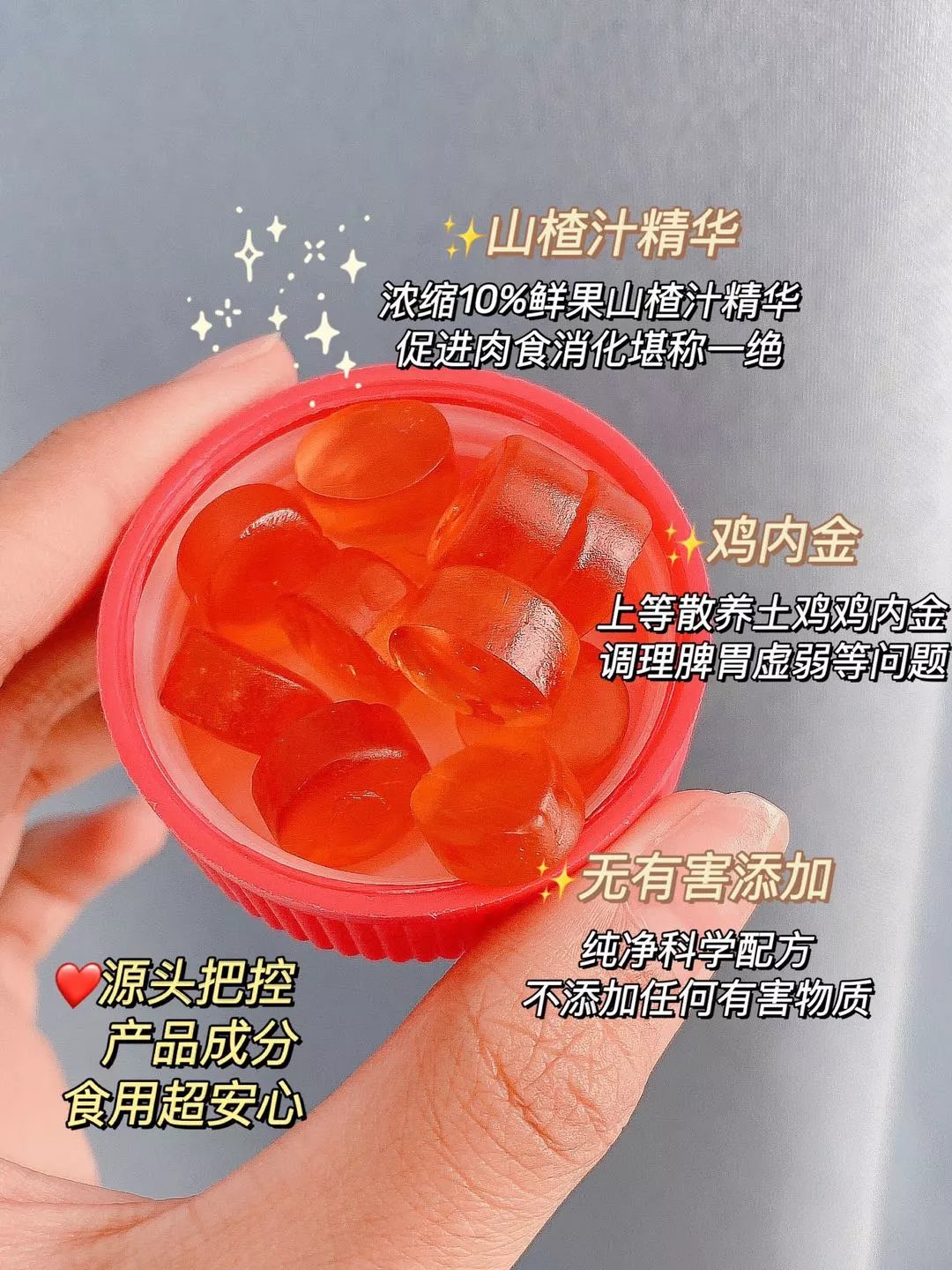 主要成分:山楂浓缩果汁、鸡内金提取物、维生素C果胶、麦芽糖醇液