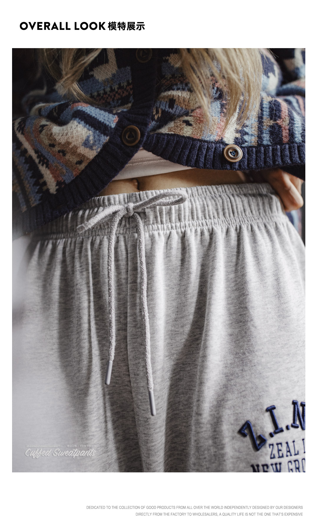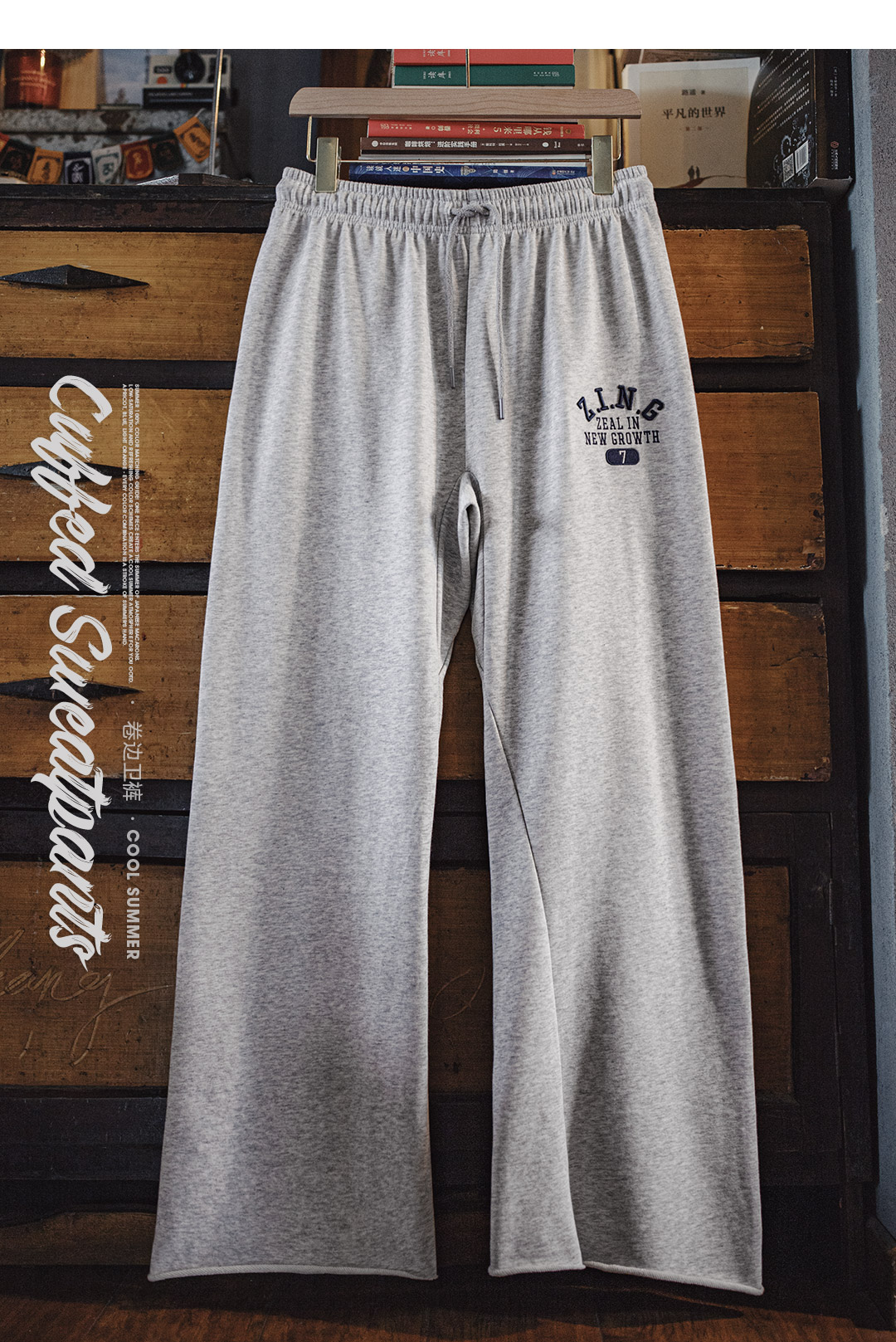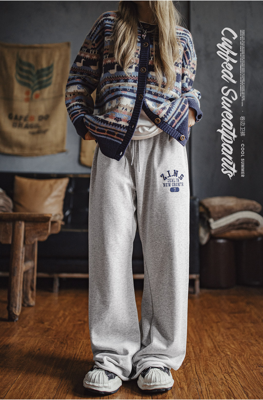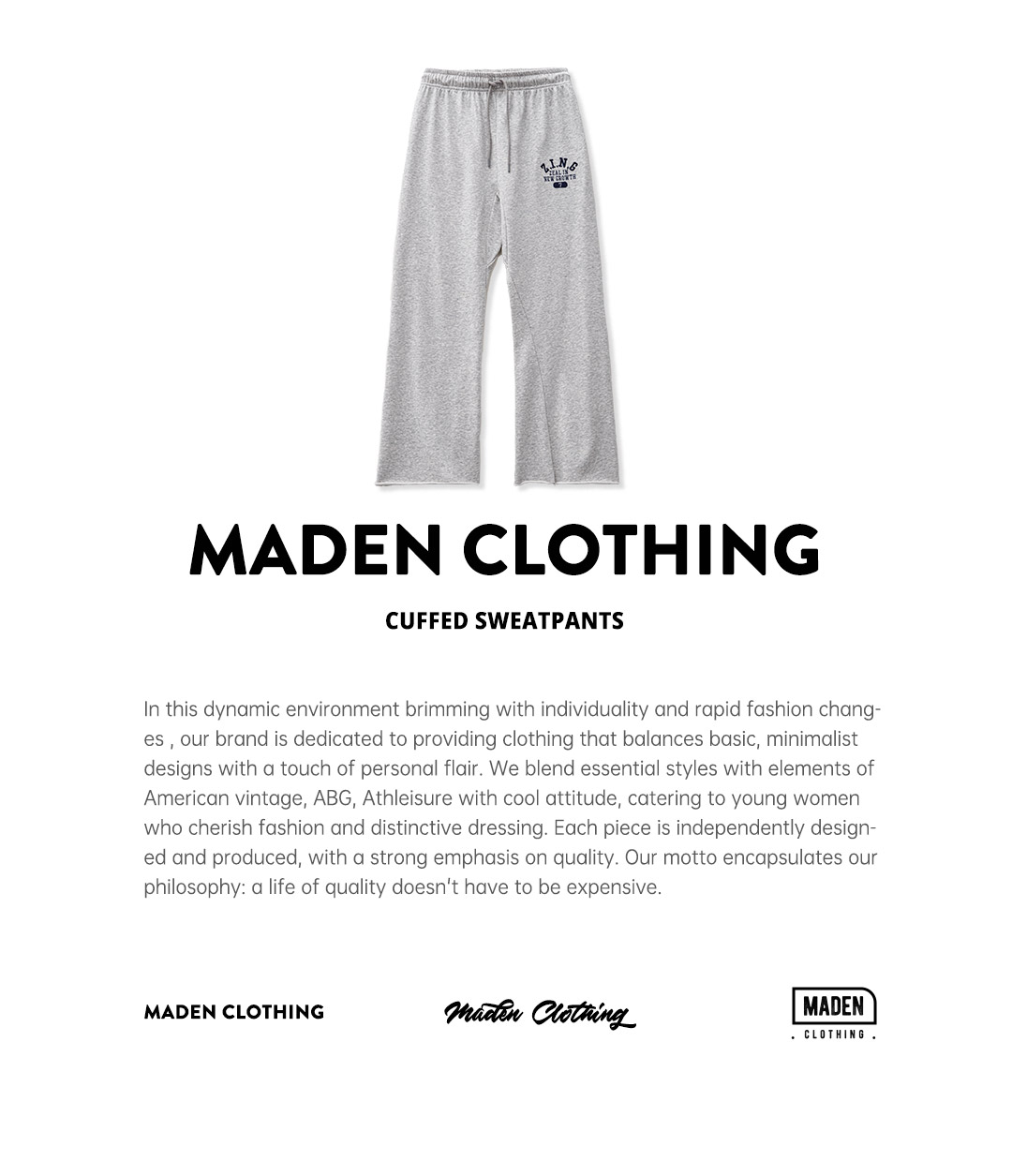 马登2025新款白花灰色高腰直筒阔腿卷边抽绳运动休闲卫裤女士秋季