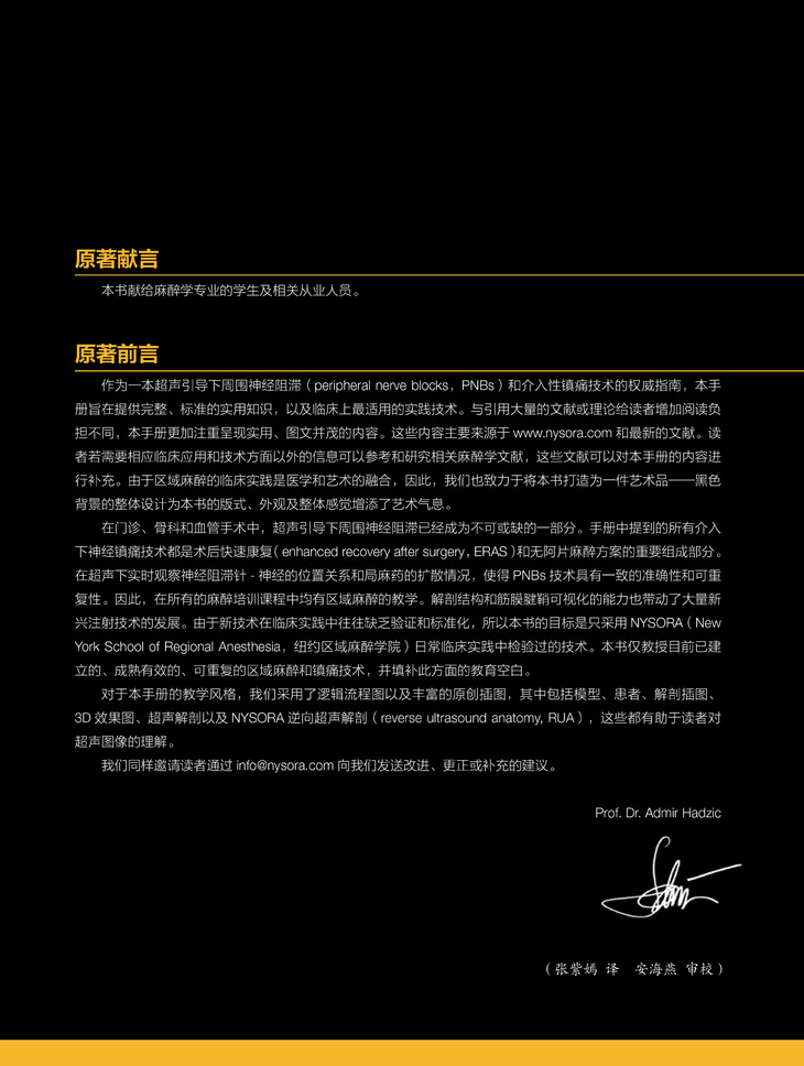 本书为纽约局部麻醉学院Admir Hadzic教授最新出版的图书,Hadzic教授是局部神经阻滞的全球知名专家,目前出版了多本该领域的著作,受到全球读者的好评。本书围绕周围神经阻滞这一核心要点,以实用性为指向,强调了快速入门的理念,方便临床操作中快速浏览和掌握要点。全书按头颈部、上肢、下肢和躯干部分为四个部分,共26个章节。全书图片精美,示意图精确精致,流程图简明扼要,文字精炼,是该领域一本有引进价值的图书。中文版翻译准确,质量高。