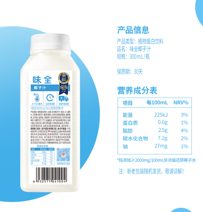 味全好喝椰 椰汁植物蛋白饮料300ml
