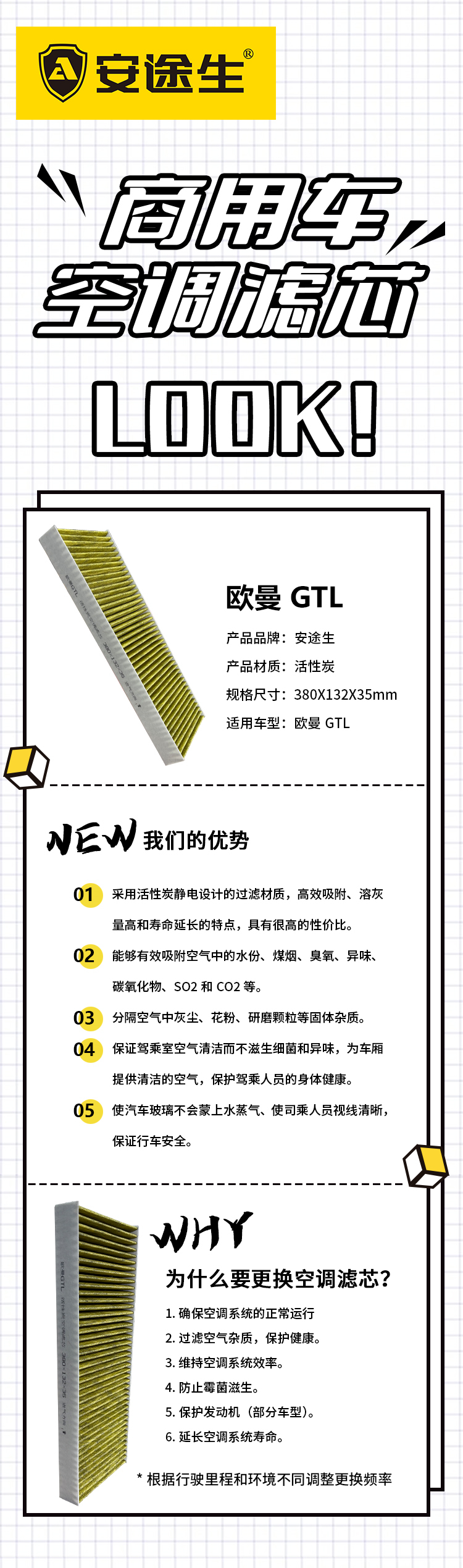 欧曼GTL活性炭空调滤芯长里程除异味防止霉菌商用车