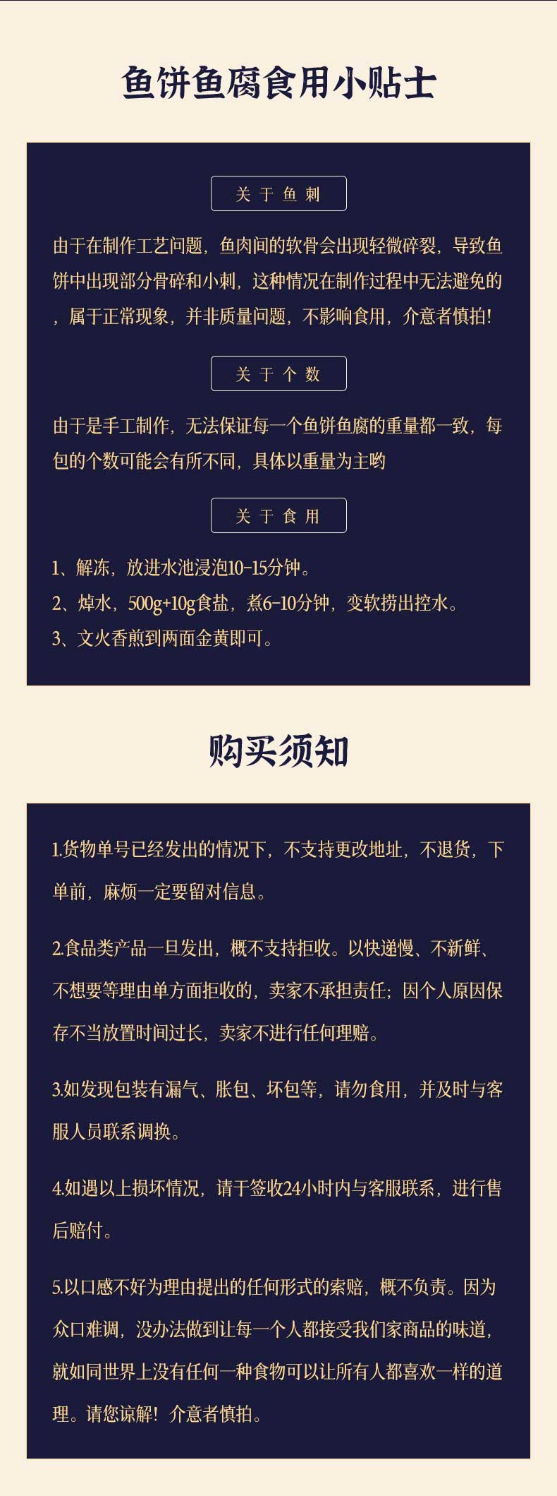 规格说明:鱼饼500g、鱼腐500g、鱼饼500g+鱼腐500g、鱼饼1000g、鱼腐1000g