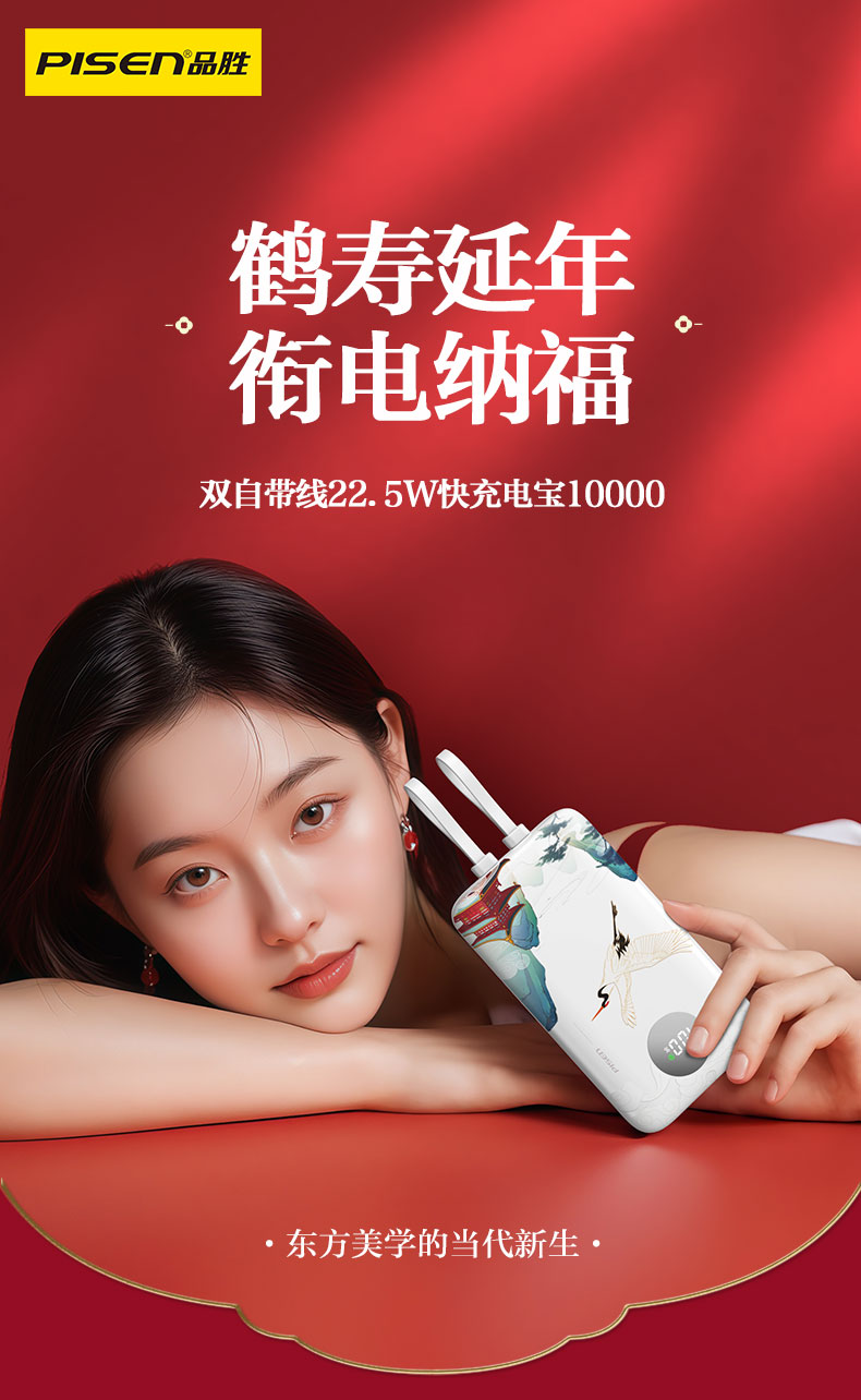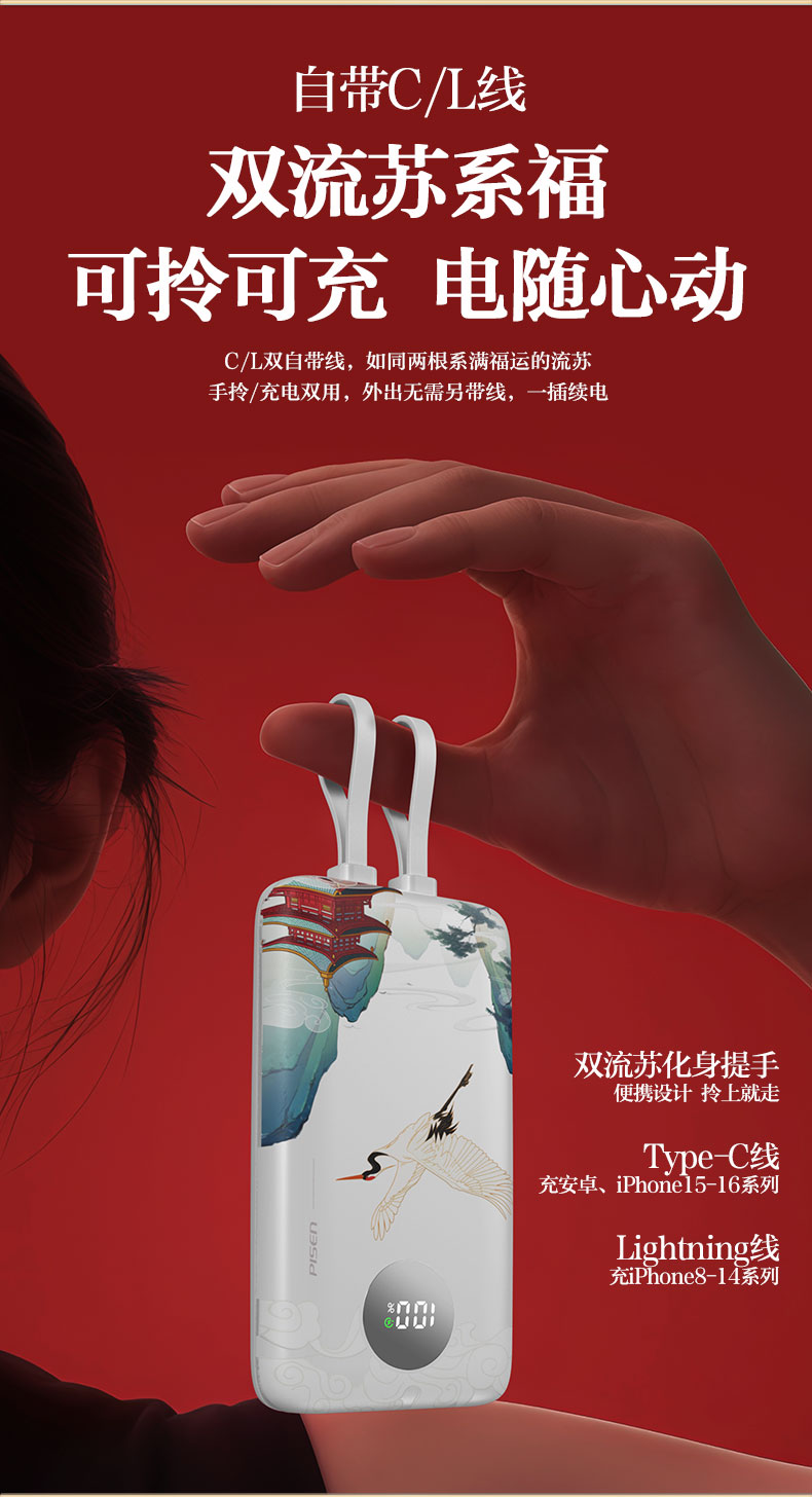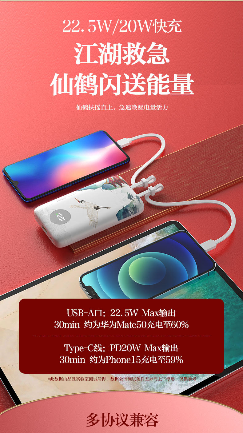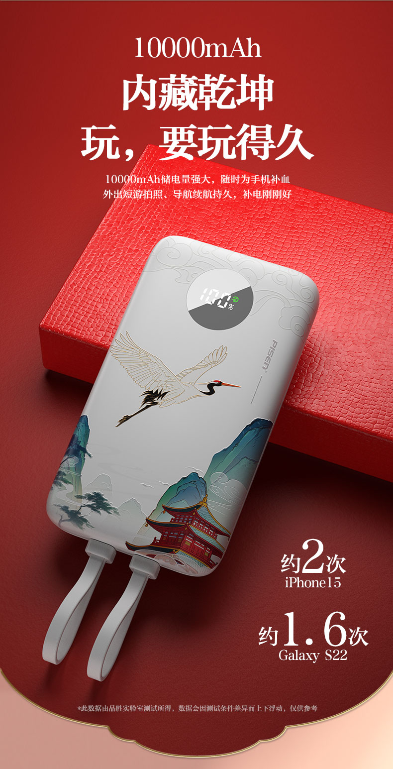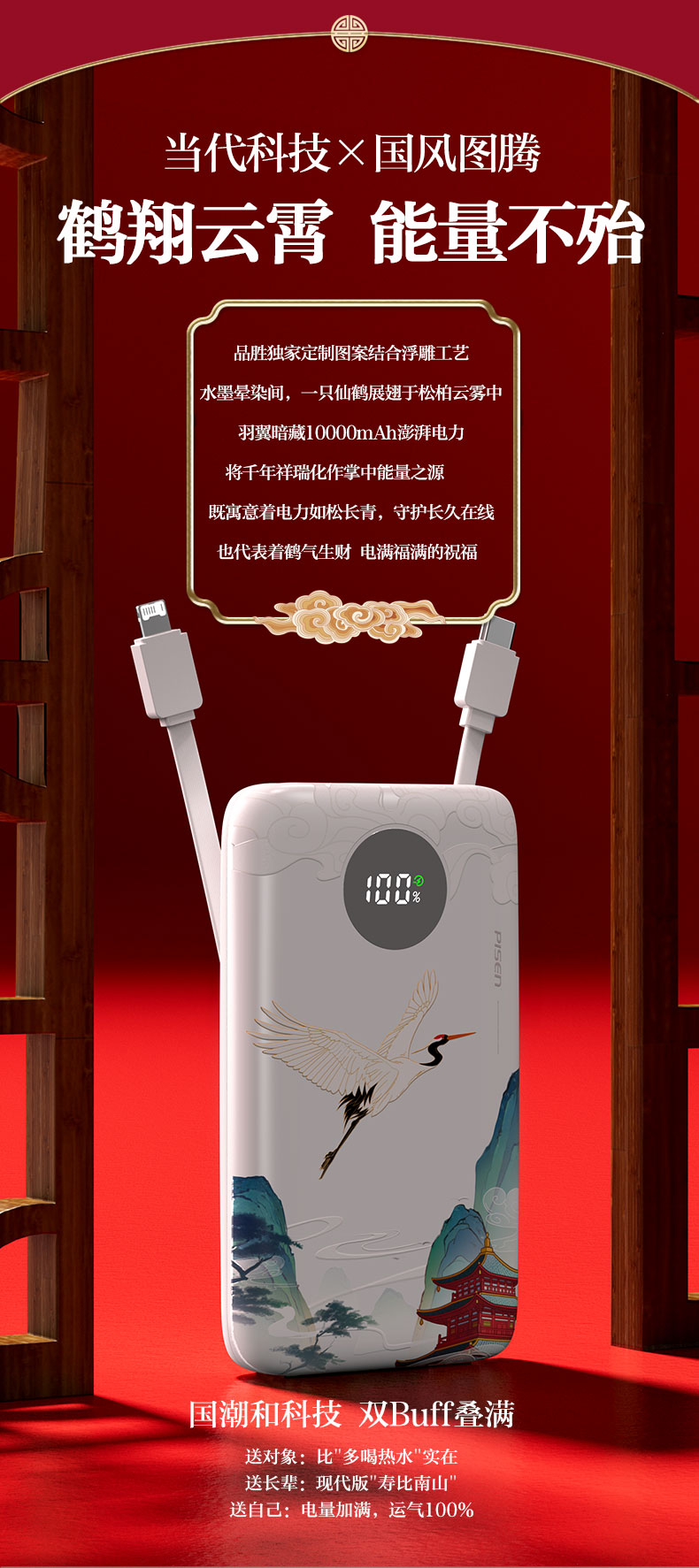 品胜 双自带线22.5W快充电宝10000(鹤寿延年) 自带Type-C/Lightning双线输出