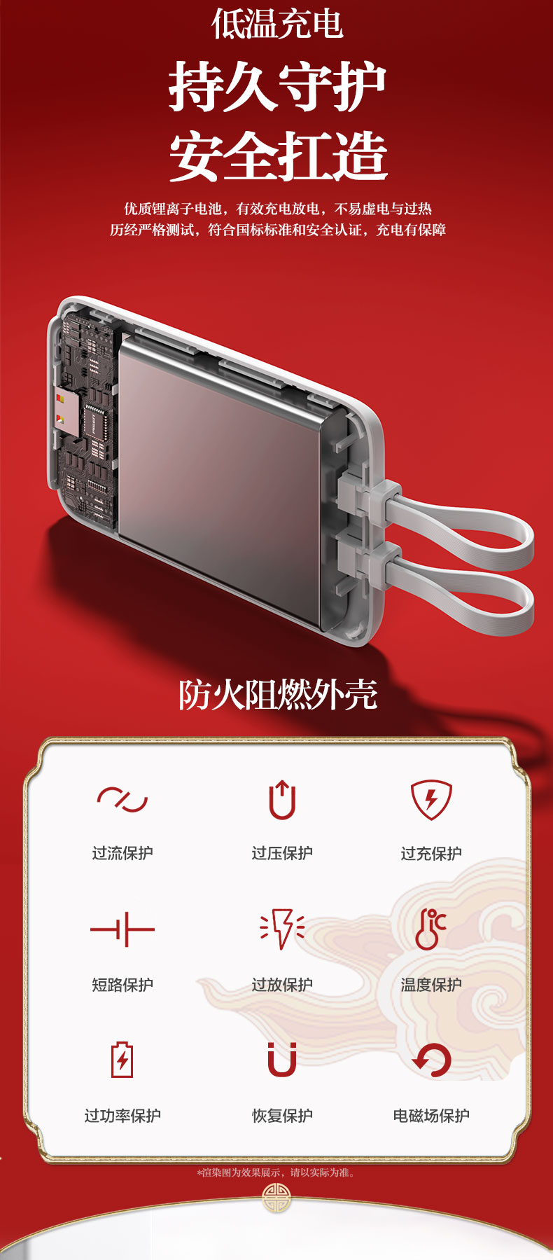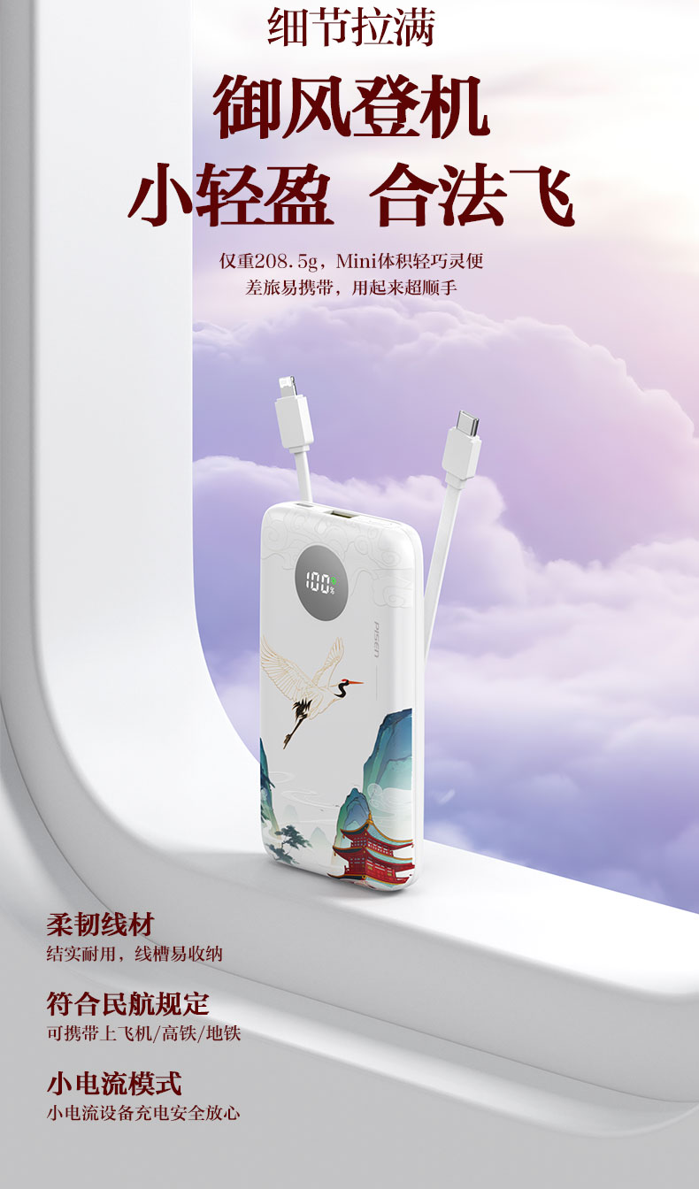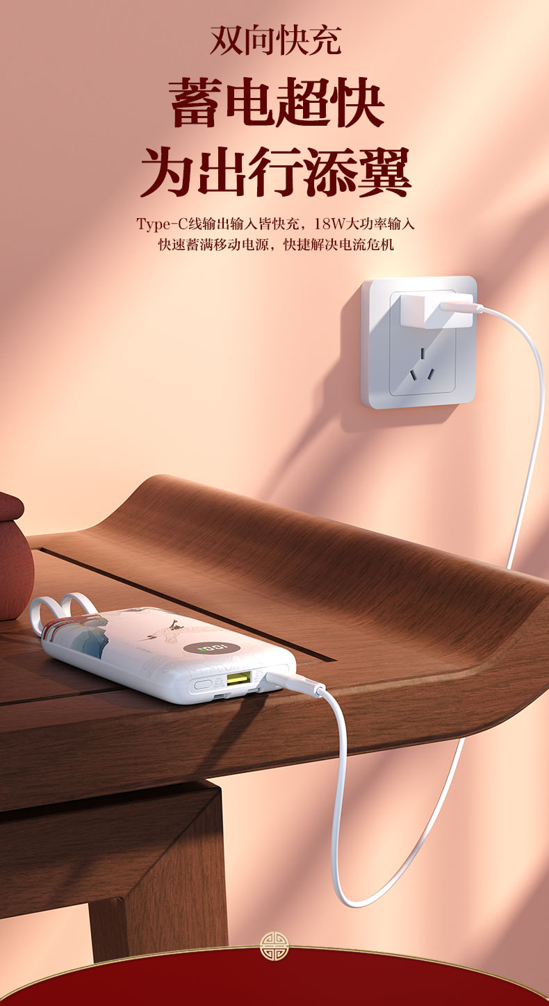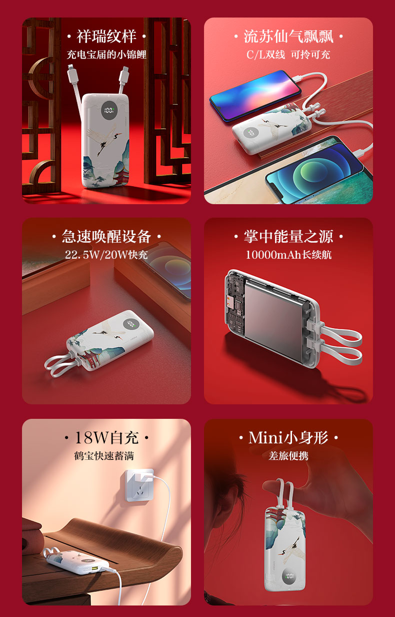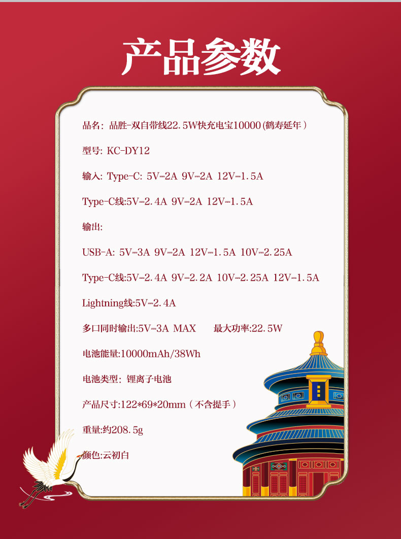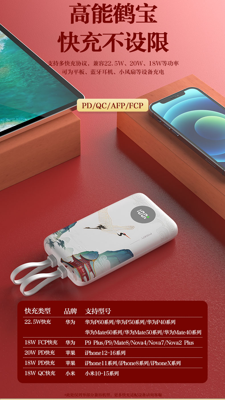 品胜 双自带线22.5W快充电宝10000(鹤寿延年) 自带Type-C/Lightning双线输出