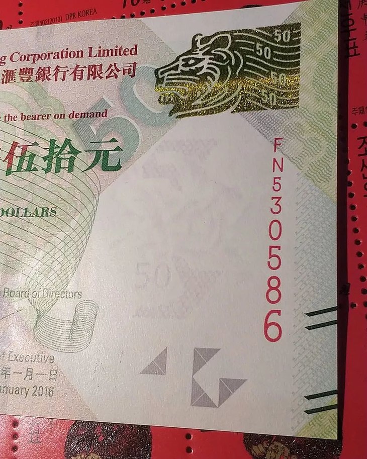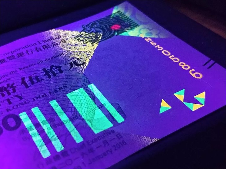 全球领先的防伪技术:动感变色图案、变色开窗金属线、隐藏银码、珠光图案、高透水光印、荧光透视图案等防伪手段。比较重要的防伪特征如动感变色图案——斜看钞票时图案由金色变绿色,并可见一条光纹上下滚动;变色开窗金属线——金属线由紫红变绿色等。