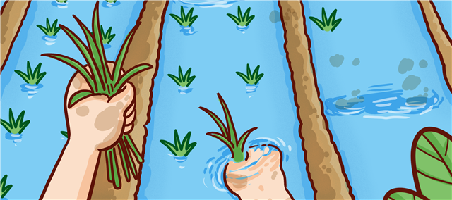 译:插秧人手里拿着秧苗,一撮一撮地插满了水田,插秧时低头就可以看到水田中倒映着蓝蓝的一望无际的天空和朵朵白云。所插的秧苗需要“根须”清净、没有腐烂,将来才能长成“稻(道)”,插秧时表面上是边插边后退,但却是一直向前的。