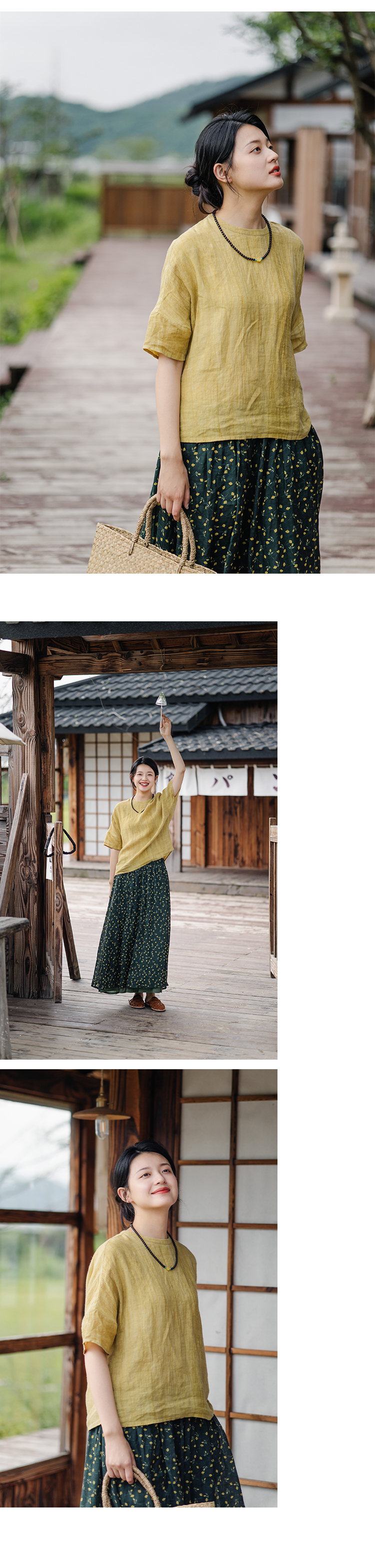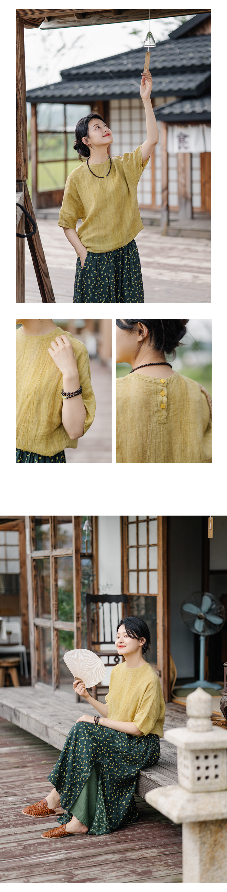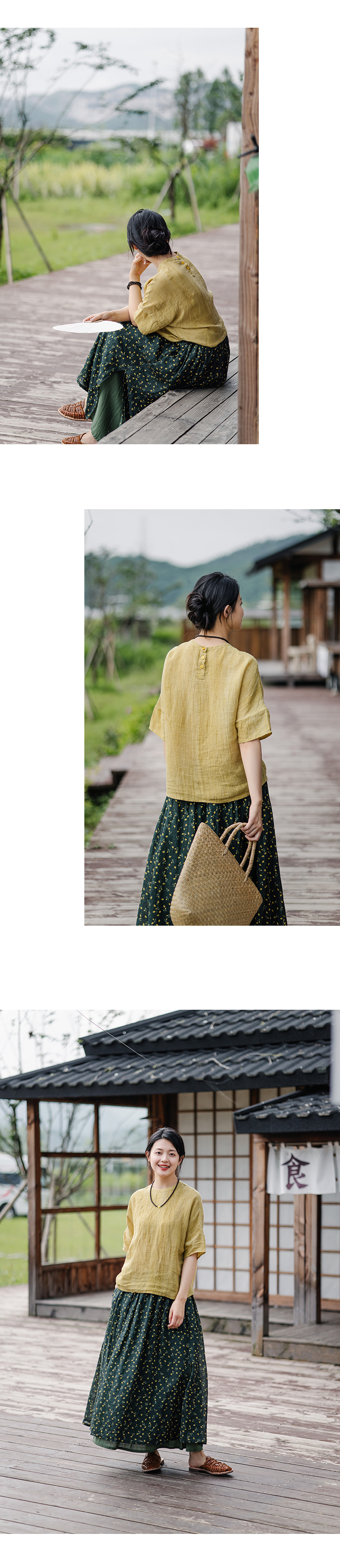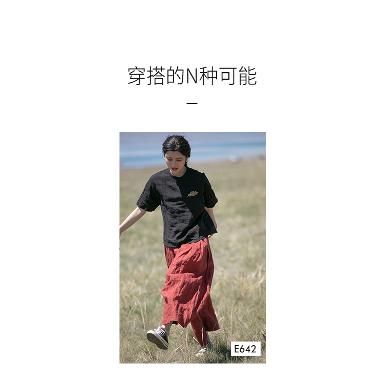 绽放346-595朵春季新款复古黑色立领短袖亚麻衬衫T恤文艺小衫上衣