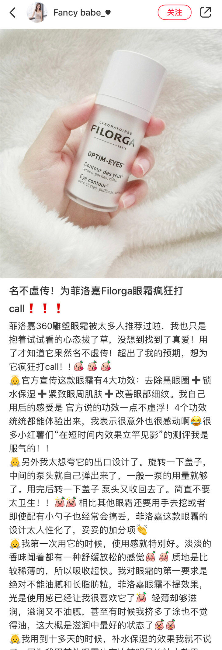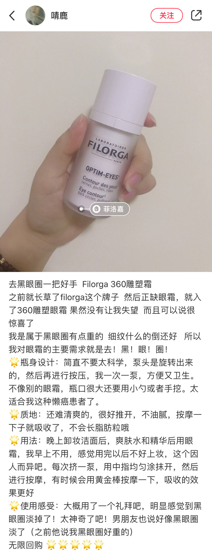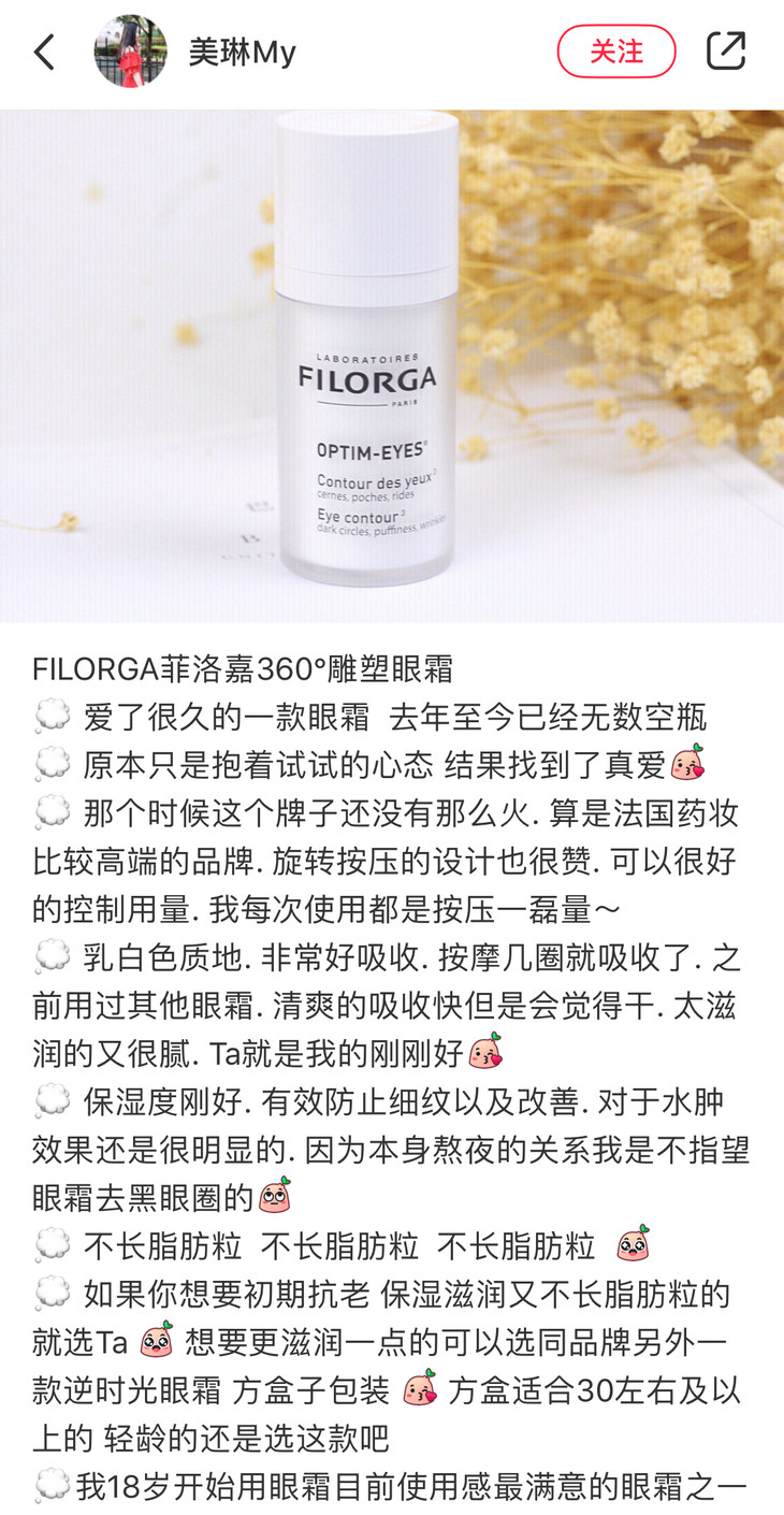 360眼霜跟逆时光眼霜不一样,不是大开口的罐装,而是跟精华晚霜一样的旋转开口,加压泵头,所以真的就很清洁干净了,不用担心扣眼霜的时候有脏东西掉进去,每次按照自己需要的量挤出绿豆大小一粒就好了。就是,有时候不太好用,会压不出来。它是乳霜的质地,但很好推开和吸收,香味就是菲洛嘉的特有香味,习惯了觉得还挺好闻的。