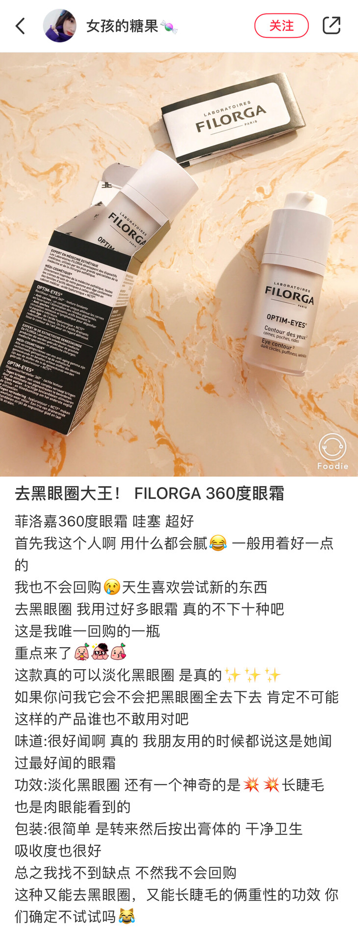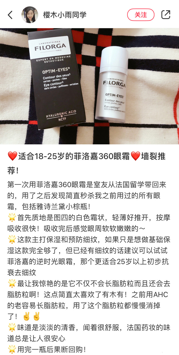 360眼霜在网上可是有别称的,江湖人称“细wen小熨斗”,能够有效dan化黑眼圈、眼袋和眼wen,也能祛除眼睛的浮肿,让眼睛变得立体。如果用别的眼霜觉得厚重的,或者皮肤本身偏油的可以试试这款,相对来说适合20-30岁的小仙女,再往上我会建议用逆时光眼霜。