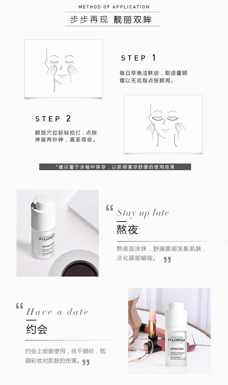 使用方法:取绿豆大小眼霜于指尖,轻微捂热眼霜后,点涂于眼周肌肤,并用指尖轻沿眼部轮廓打圈按摩