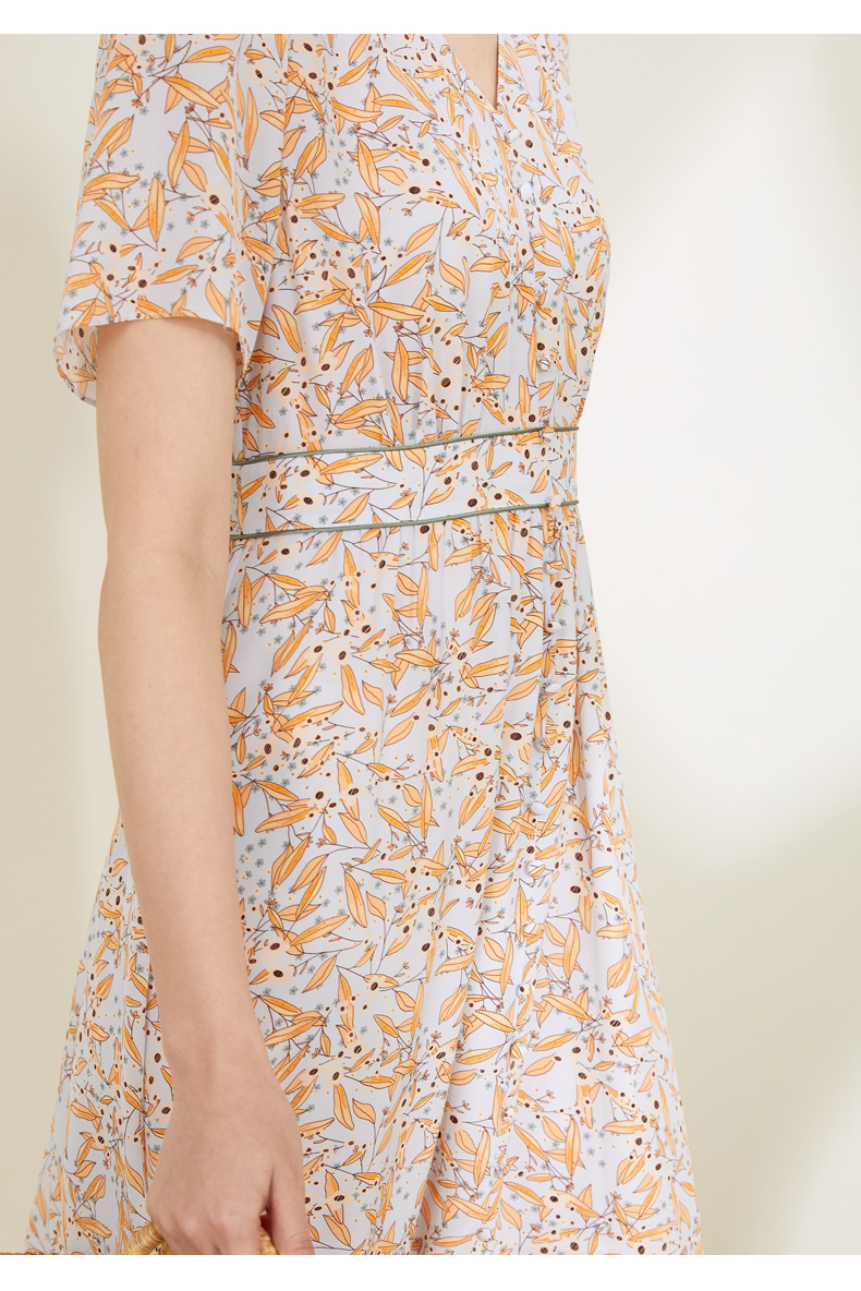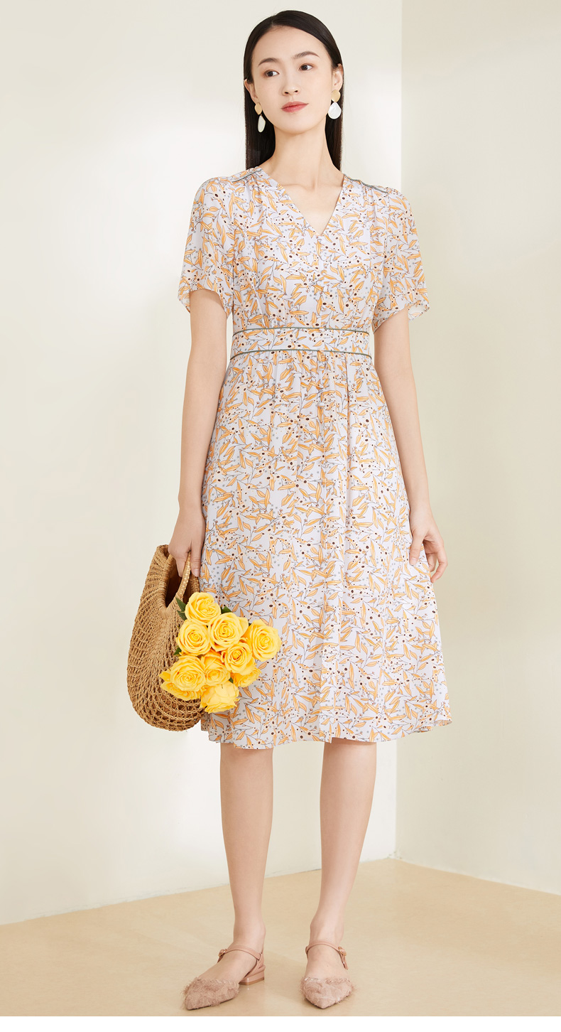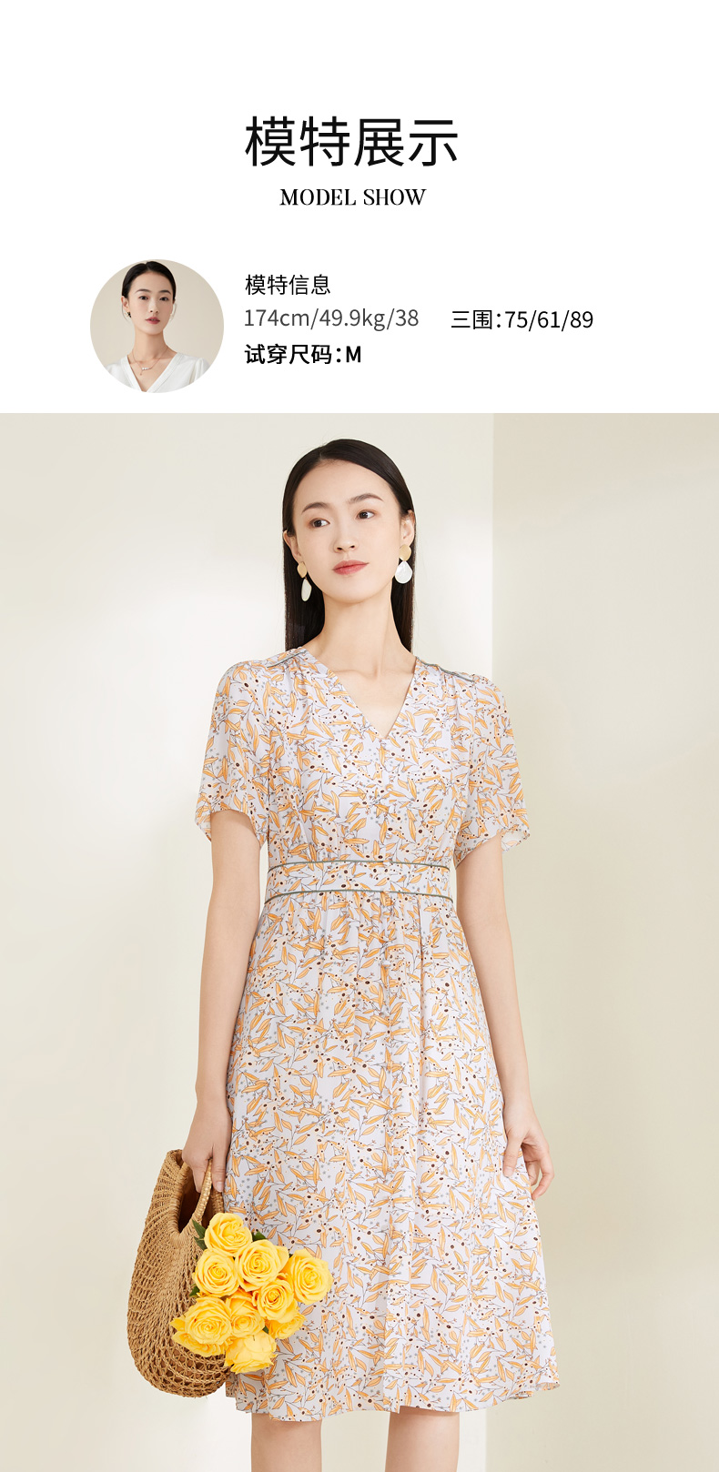 玳莎印花V领真丝连衣裙2022夏季新款优雅碎花裙温柔风中长款裙子 CB35104