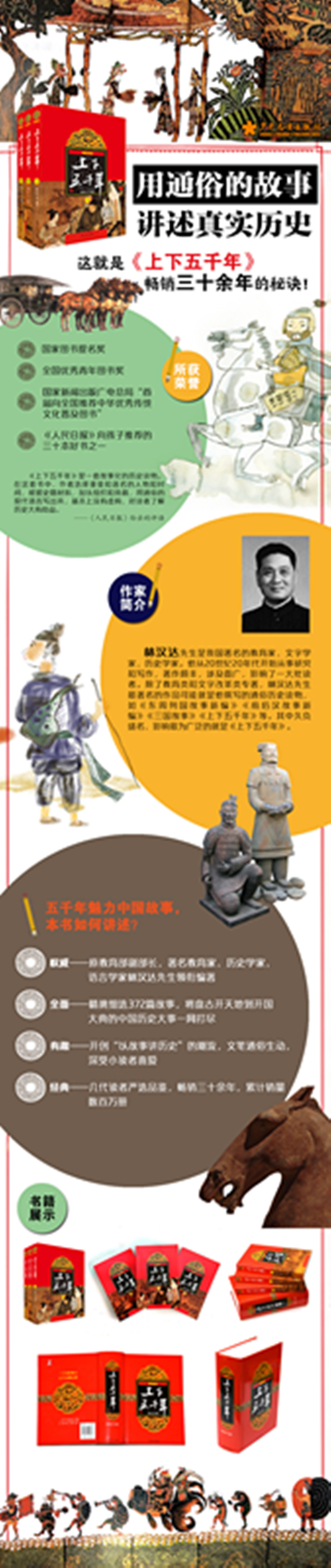 《上下五千年》是少儿社的品牌读物,影响了几代读者,今天的很多家长当年都是读着少儿社的《上下五千年》长大的,对这个品牌不但信赖,而且认同。老版《上下五千年》经历了三十余年的市场考验,销量一直长盛不衰。《**版上下五千年》尊重老版之所长,仍将延续该品牌读物以故事讲历史的经典形式,但在时间跨度上有所突破,在原先的基础上,将时间从辛亥革命拓展到新中国建立。篇目从原来的332篇,增加到370余篇。增补的内容由上海市委党史研究室研究员与复旦、同济等大学的教授执笔,以政治军事方面的历史事件为主线,兼及文化、科研、教育、艺术等领域。同时,对原有的历史大事年表也进行相应增补,并增补新的黑白插图19幅。