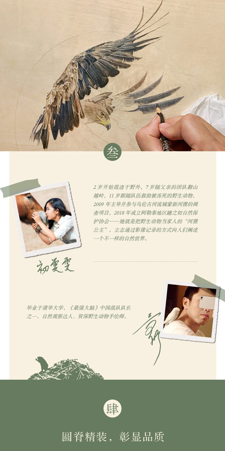 这是一本角度奇特、颇为有趣的自然摄影、自然探索类的图文书——野生动物达人、摄影师初雯雯和野生动物手绘者、观察达人“水哥”四手联弹,在由初雯雯呈现探索自然、追寻野生动物故事的同时,她的挚友王昱珩(“水哥”)则从一个自然爱好者及手绘师的角度,以批注和手绘等方式,更为完整地展现故事的内容,共同带给读者一个关于自然、摄影、观察等全新的阅读角度和阅读体验。