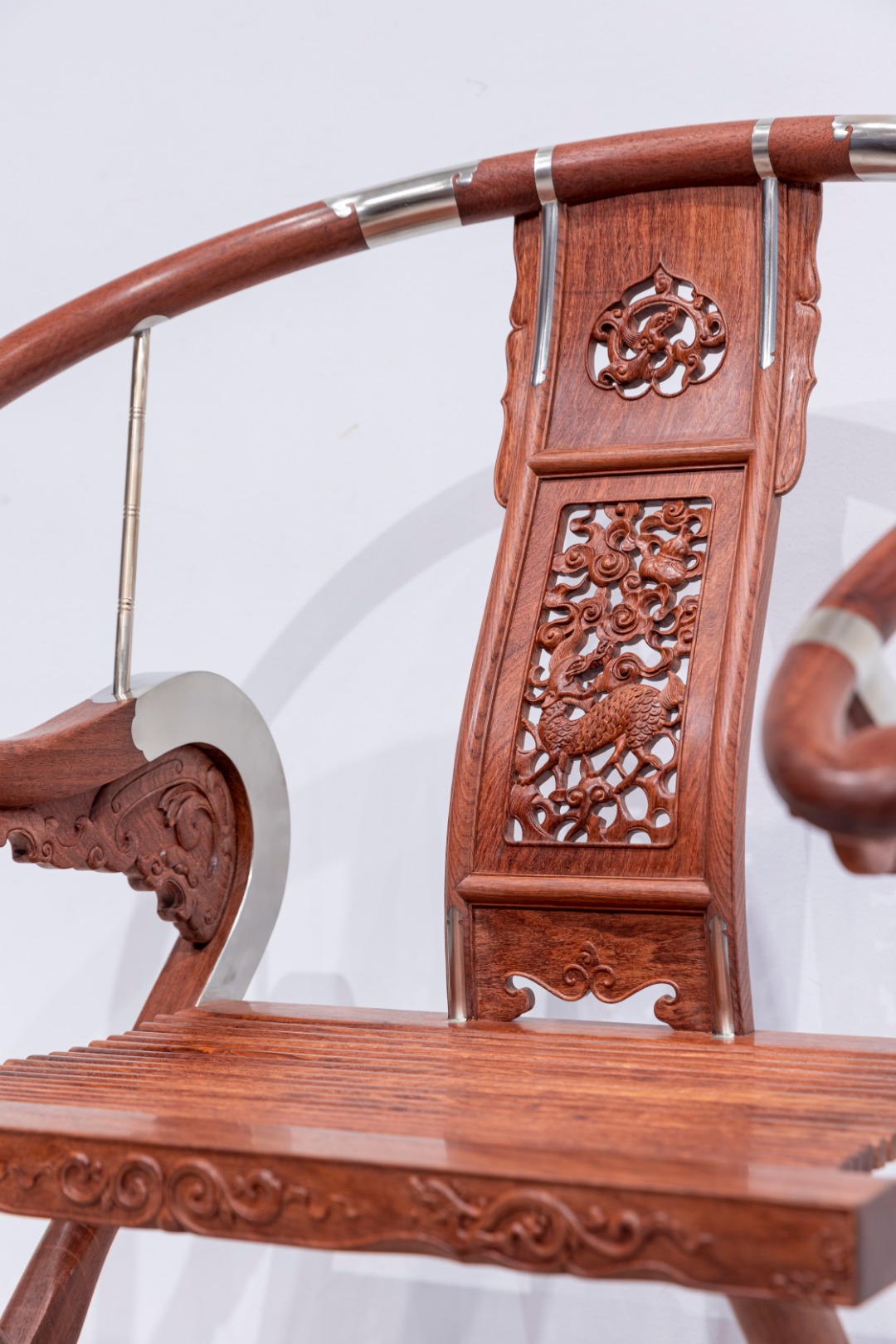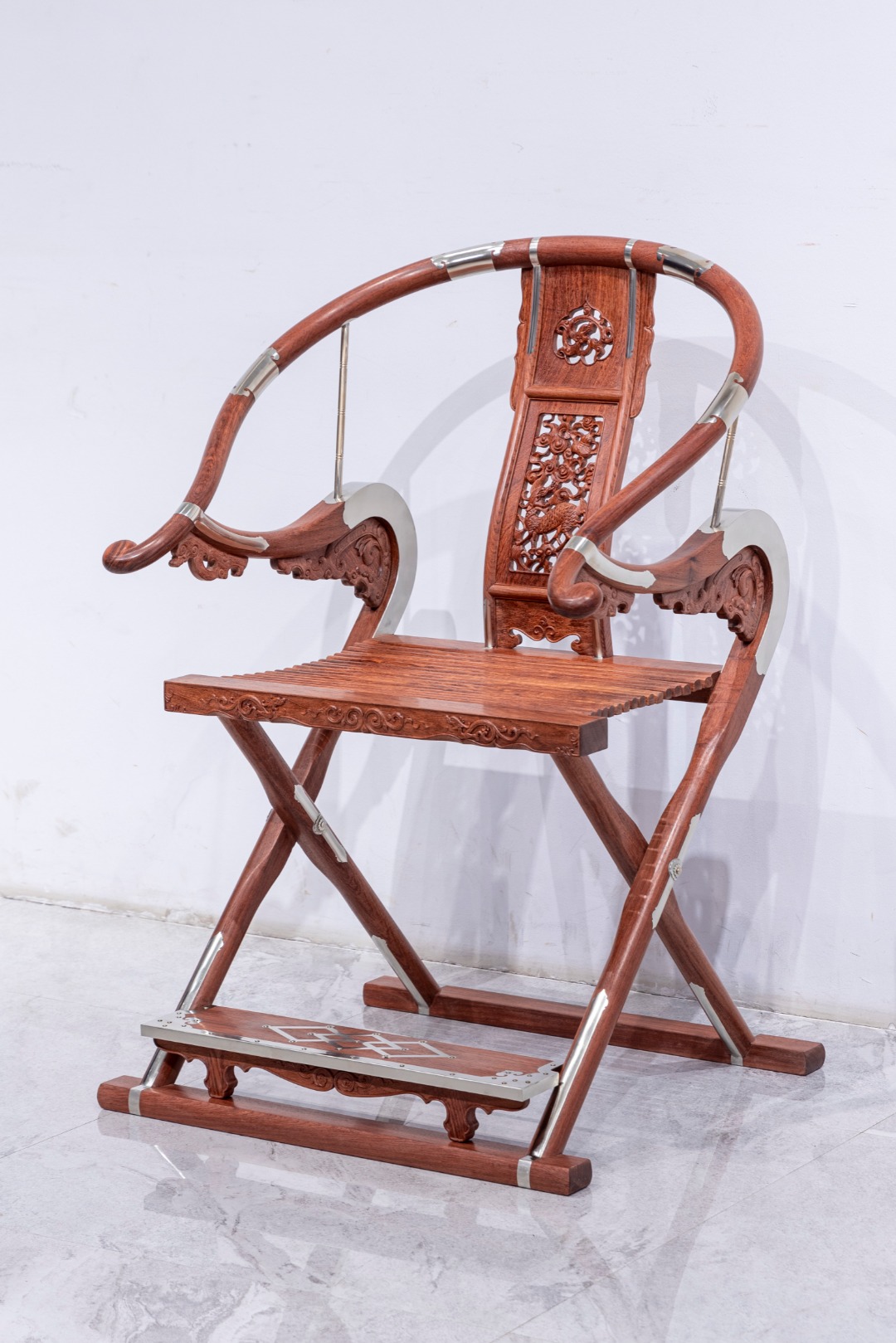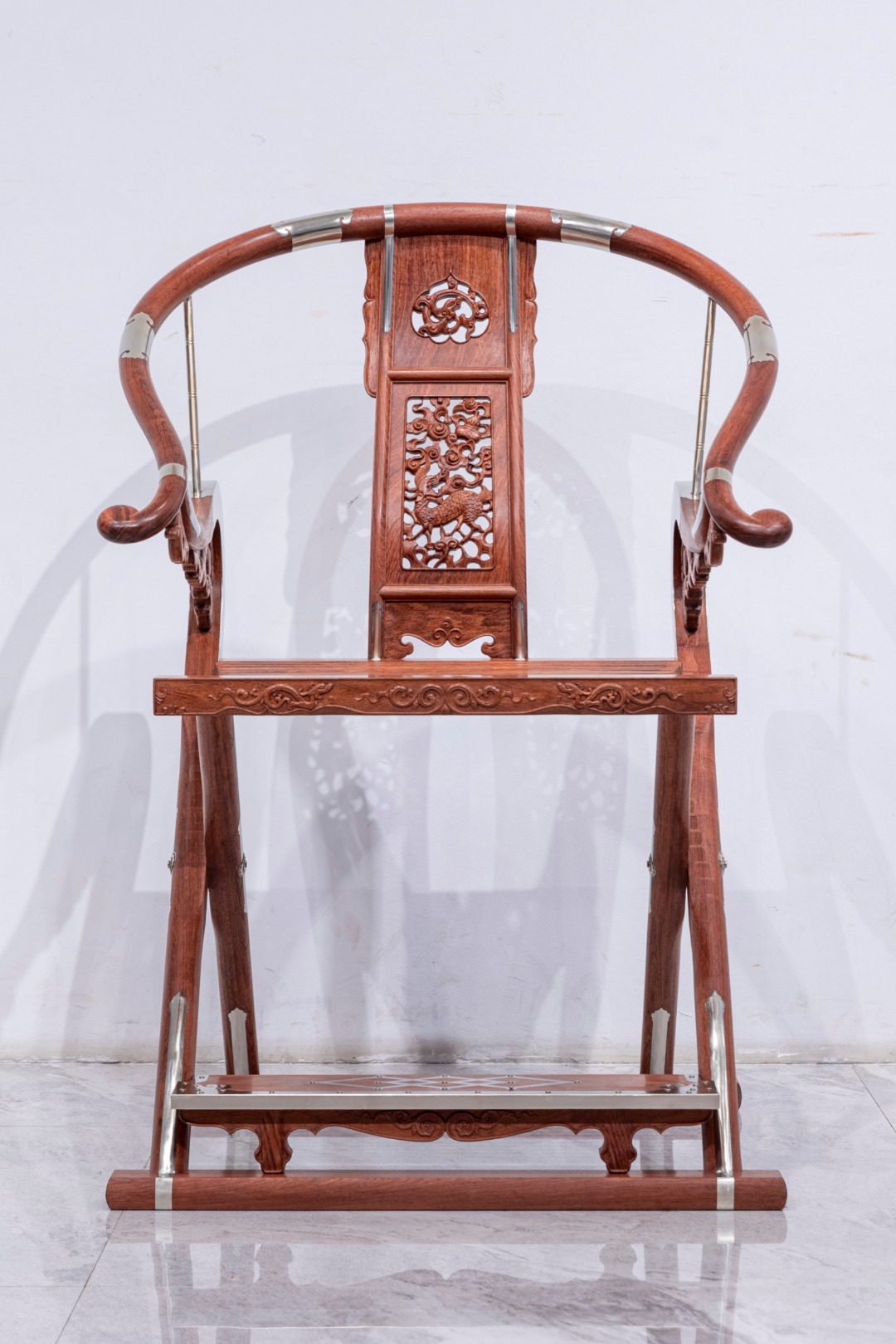 此交椅椅圈五接,并以铜活加固,两端出头回转收尾成圆钮形。三弯靠背板做双面透雕,出榫纳入扶手下方和椅盘后大边,两侧带弧形窄角牙,中央镂雕如意形开光,内雕麒麟纹,下部锼挖亮脚。三弯形的支撑构件向前探伸接入扶手出头下端,另一端结合前腿足上截,转弯处设螭龙纹牙支撑,扶手下相交处也设螭纹托角小牙子。扶手下与支撑构件转弯处装有铜竹节纹棍柱支承,上下两端带铜饰件。座面硬屉,边抹立面浮雕相向的双螭龙,中央为卷草。前后腿足皆出榫纳入足下横材,前方脚踏包铜条及如意纹包角,踏面为方胜纹。