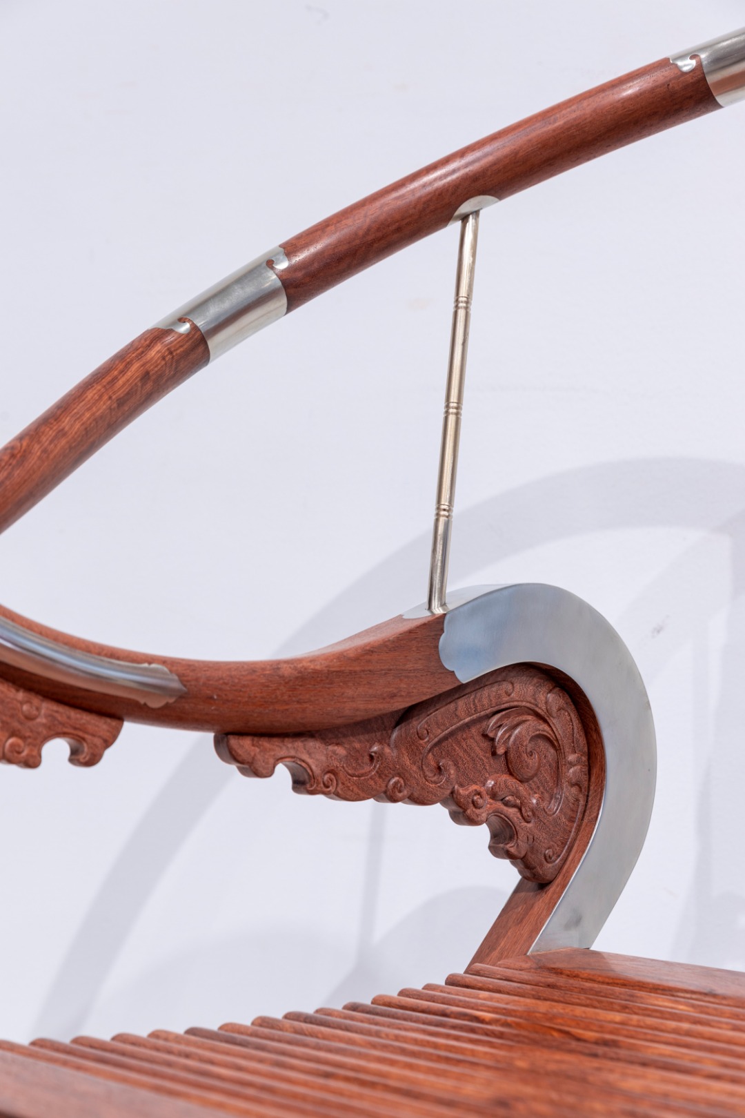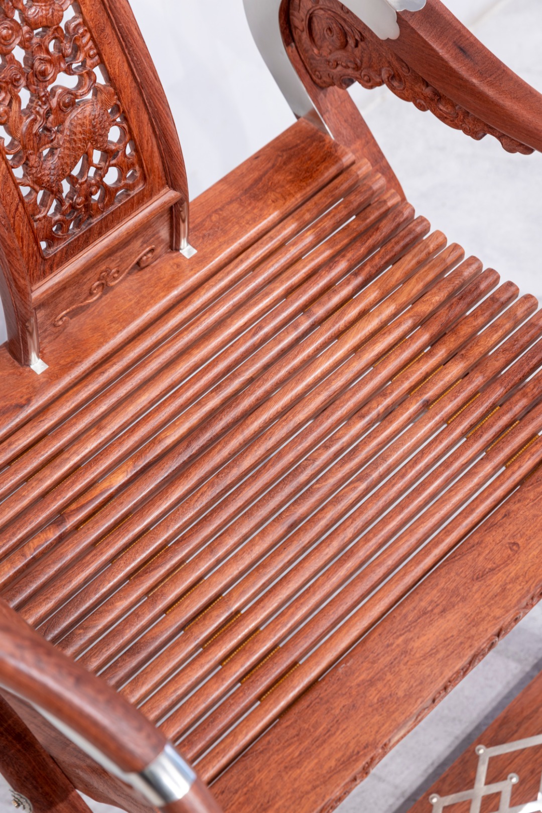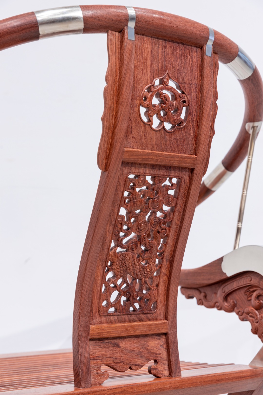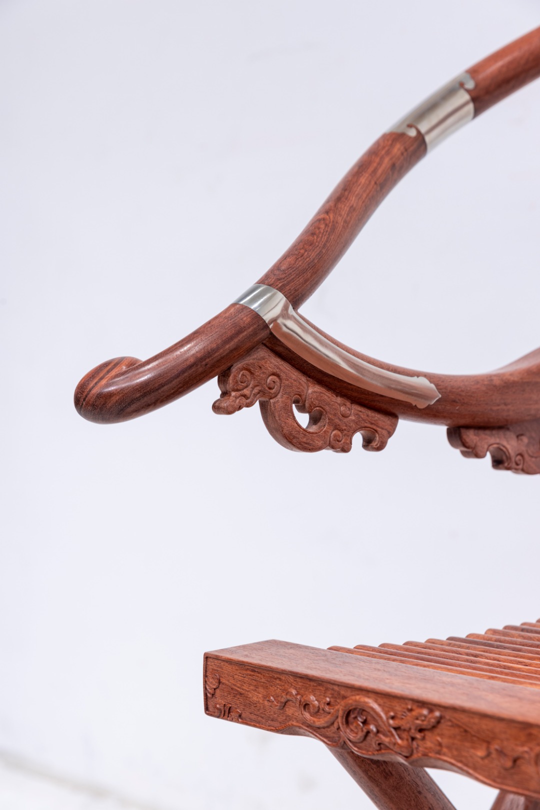 此交椅椅圈五接,并以铜活加固,两端出头回转收尾成圆钮形。三弯靠背板做双面透雕,出榫纳入扶手下方和椅盘后大边,两侧带弧形窄角牙,中央镂雕如意形开光,内雕麒麟纹,下部锼挖亮脚。三弯形的支撑构件向前探伸接入扶手出头下端,另一端结合前腿足上截,转弯处设螭龙纹牙支撑,扶手下相交处也设螭纹托角小牙子。扶手下与支撑构件转弯处装有铜竹节纹棍柱支承,上下两端带铜饰件。座面硬屉,边抹立面浮雕相向的双螭龙,中央为卷草。前后腿足皆出榫纳入足下横材,前方脚踏包铜条及如意纹包角,踏面为方胜纹。